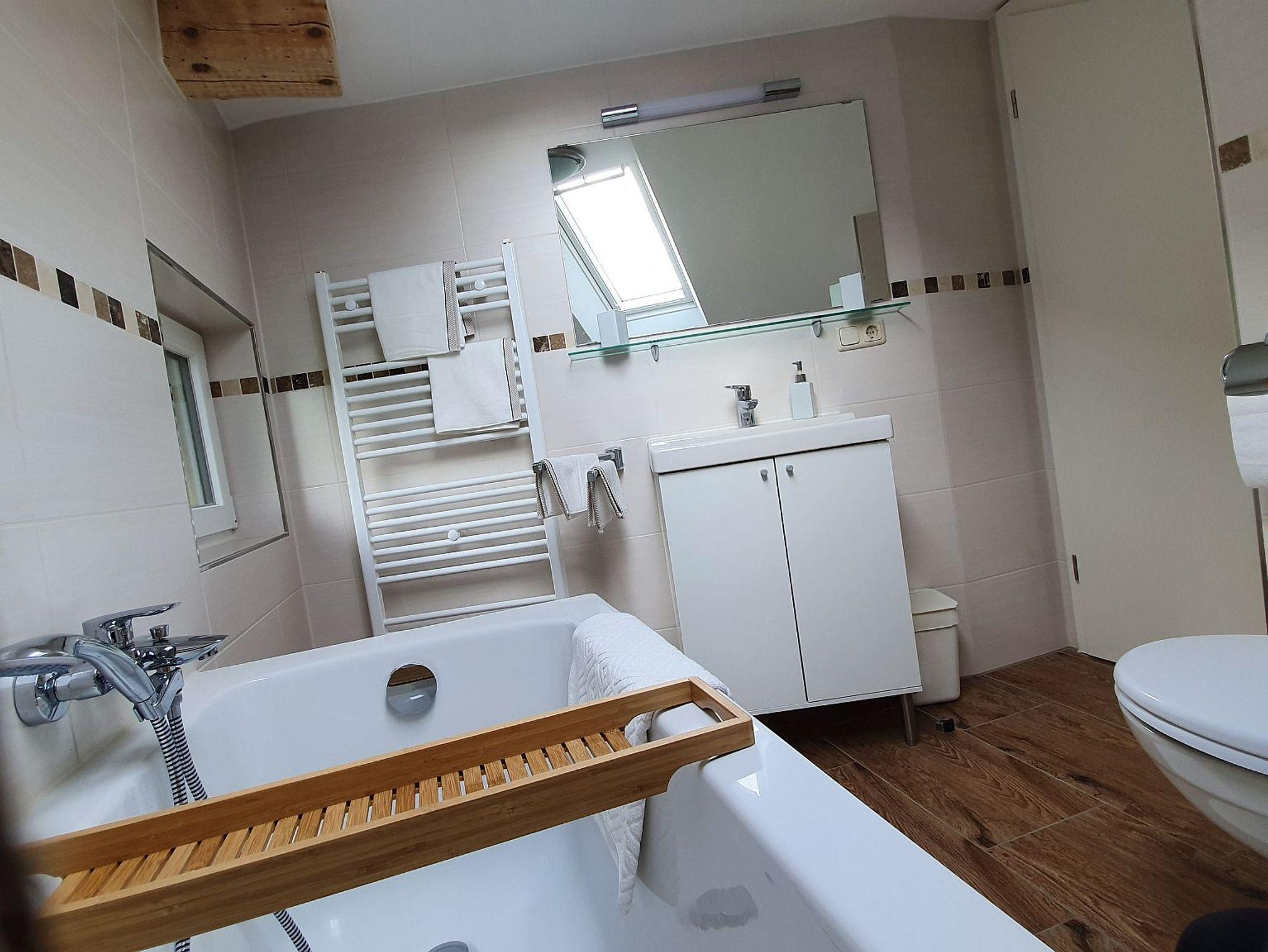 Das geschmackvolle Badezimmer beinhaltet einen Fön sowie einen Handtuchwärmer.