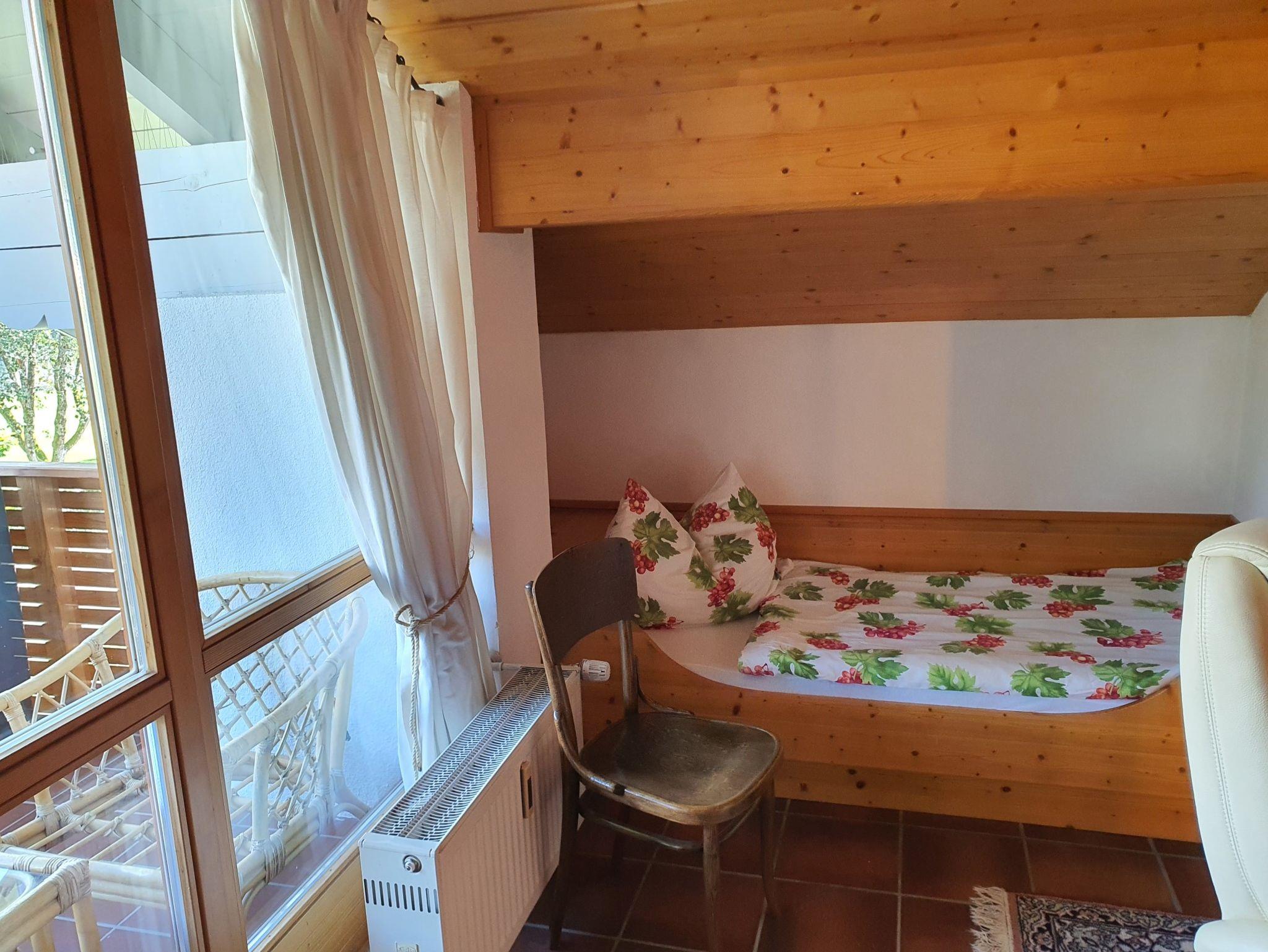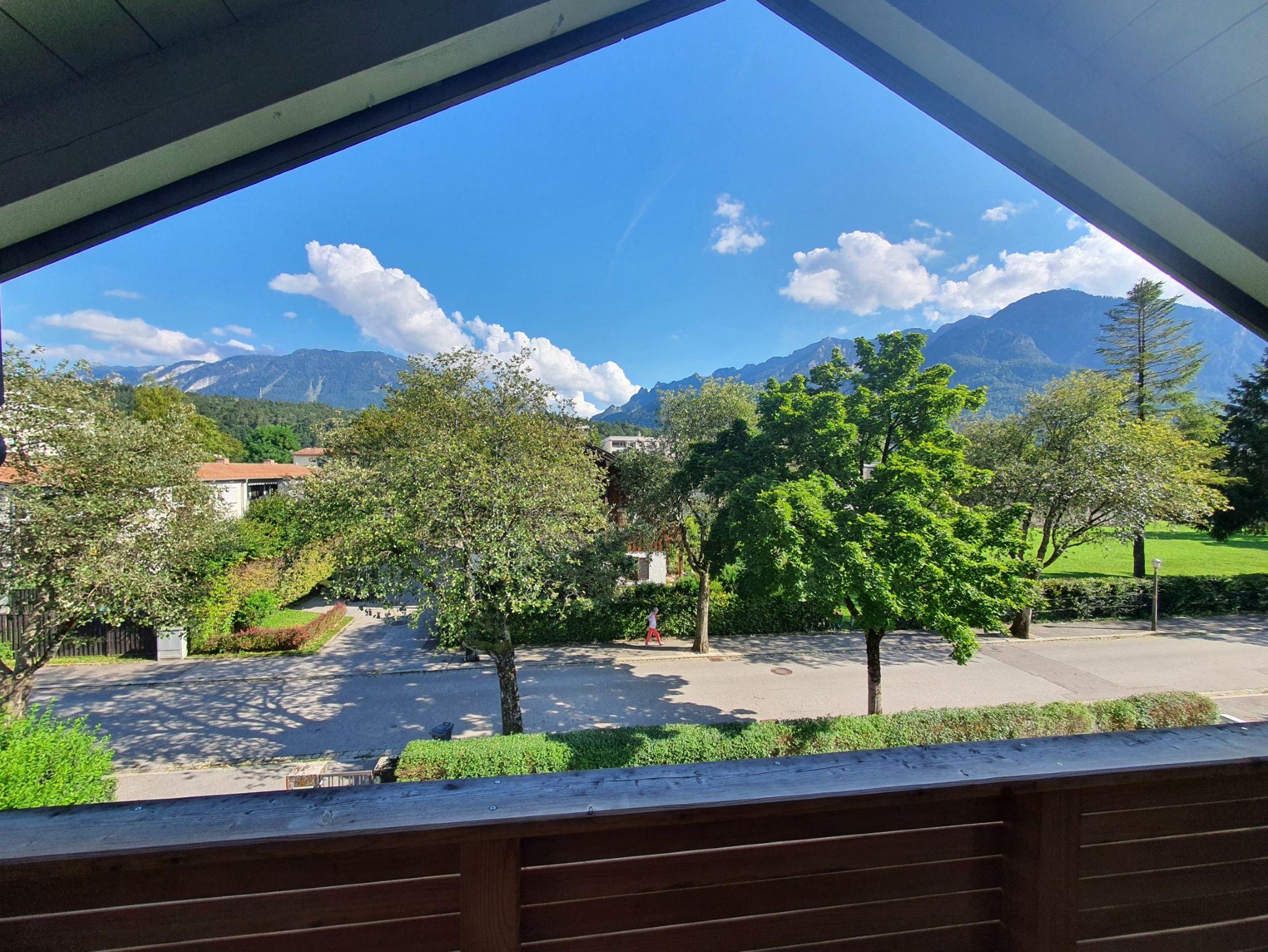 Der großzügige Balkon ist ebenfalls gefliest und verfügt über eine Holzbrüstung. Die beiden gemütlichen Rattanstühle und der Rattantisch laden dazu ein, den Blick auf den nahen Predigtstuhl samt Seilbahn und das Lattengebirge schweifen zu lassen und die Ruhe in der Umgebung zu genießen.