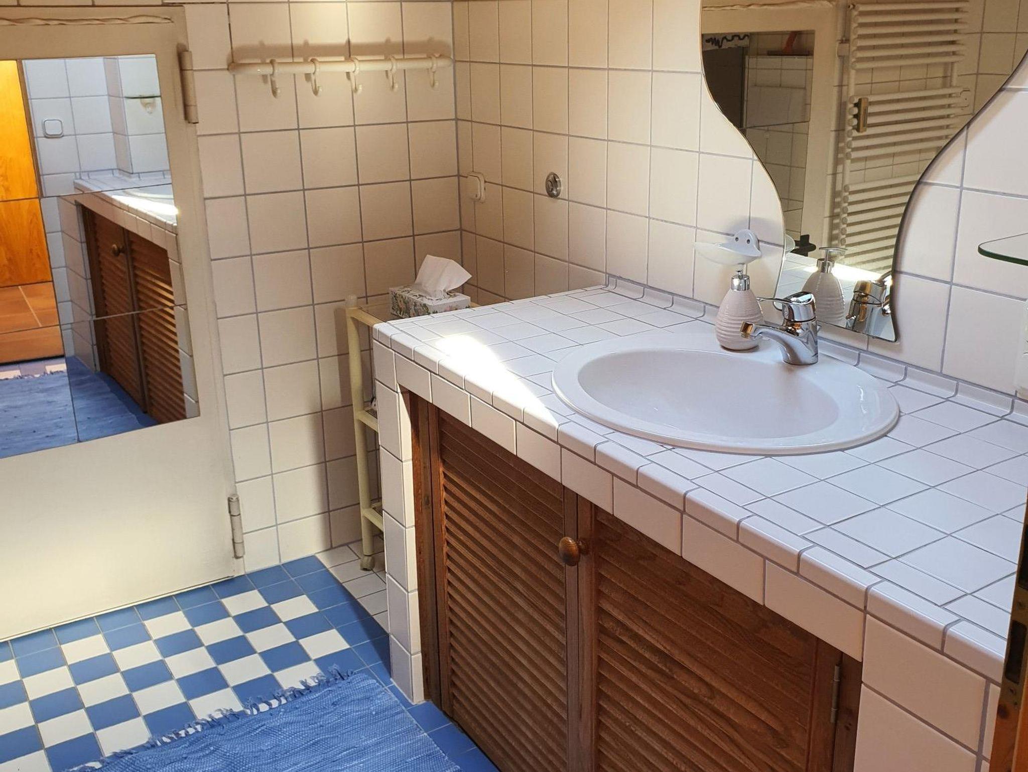 Das geräumige Badezimmer bietet eine Dusche, einen großen Waschtisch und eine Toilette. Es ist Stauraum für Ihre Toilettenartikel vorhanden und die Handtücher lassen sich auf dem Handtuchwärmer sehr gut trocknen.