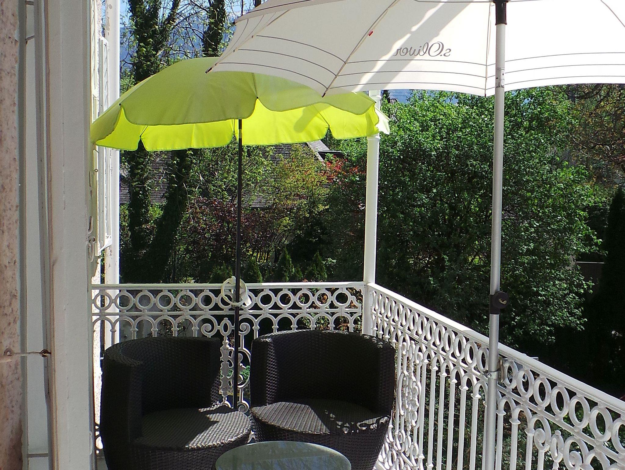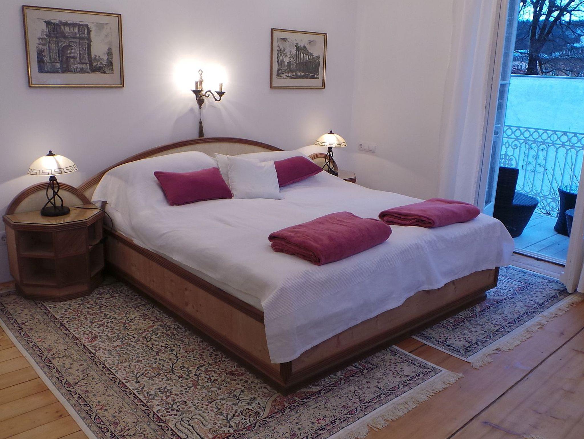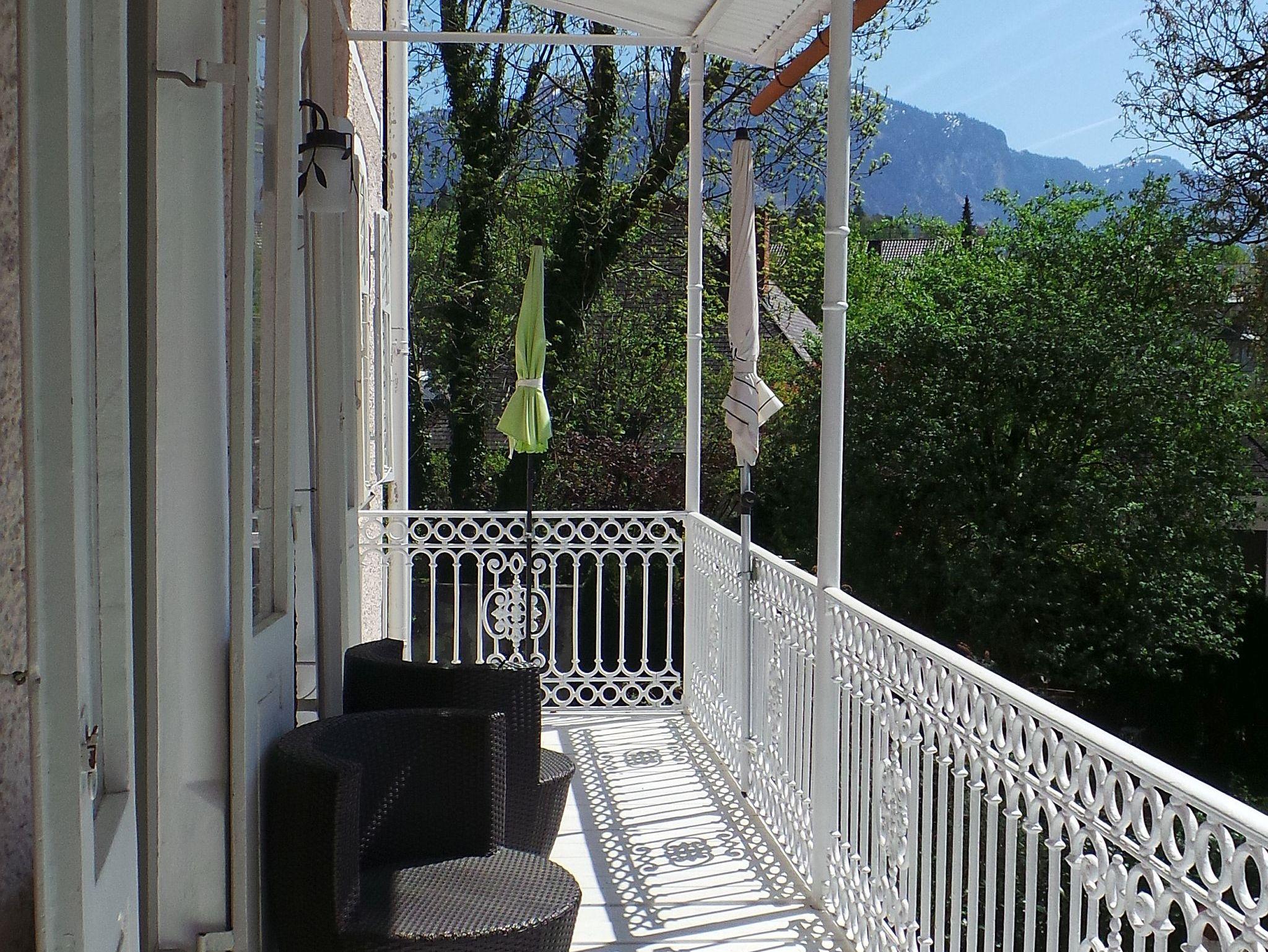 Die Ferienwohnung - TOP 2 (55 qm) mit sonnigem Ost- und Südbalkon, ist als Nichtraucherwohnung hell, freundlich und modern gestaltet, verfügt über ein Wohn/Esszimmer mit Küchenzeile und gesondertem Schlafzimmer mit Badezimmer (Du/WC). Die elegante Wohnung im 1. OG ist über eine schöne Holztreppe mit Fenster/Zwischenpodest in der Villa Bariole gut erreichbar. Sie ist ideal für 1-3 Personen. Beide Zimmer bieten Balkonzugang, sowie ein vielfältiges Beleuchtungskonzept zum Wohlfühlen. Beide Balkone mit Lounge-Sitzgruppen laden zum Verweilen ein und gewähren einen wundervollen Ausblick in den Garten mit altem Baumbestand und in die Berge der Region. Der Predigtstuhl (1.613 Höhenmeter) ist vom Südbalkon aus gut sichtbar und erhebt sich abends wie ein leuchtender Kristall über der Stadt. Das Wohn/Esszimmer mit Fenster und Balkontüre (Süd) ist charmant eingerichtet, verfügt über ein Ausziehsofa, Wohnzimmertisch mit Sitzgruppe, Wand- Flachbild-TV mit Sat-Empfang, Internet/WLAN Anschluss und ein Radio mit CD-Player. Die Küchenzeile im Wohn/Esszimmer ist gut ausgestattet, verfügt über Spüle, Geschirrspüler, Kühl-/Gefrierschrank, Magnetresonanz-Kochplatte (2 Kochfelder) mit zugehörigem Kochgeschirr und Dunstabzug, Mikrowellenherd, Kaffeefilterautomat, Toaster, Wasserkocher, Besteck, Gläser und allen anderen relevanten Dingen. Frisches Gebäck können die Gäste in einer nahegelegenen Bäckerei fußläufig besorgen. Das Schlafzimmer mit Fenster und 2 Balkontüren (Ost und Süd) beinhaltet eine Essecke mit rundem Tisch, Schreibtisch mit großem Flachbild-TV mit Sat-Empfang, Internet/WLAN Anschluss, Doppelbett mit Komfortmatratzen, 2 Nachtkästchen, Radiowecker, Kleiderkasten, sowie ein Badezimmer (Du/WC).