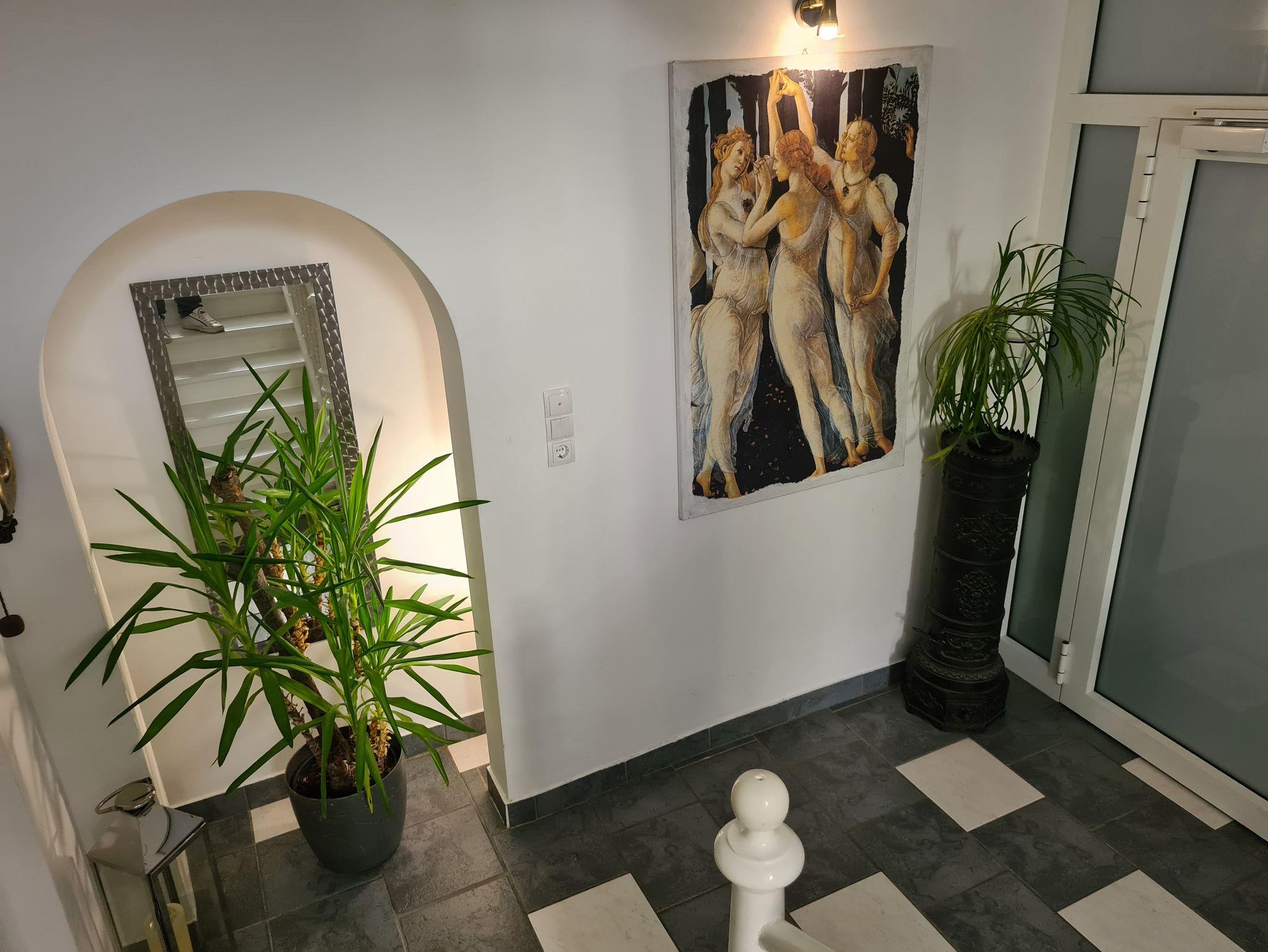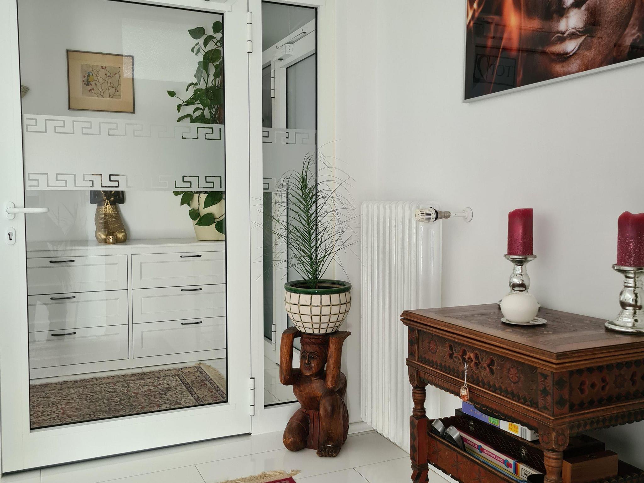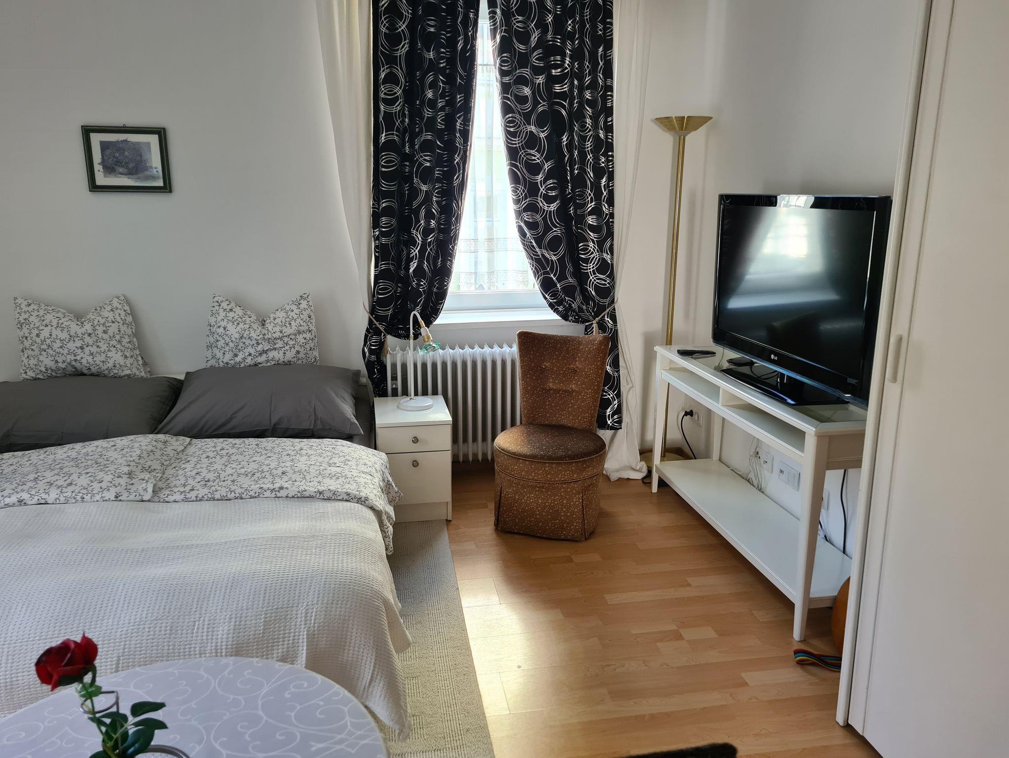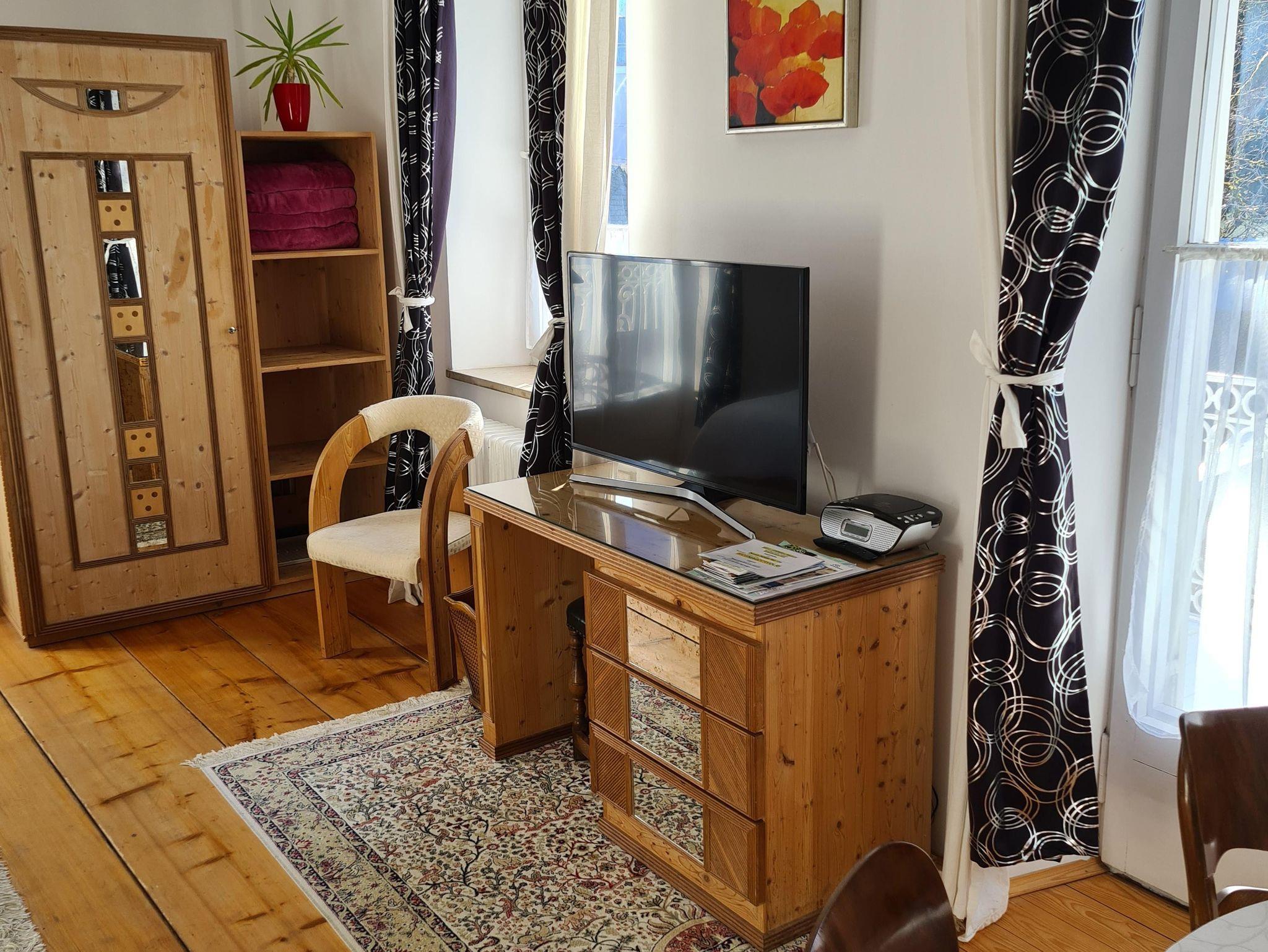 Die Ferienwohnung - TOP 2 (55 qm) mit sonnigem Ost- und Südbalkon, ist als Nichtraucherwohnung hell, freundlich und modern gestaltet, verfügt über ein Wohn/Esszimmer mit Küchenzeile und gesondertem Schlafzimmer mit Badezimmer (Du/WC). Die elegante Wohnung im 1. OG ist über eine schöne Holztreppe mit Fenster/Zwischenpodest in der Villa Bariole gut erreichbar. Sie ist ideal für 1-3 Personen. Beide Zimmer bieten Balkonzugang, sowie ein vielfältiges Beleuchtungskonzept zum Wohlfühlen. Beide Balkone mit Lounge-Sitzgruppen laden zum Verweilen ein und gewähren einen wundervollen Ausblick in den Garten mit altem Baumbestand und in die Berge der Region. Der Predigtstuhl (1.613 Höhenmeter) ist vom Südbalkon aus gut sichtbar und erhebt sich abends wie ein leuchtender Kristall über der Stadt. Das Wohn/Esszimmer mit Fenster und Balkontüre (Süd) ist charmant eingerichtet, verfügt über ein Ausziehsofa, Wohnzimmertisch mit Sitzgruppe, Wand- Flachbild-TV mit Sat-Empfang, Internet/WLAN Anschluss und ein Radio mit CD-Player. Die Küchenzeile im Wohn/Esszimmer ist gut ausgestattet, verfügt über Spüle, Geschirrspüler, Kühl-/Gefrierschrank, Magnetresonanz-Kochplatte (2 Kochfelder) mit zugehörigem Kochgeschirr und Dunstabzug, Mikrowellenherd, Kaffeefilterautomat, Toaster, Wasserkocher, Besteck, Gläser und allen anderen relevanten Dingen. Frisches Gebäck können die Gäste in einer nahegelegenen Bäckerei fußläufig besorgen. Das Schlafzimmer mit Fenster und 2 Balkontüren (Ost und Süd) beinhaltet eine Essecke mit rundem Tisch, Schreibtisch mit großem Flachbild-TV mit Sat-Empfang, Internet/WLAN Anschluss, Doppelbett mit Komfortmatratzen, 2 Nachtkästchen, Radiowecker, Kleiderkasten, sowie ein Badezimmer (Du/WC).