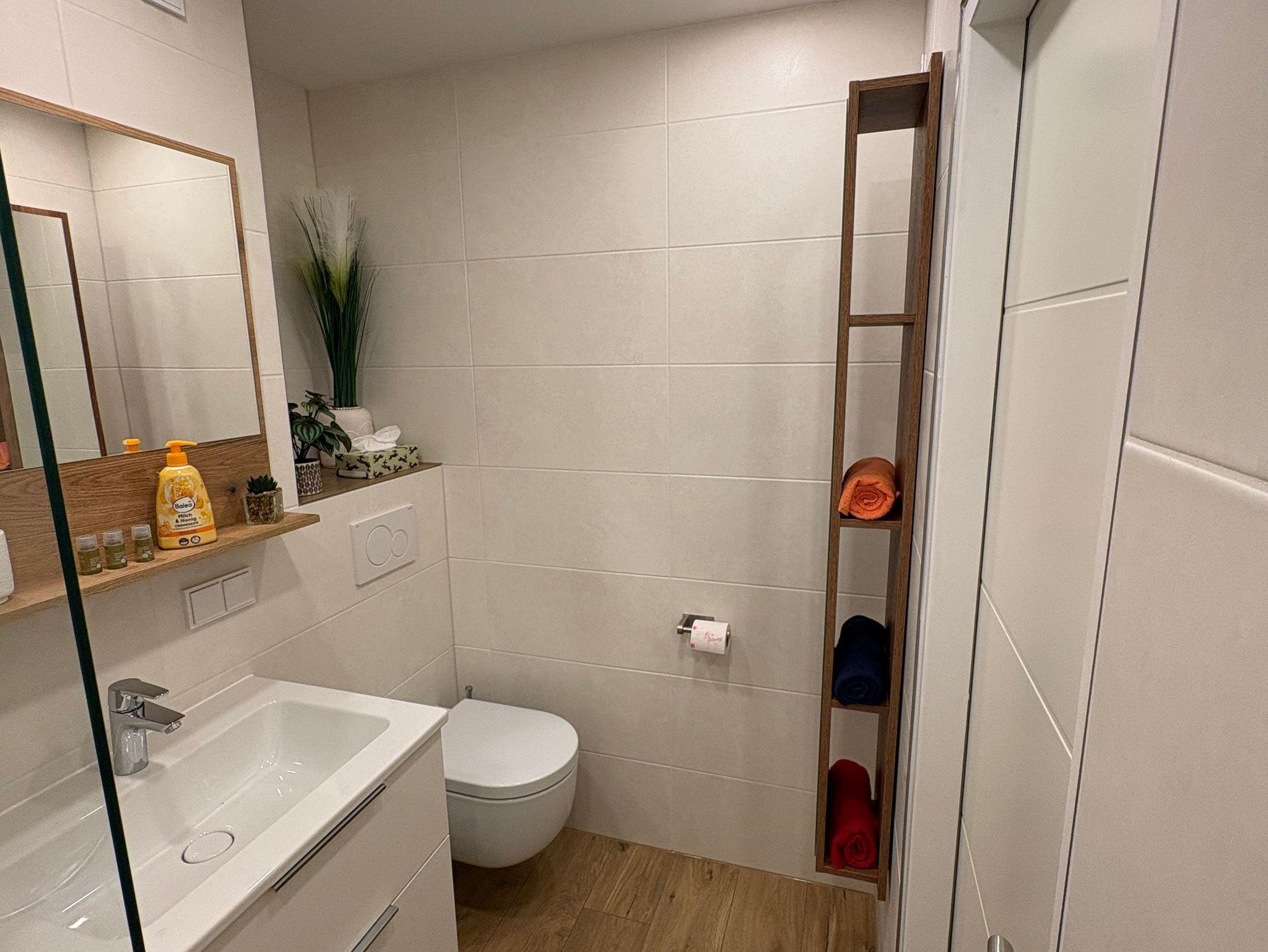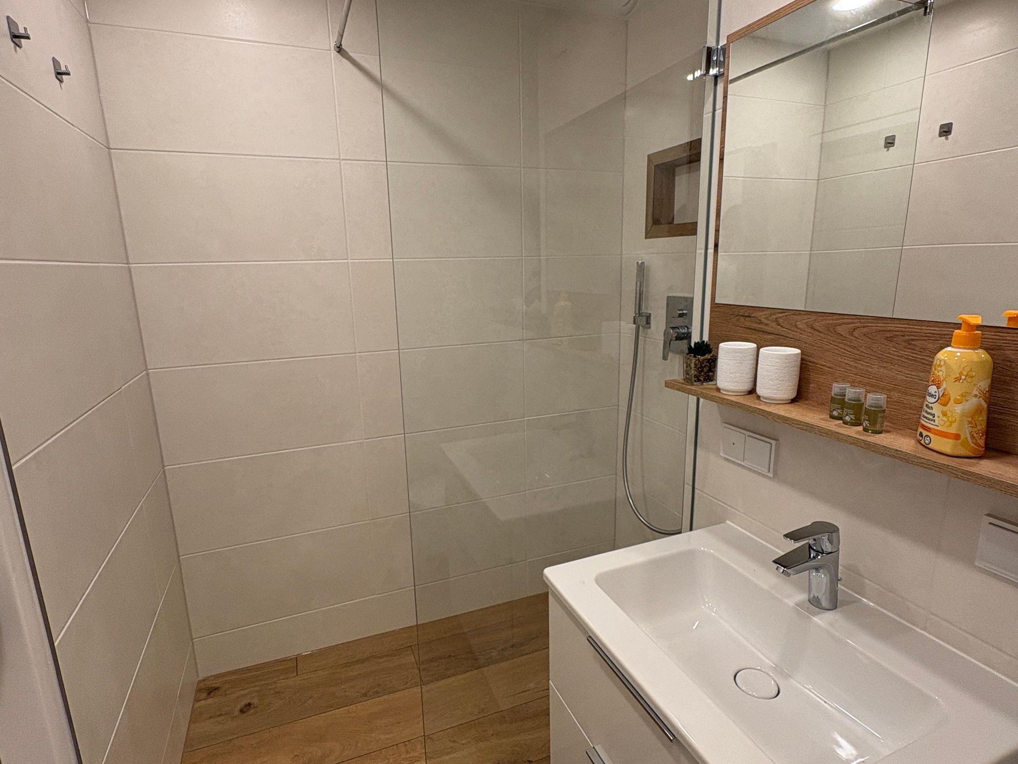 Das helle Bad verfügt über eine Dusche mit Regendusche.