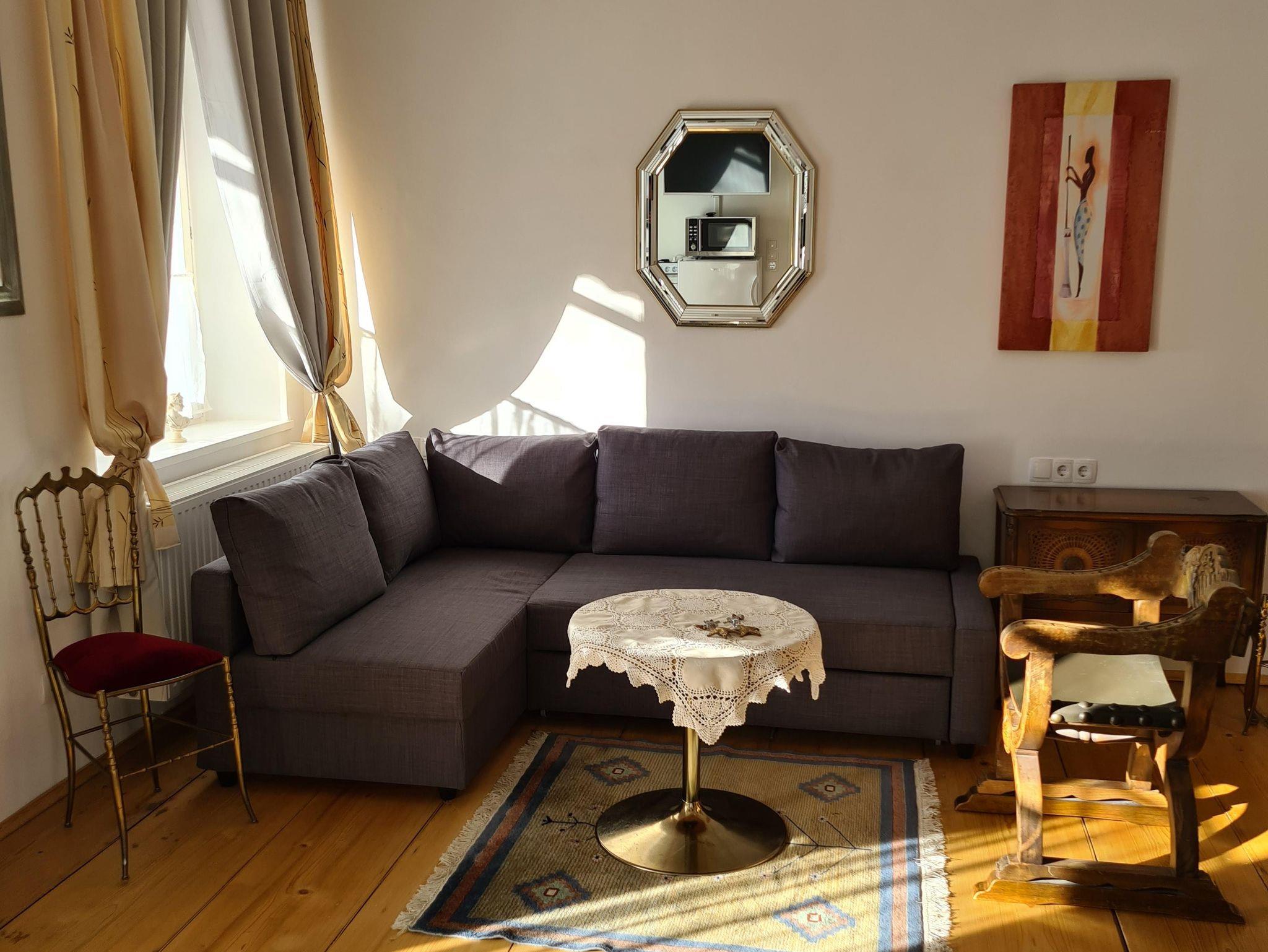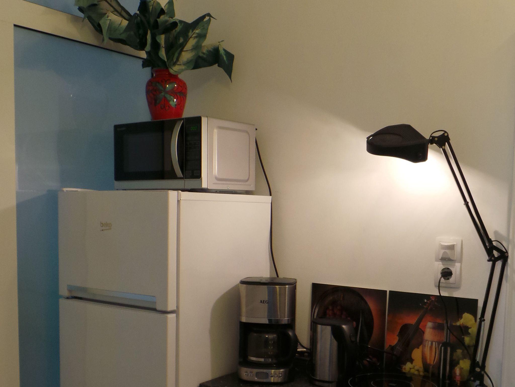 Die Miniküche ist gut ausgestattet, verfügt über eine kleine Spüle, großem Kühlschrank mit Gefrierfach, Magnetresonanz-Kochplatte mit 2 Kochfelder mit zugehörigem Kochgeschirr, Mikrowelle, Kaffeefilterautomat, Toaster, Wasserkocher, Besteck, Gläser und allen anderen relevanten Dingen. Die Kochgelegenheit beschränkt sich jedoch auf Grund der kleinen Arbeitsflächen eher auf die Zubereitung von „Schnellgerichten“ und ist für „Kochaktionen größerer Familien“ nur bedingt geeignet! Frisches Gebäck können die Gäste in einer nahegelegenen Bäckerei fußläufig besorgen.