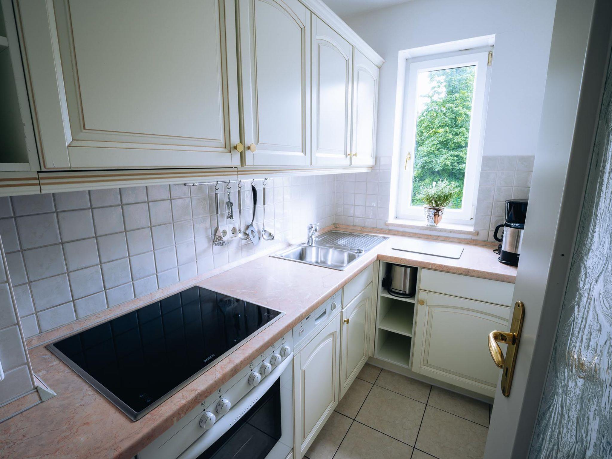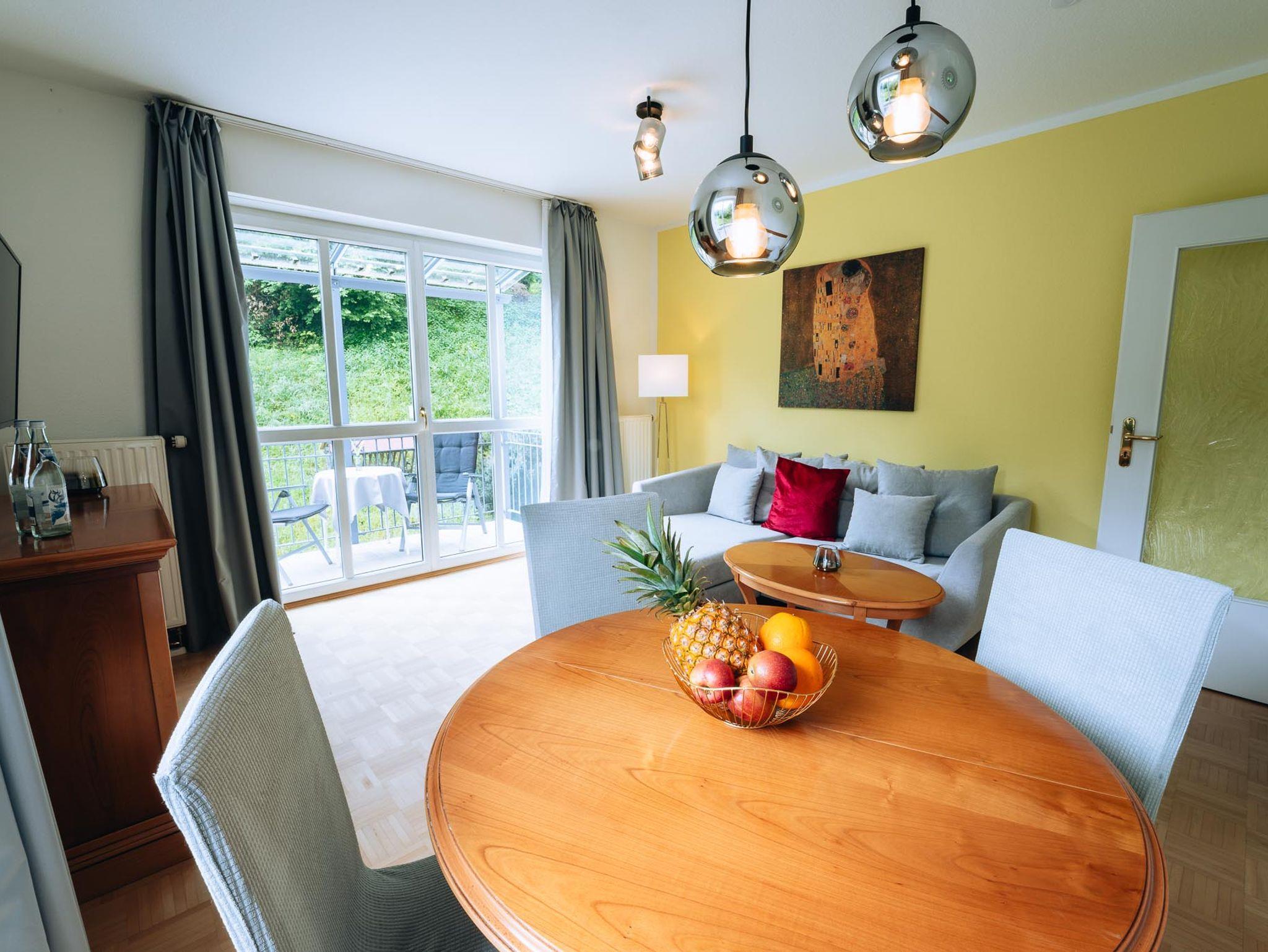 Unser schönes, gemütliches Appartement ist im klassisch- eleganten Stil eingerichtet. Die Wohnung befindet sich im 1. OG und verfügt über ein separates Schlafzimmer mit einem Doppelbett (1,80 x 2,00 - Boxspringmatratzen), ein Wohnzimmer mit Essecke, eine voll ausgestattete Küche mit Geschirrspüler, sowie ein Bad mit Dusche/WC. Von Ihrem Balkon (Ostseite) aus können Sie den Blick in die Natur genießen, wo sie mit etwas Glück manchmal Rehe oder Hasen beobachten können.