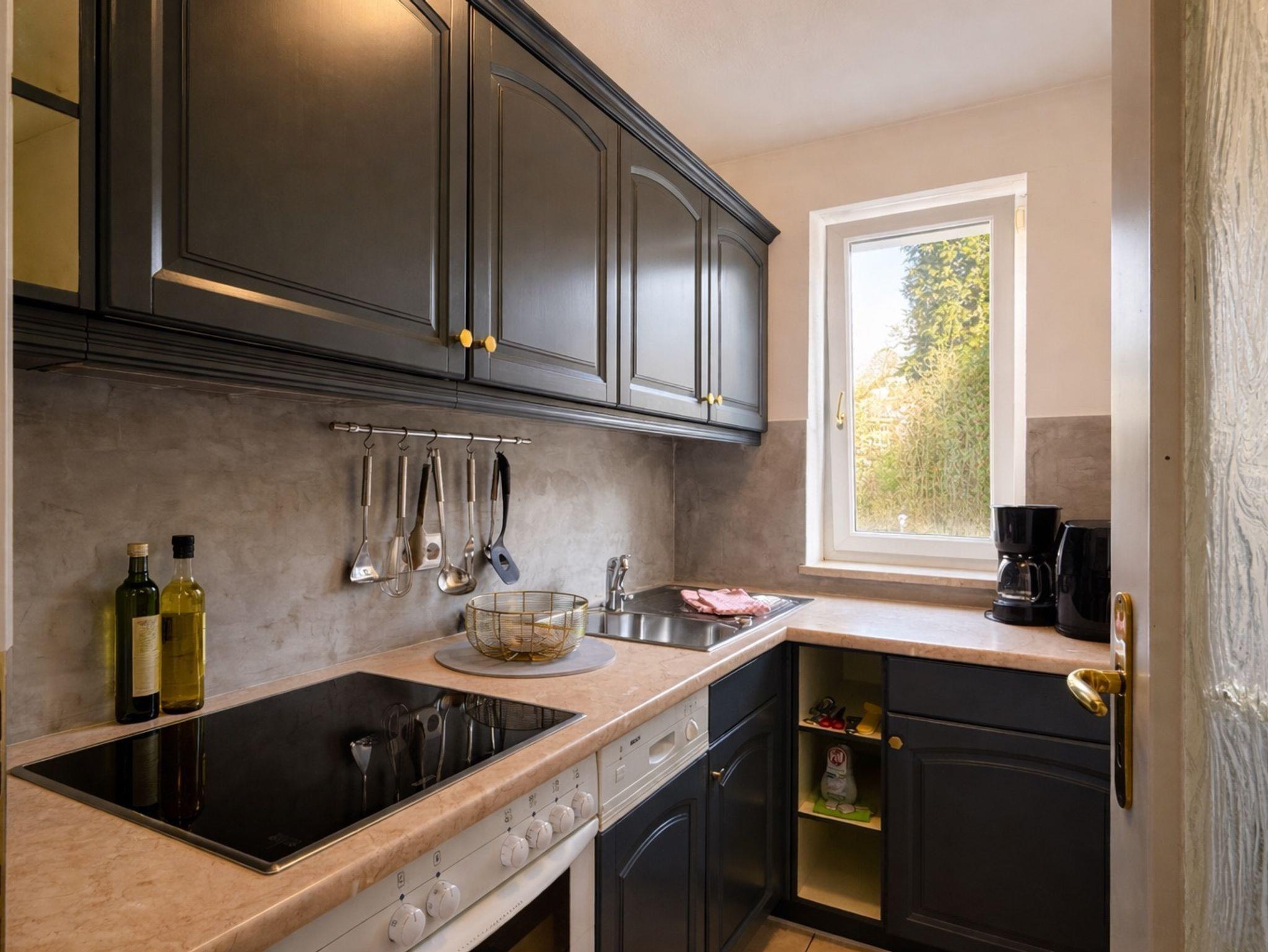 Unser schönes, gemütliches Apartment ist im klassisch- eleganten Stil eingerichtet. Die Wohnung befindet sich im 1. OG und verfügt über ein separates Schlafzimmer mit einem Doppelbett (1,80 x 2,00 - Boxspringmatratzen), ein Wohnzimmer mit Essecke, eine voll ausgestattete Küche mit Geschirrspüler, sowie ein Bad mit Dusche/WC. Von Ihrem Balkon (Ostseite) aus können Sie den Blick in die Natur genießen, wo sie mit etwas Glück manchmal Rehe oder Hasen beobachten können.