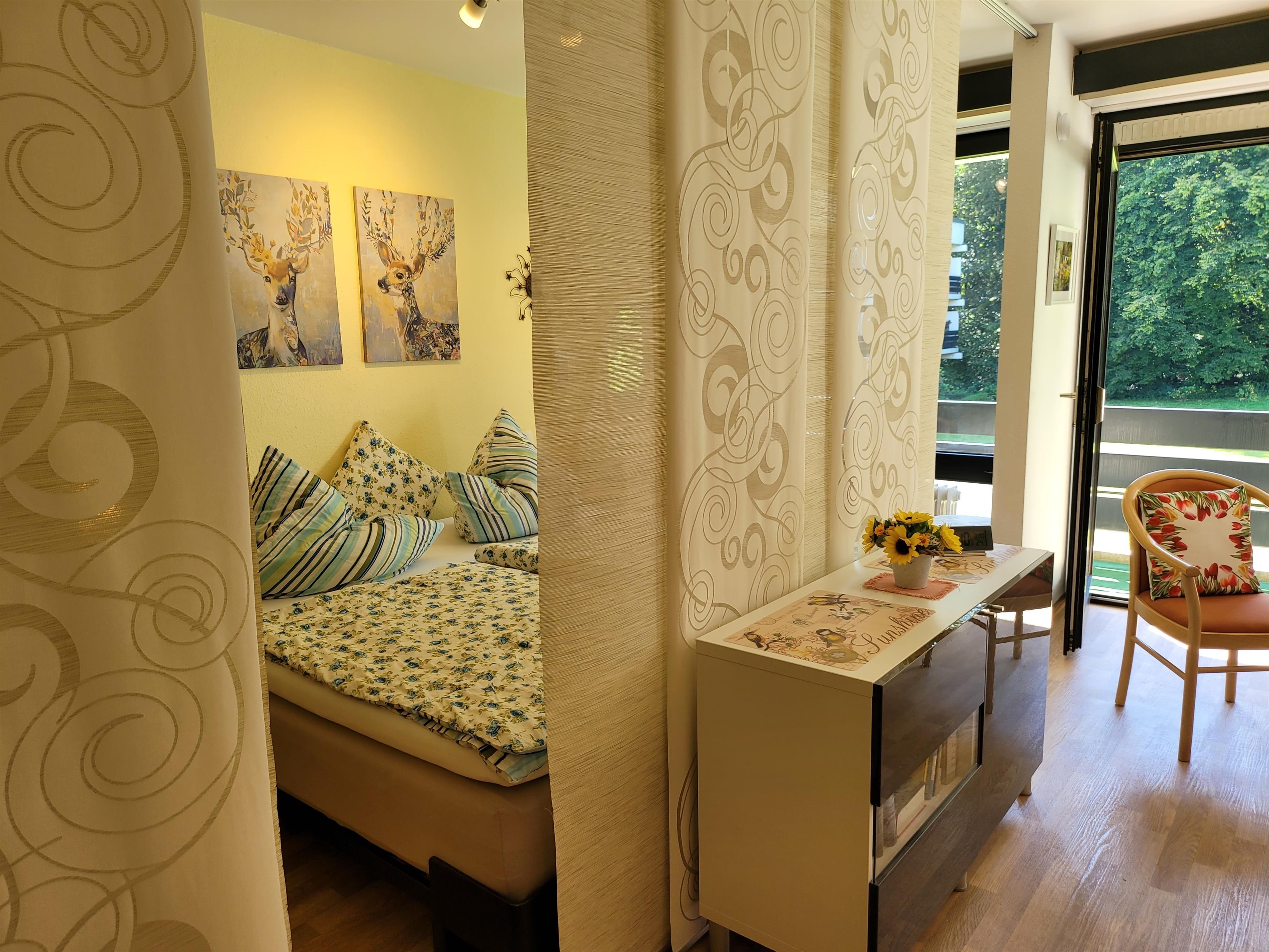Geradeaus erreicht man das Wohnzimmer mit gemütlicher moderner Essecke und einer Schlafcouch (z. B. für Kinder). Vom Wohnzimmer ist das Schlafzimmer durch Schiebegardinen abgeteilt. Der linke Durchgang führt zur linken Bettseite und zum Kleiderschrank. Durch den rechten Durchgang gelangt man zur rechten Bettseite und kleinen Schmink- oder Schreibtisch am Fenster.