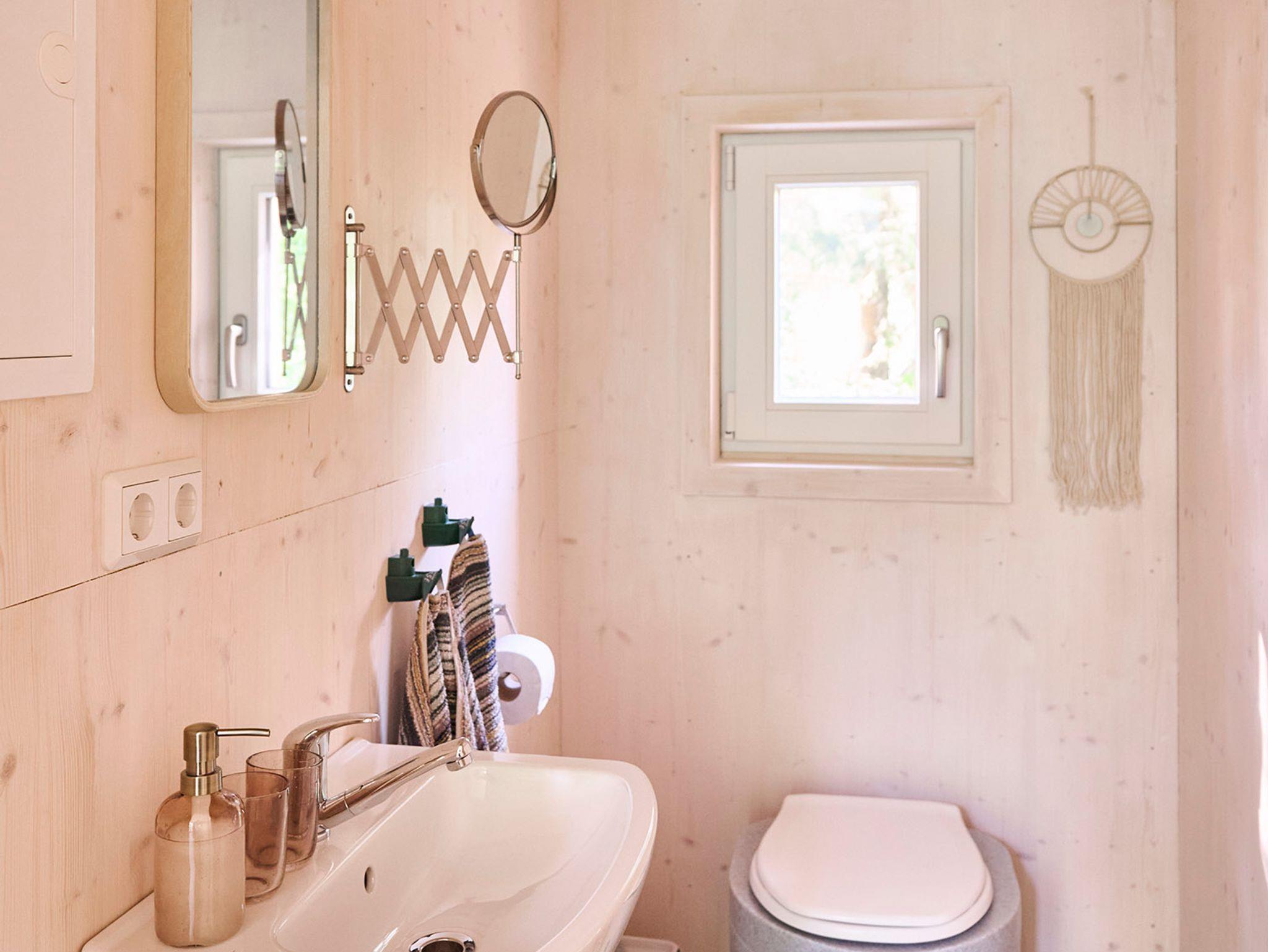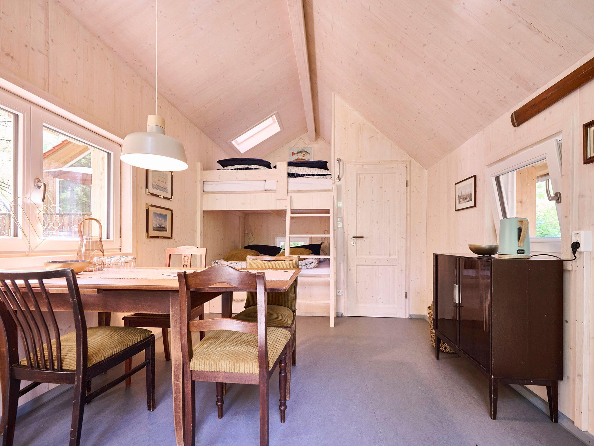 Unser schönes Stelzenhaus ist mit antiken Möbeln eingerichtet und im maritimen Style gehalten. Es gibt zwei Doppelbetten übereinander, die mit guten Matratzen ausgestattet sind. Ein Tisch mit 4 Stühlen ermöglicht auch bei kühlem und regnerischen Wetter zu essen, zu spielen und sich aufzuhalten. Mit dem großen Panoramafenster hat man immer den Blick in den Wald. Es ist ein Bad mit Trockentoilette und Waschbecken vorhanden. Zum Duschen kann man in den Sanitärblock oder direkt ins Waldbad, Eintritt zum Waldbad ist im Preis enthalten. Die Terasse lädt bei schönem Wetter zum Verweilen ein. Auf Anfrage gibt es auch ein Reisebettchen und einen Hochstuhl dazu.Wasserkocher für Tee und Kaffee, Lesestoff und Spiele stehen zur Verfügung und wenn es kalt wird wärmt die Fußbodenheizung im Nu alles kuschelig auf.