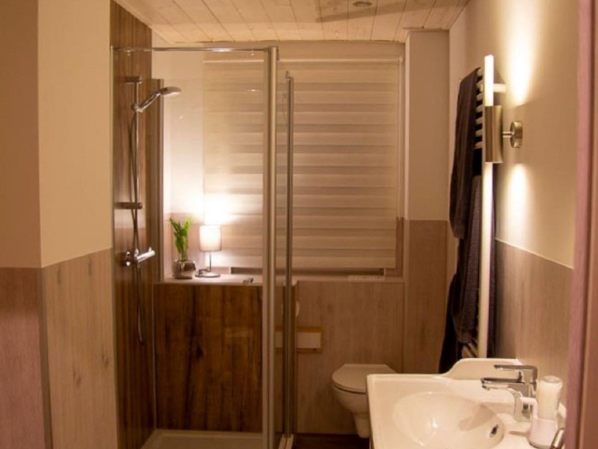 Dusche mit einer geringen Schwelle von ca. 5 cm, WC, Handtuchheizkörper, Kosmetikspiegel, Duschhocker, Kinderschemel, großes Fenster, Föhn, Hand,- und Badetücher.