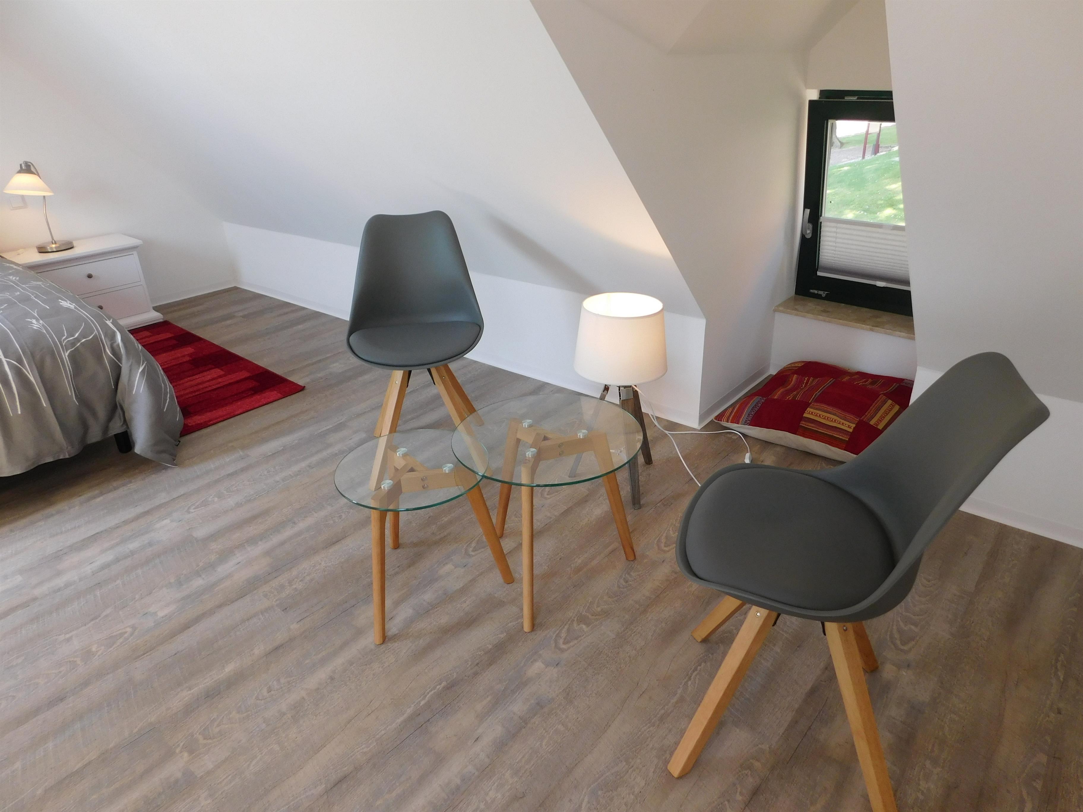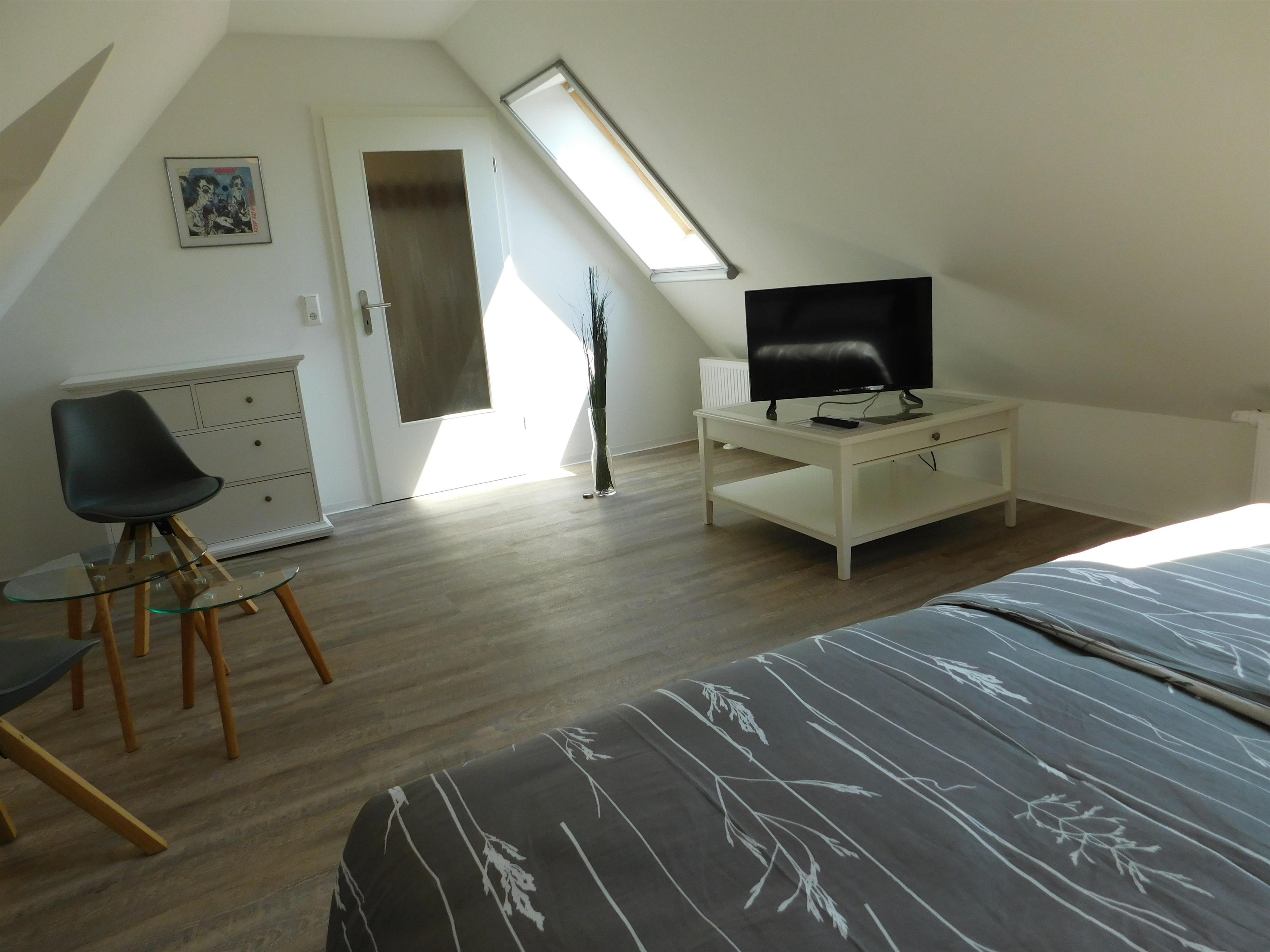 Das Bad ist mit einer ebenerdigen Dusche ausgestattet. Über eine bequeme kleine Treppe kommen Sie in das gemütliche Schlafzimmer im Dachgeschoss.