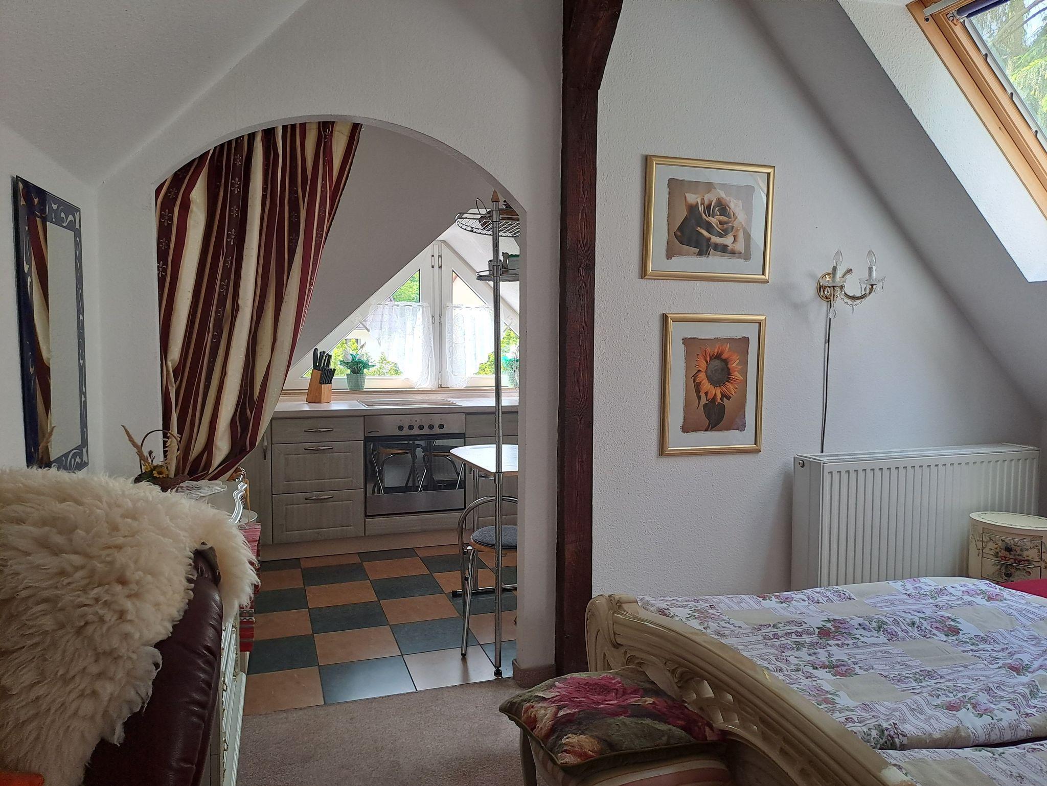 Die Wohnung (36 m²) verfügt über einen stilvoll eingerichteten kombinierten Wohn-/Schlafraum mit Möbeln im romantischen Rokoko Stil, großem Doppelbett und gemütlicher Sitzecke sowie Balkon. Die moderne, geräumige Küche ist komplett ausgestattet mit Geschirrspüler, Mikrowelle, Elektroherd, Kaffeemaschine etc. und lädt zum gemütlichen Frühstück ein. Das in Rosa gehaltene Bad verfügt über Dusche (hoher Einstieg), Waschplatz und Toilette mit Fenster.