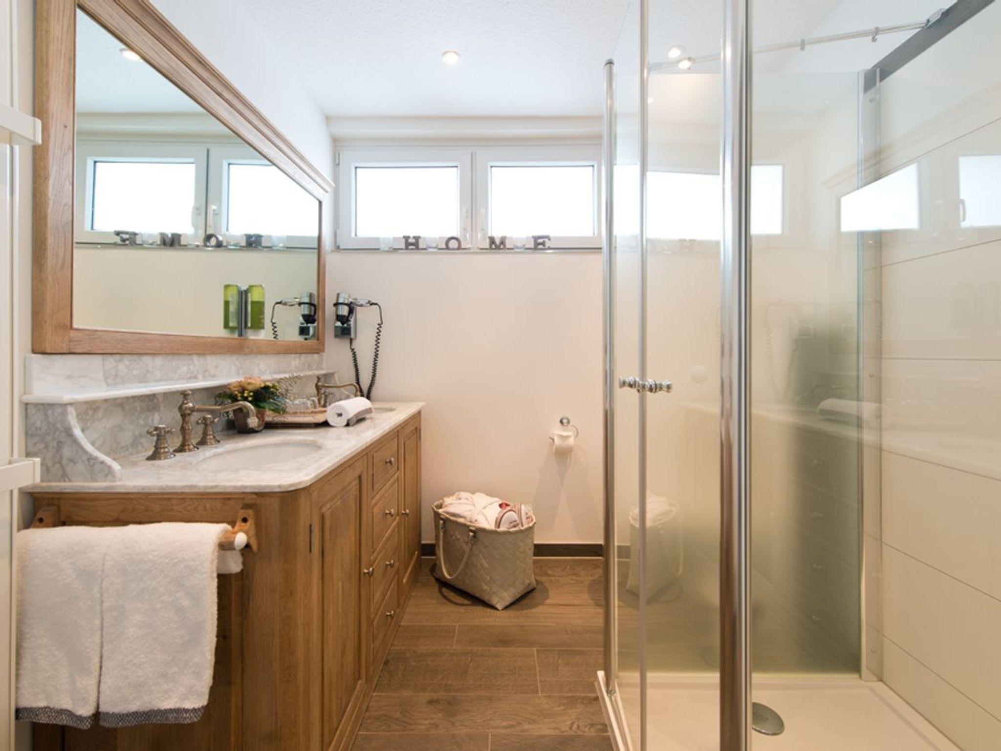 • Badezimmer, große Dusche, Doppelwaschbecken, WC und separates 2. WC