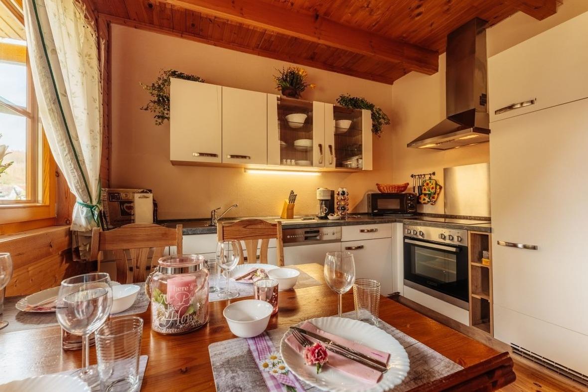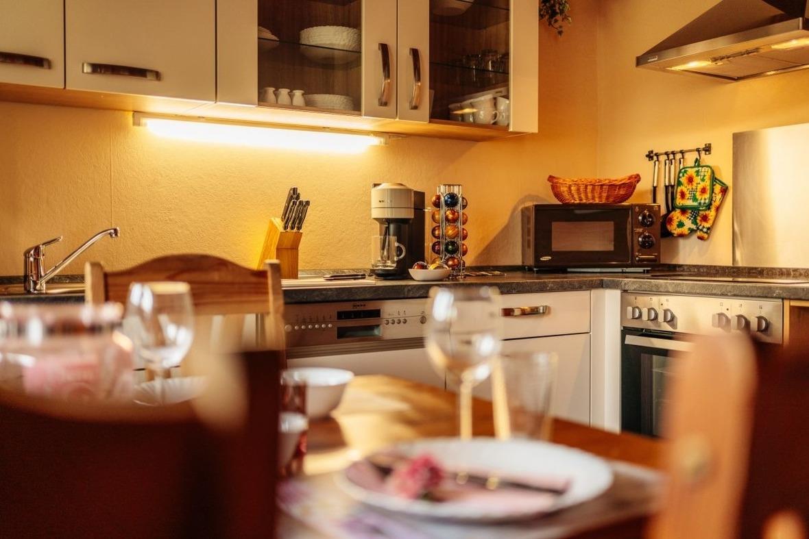 Die geräumige Wohnküche lädt auch nach dem Essen zum verweilen ein. Ausgestattet ist sie mit allem was man für einen entspannten Urlaub braucht: