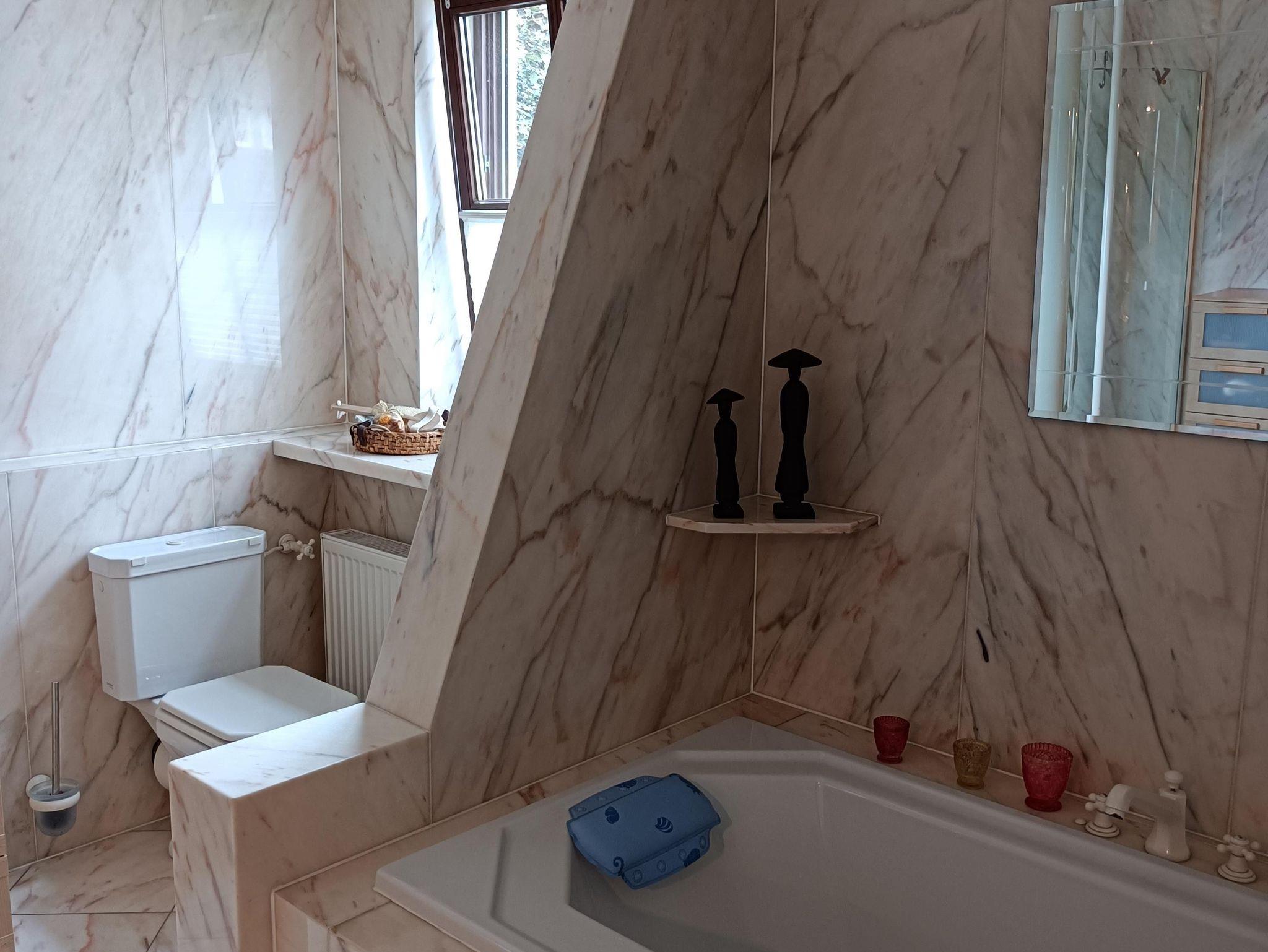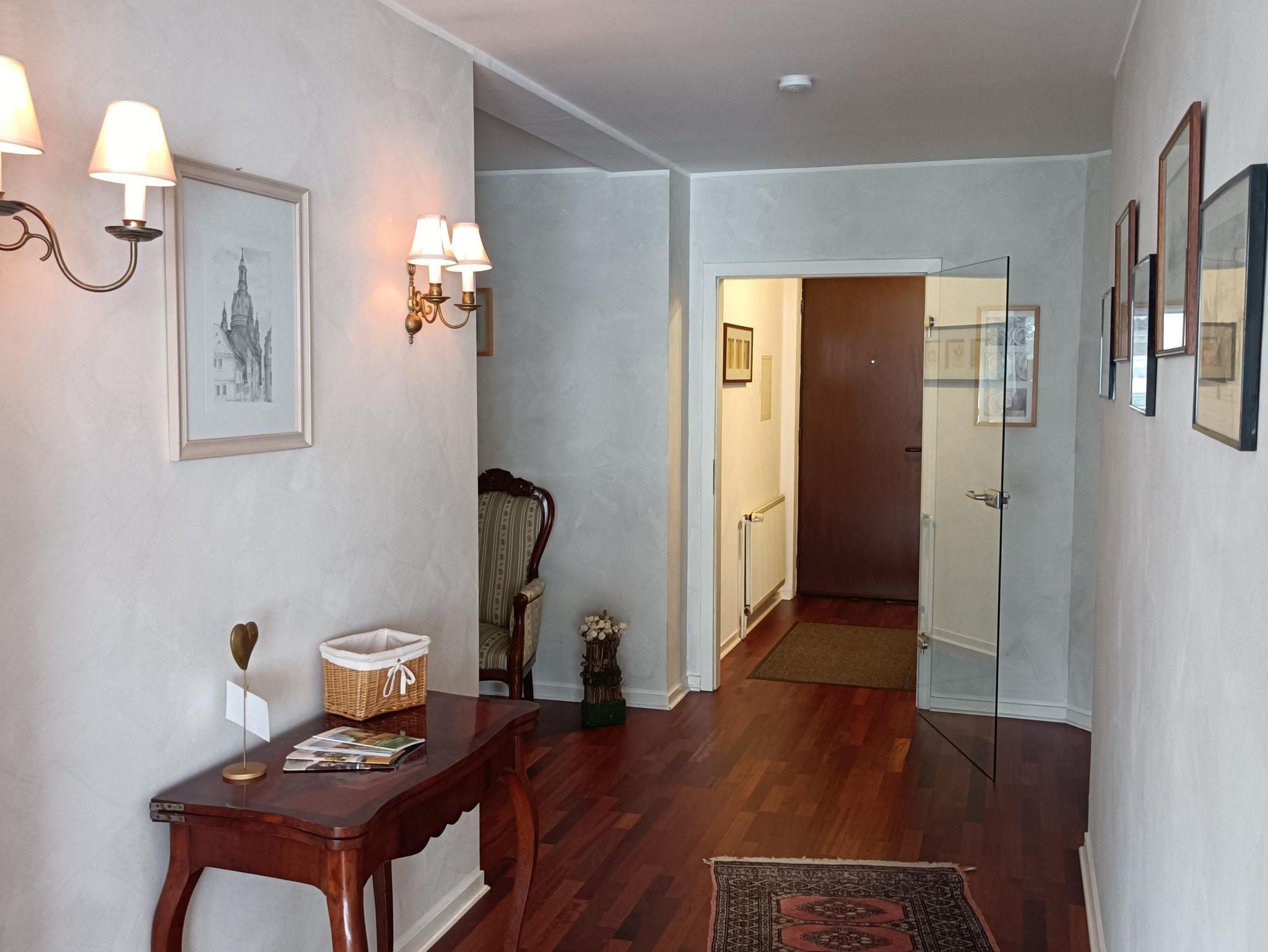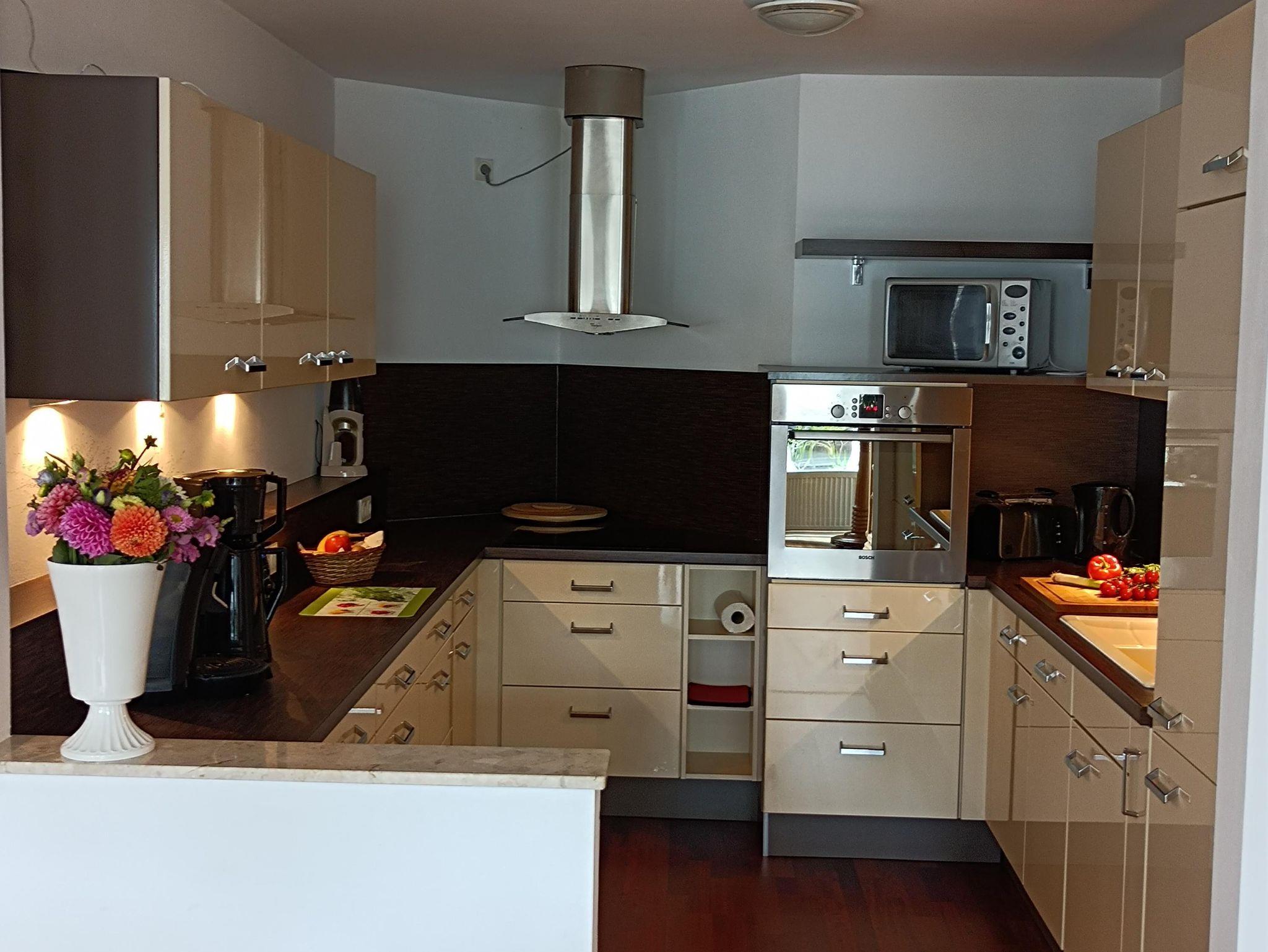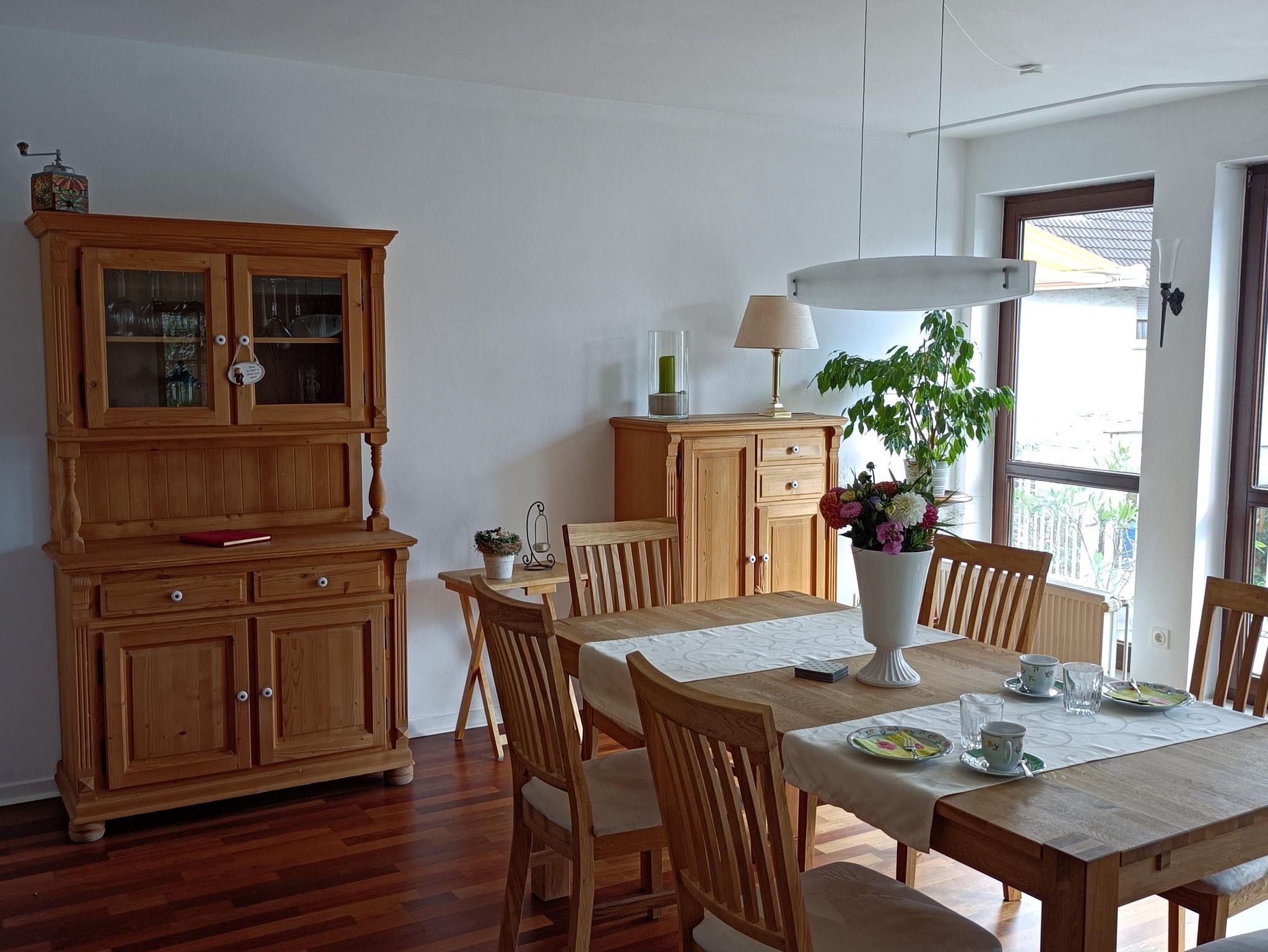 Sie betreten die Wohnung im 1. OG über eine Diele und kommen in einen hellen Flur. Ein geräumiges Hauptschlafzimmer mit direktem Zugang zum großen Badezimmer, ein Gästezimmer und ein Gäste-WC mit Dusche stehen für Ihr Wohlbefinden bereit. Die Küche ist komplett ausgestattet mit Herd, Backofen, Mikrowelle, Kühl- Gefrierkombination, Spülmaschine und etliche Haushaltsgeräten, sowie Geschirr, Gläsern und Handwerkzeug um ein gutes Mahl zu zaubern. Das Esszimmer liegt direkt an die offene Küche und mündet durch einen großen Durchgang im gemütlichen Wohnzimmer. An beide Wohnräume schließt sich durch große Türen jeweils ein Balkon an. Im Keller steht ein Parkplatz in der Tiefgarage zur Verfügung.