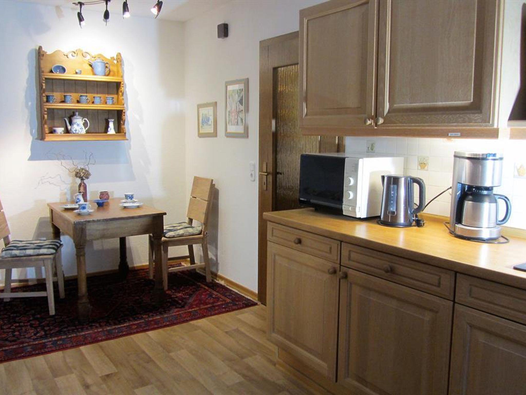 • Küche mit Ceran-Kochfeld, Mikrowelle, Kaffeemaschine, Kühlschrank