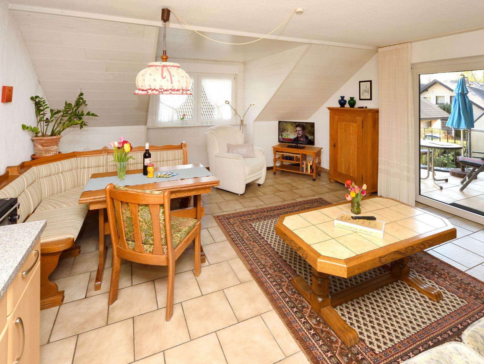 Bei Betreten der Wohnung befinden Sie sich in der Wohnküche. Die Küchenzeile ist ausgestattet mit einem Kühlschrank, 2 Platten-Cerankochfeld, Microwelle, Wasserkocher, Kaffeemaschine, Eierkocher, Toaster und Geschirr. Eine Essecke befindet sich im Wohnbereich. Die gemütliche Sitzecke mit Couch und Sessel und TV lädt zum Verweilen ein. Vom Wohnbereich gelangen Sie zum Balkon. Im Schlafzimmer befindet sich ein Doppelbett, das zu 2 Einzelbetten separiert werden kann, mit einem großen Kleiderschrank. Im Badezimmer mit Fenster finden Sie eine Dusche und WC. Ein Fön und Pflegeartikel (Shampoo, Duschgel etc.) sind vorhanden. Handtücher und Bettwäsche sind vorhanden, WLAN und Parkplatz sind kostenfrei. Ein Garagenstellplatz kann kostenpflichtig (auf Anfrage) hinzugebucht werden.