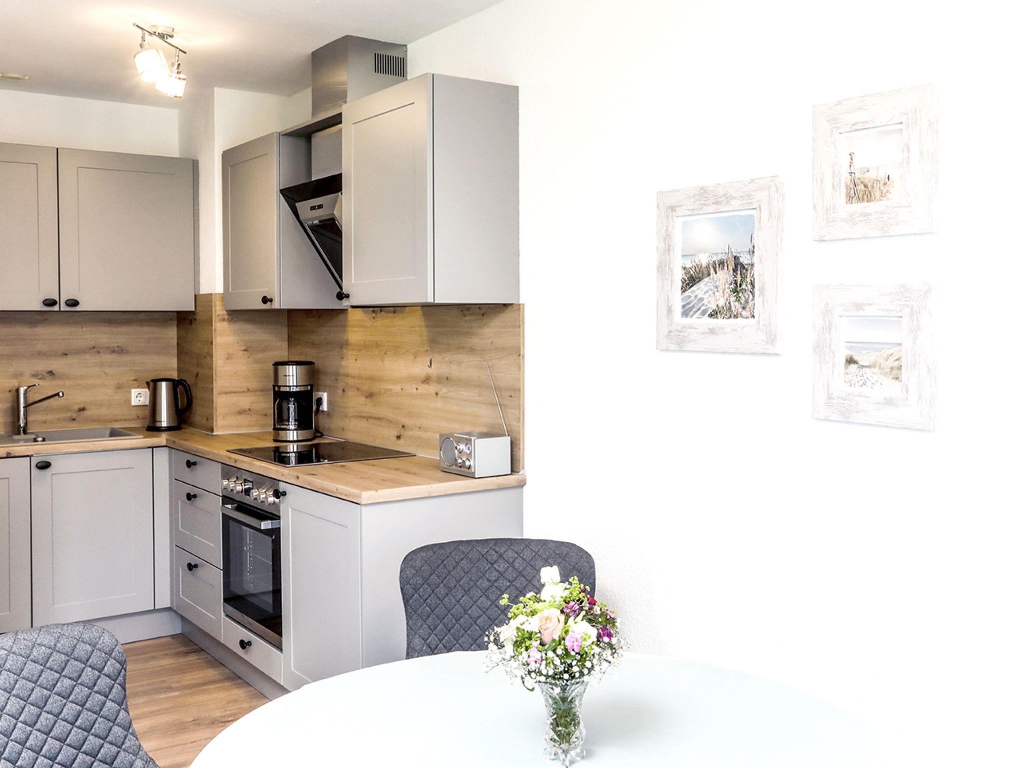 (Kühlschrank mit Gefrierfach, Spülmaschine, Backofen, Cerankochfeld, Wasserkocher, Kaffeemaschine, Toaster).
