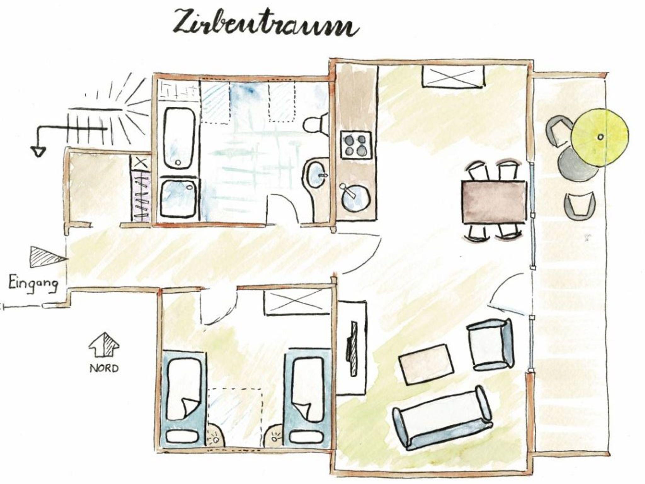 Die großzügig geschnittene 2 Zimmer-Wohnung Zirbentraum liegt im 1. Obergeschoss und wurde 2020 hochwertig renoviert und im modernen Stil eingerichtet. Das Thema Zirbe zieht sich durch alle Räume. Die Zirbe ist eine Kiefernart und duftet angenehm würzig. Die ätherischen Öle sollen zur Entspannung und erholsamen Schlaf beitragen. Der große Wohn-/Essbereich lädt zum Verweilen und die breite Loggia lädt zu einem gemütlichen sonnigen Frühstück ein.