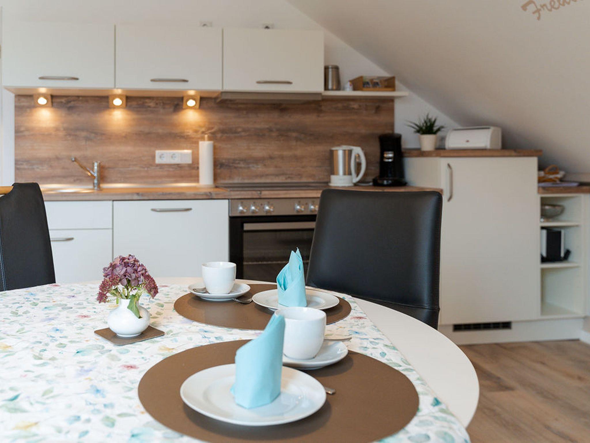 Die Küche ist vollwertig eingerichtet mit Spülmaschine, Herd, Backofen, Kaffeeautomat, Toaster, Wasserkocher und Mikrowelle.