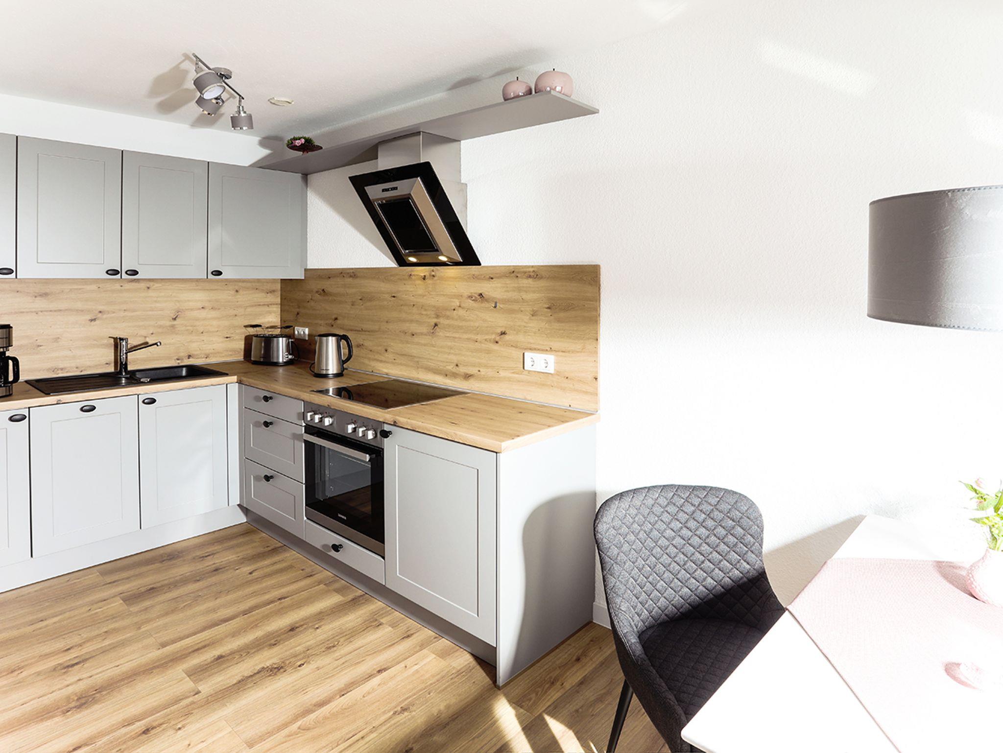 (Kühlschrank mit Gefrierfach, Cerankochfeld, Spülmaschine, Backofen, Wasserkocher, Kaffeemaschine, Toaster).