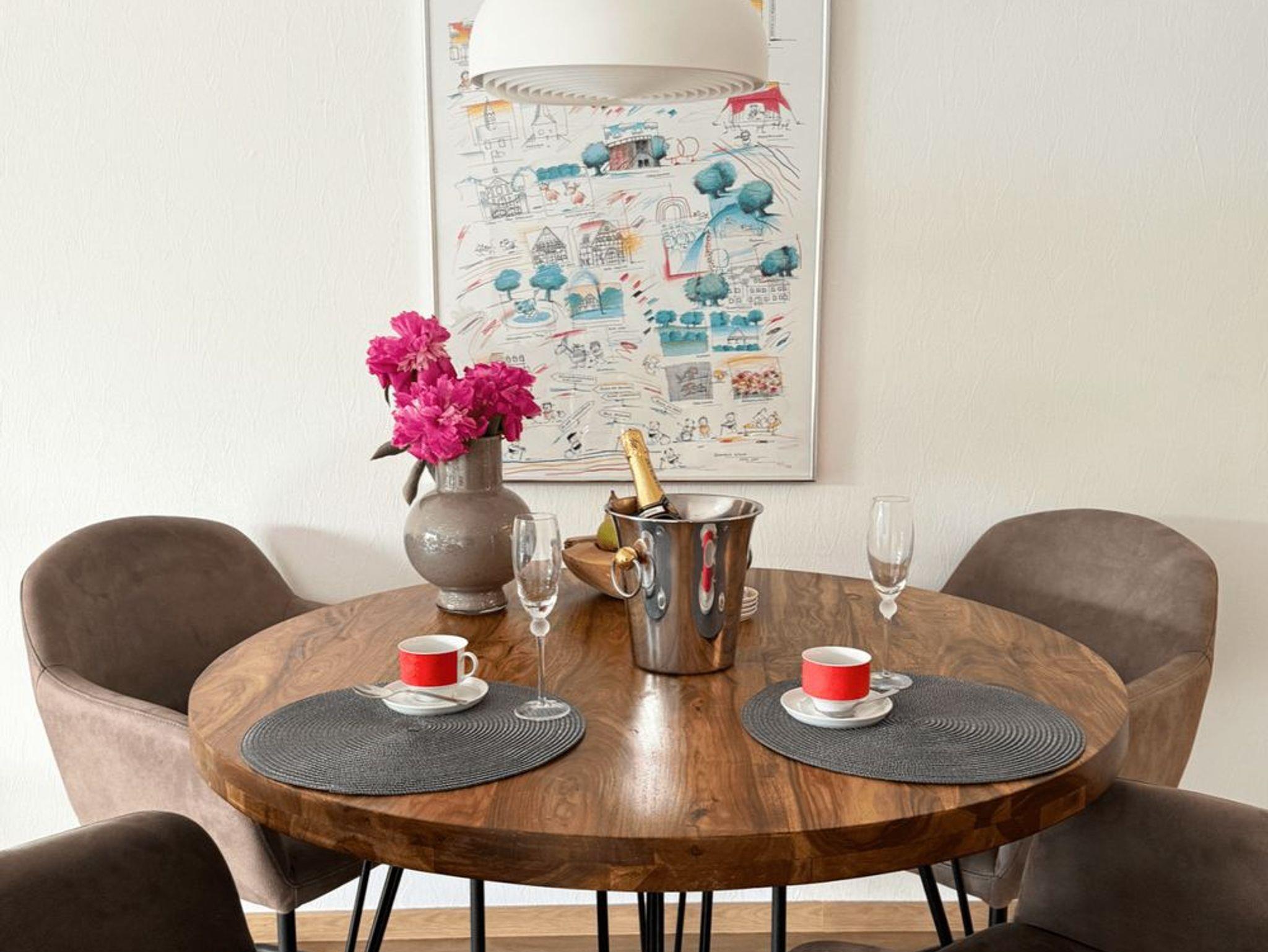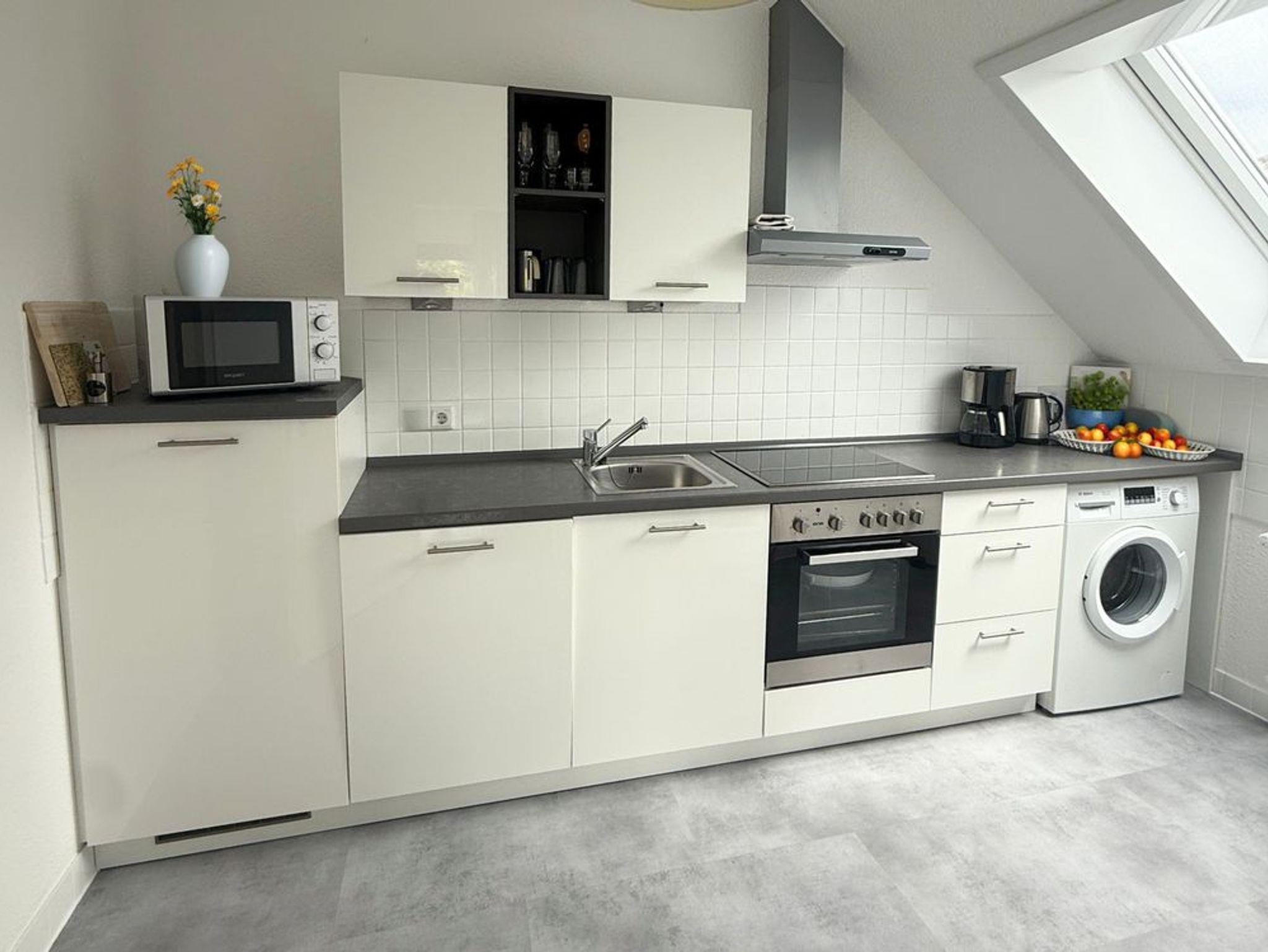 In der modernen Einbauküche – ausgestattet mit Spülmaschine und Waschmaschine – können Sie sich kulinarisch verwöhnen oder einfach entspannt genießen. Alles, was Sie für einen komfortablen Aufenthalt in einer Ferienwohnung in Bad Sassendorf brauchen, ist vorhanden.