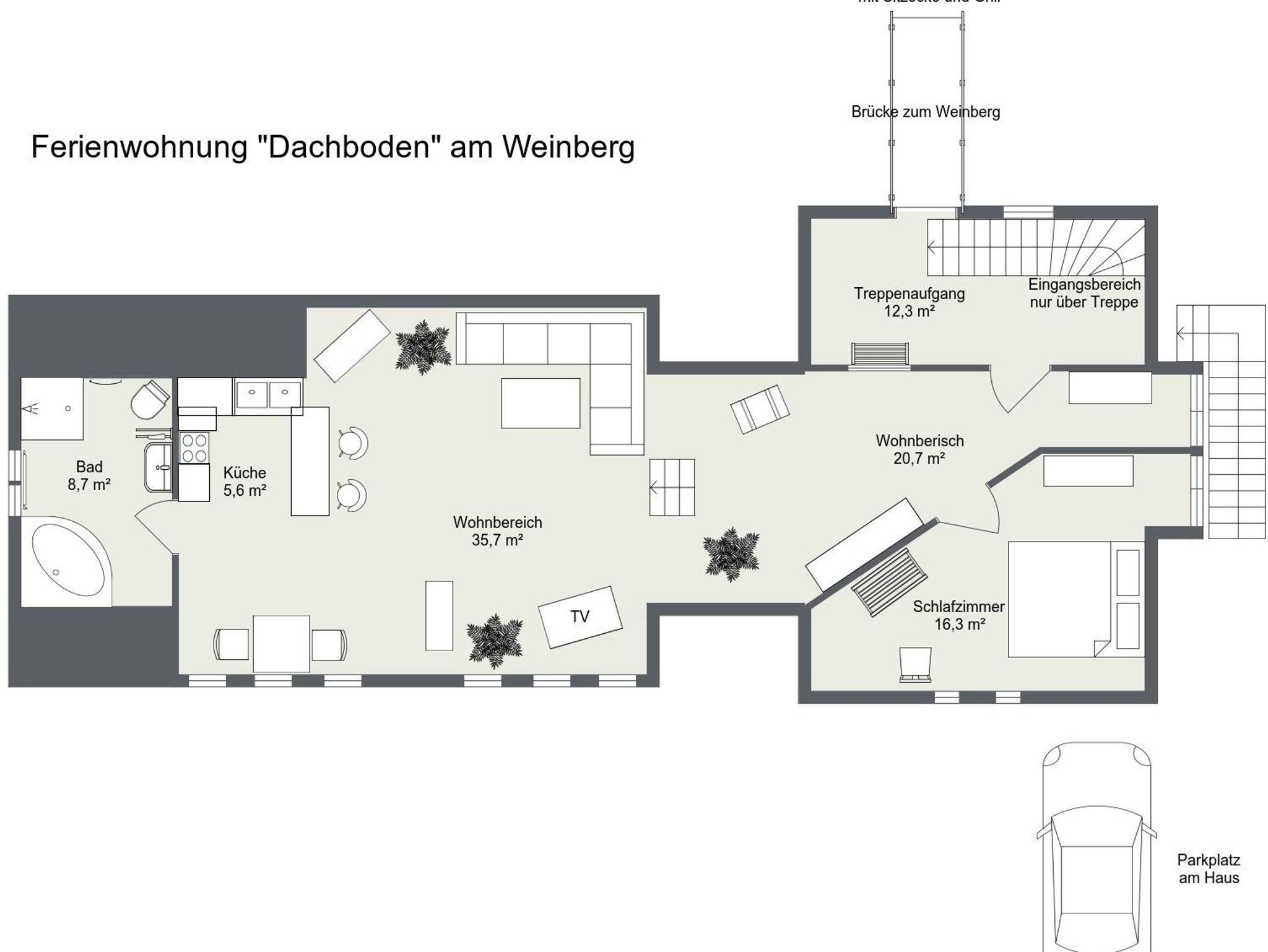Herzlich willkommen in unserer gemütlichen Ferienwohnung Dachboden für zwei Personen, ideal mit eigenem Eingang und einer charmanten Sitzecke am Weinberg. Hier können Sie entspannte Tage genießen und sich wie zu Hause fühlen.