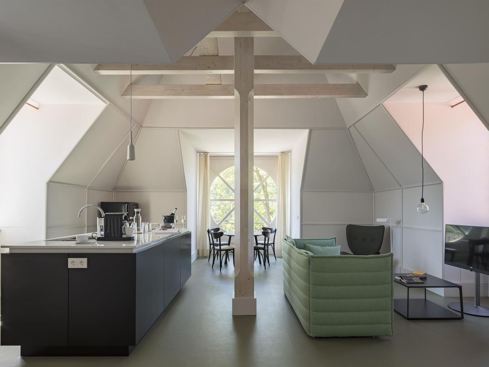 Durch das große, charakteristische Rundfenster genießen Sie unverstellte Blicke auf den majestätischen Lilienstein und die Festung Königstein. Hoch oben im Südgiebel erwartet Sie ein großzügiger, privater Wohnbereich, der Ihnen alle Annehmlichkeiten bietet – hier können Sie kochen, essen und ausruhen. Dachschrägen und sichtbare Kehlbalken geben dem Raum ein besonderes Flair. Im separaten Schlafgemach und auf der Schlafgalerie über dem Wohnsalon stehen Betten für insgesamt drei bis vier Personen zur Verfügung. Der Wohnsalon bietet zudem die Möglichkeit der Aufbettung für eine Person. Die modern eingerichtete Suite verbindet stilvollen Wohnkomfort und fantastischen Ausblick in alle Richtungen zu einem eindrücklichen Erlebnis.