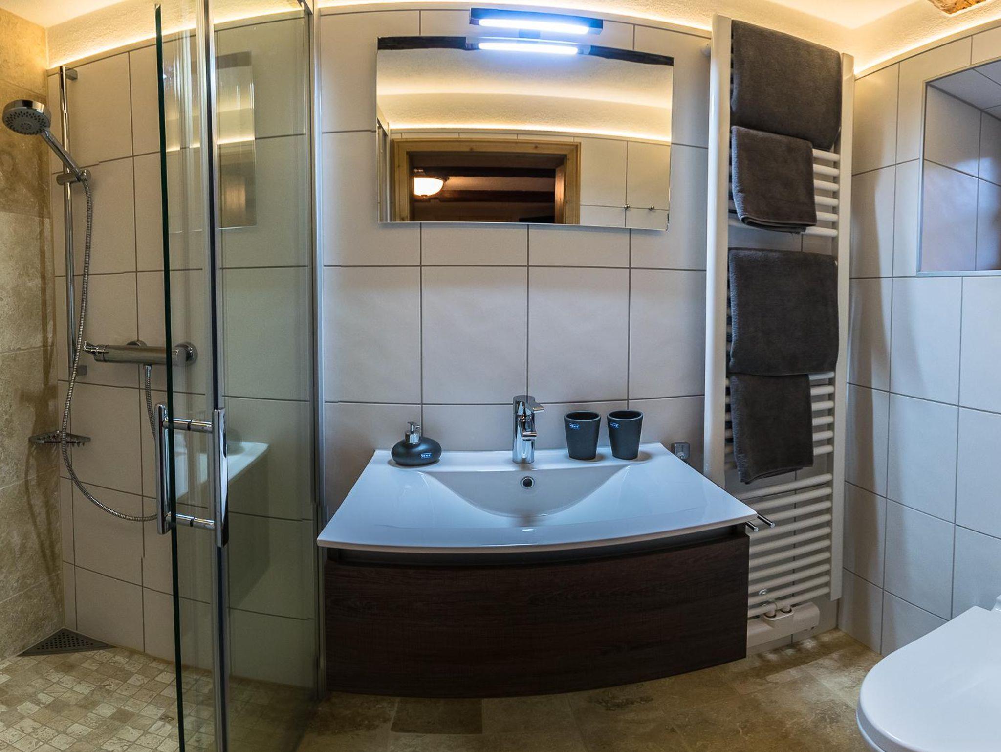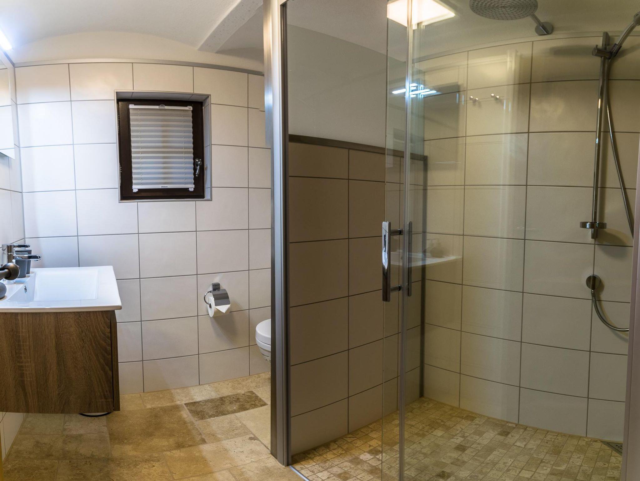 Im Obergeschoss befinden sich 1 Doppelschlafzimmer (ca. 12 m²) mit zwei Einzelbetten und Dusche/WC, 1 Doppelschlafzimmer (ca. 11 m²) mit Doppelbett und Dusche/WC und 1 Doppelschlafzimmer (ca. 19 m²) mit Doppelbett.