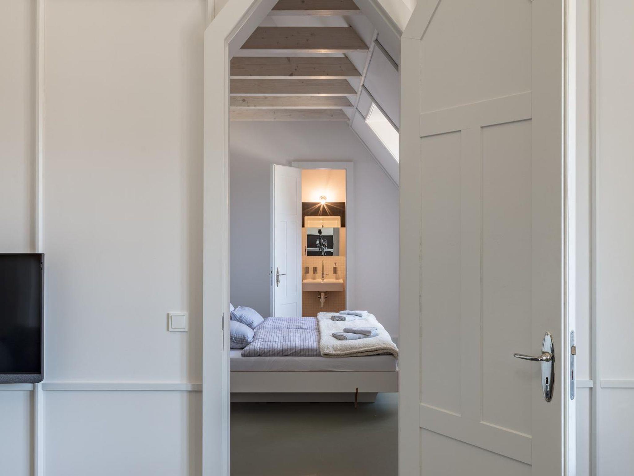 Das besondere Raumgefühl des offenen Mansardengeschosses erleben Sie in unserem Vier-Personen-Appartement unterm Dach. Sichtbare Holzbalken und schräge Dachflächen schaffen Atmosphäre und Behaglichkeit. Der Wohnbereich ist durch einen Treppenaufgang mit der Schlafgalerie verbunden, auf der zwei Personen entspannt und geborgen schlafen. Die untere Ebene bietet alles, was eine Familie zum komfortablen Aufenthalt benötigt: eine vollausgestattete Küchenzeile, einen Essplatz mit Talblick, eine gemütliche Sitzecke und ein Badezimmer mit Bidet. Der angrenzende Giebel beherbergt ein separates Schlafzimmer mit eigenem Bad. Durch die großzügigen Gaubenfenster können Sie morgens die ersten Sonnenstrahlen genießen – das Glasoberlicht über der Schlafgalerie ermöglicht nachts den Blick in die Sterne.