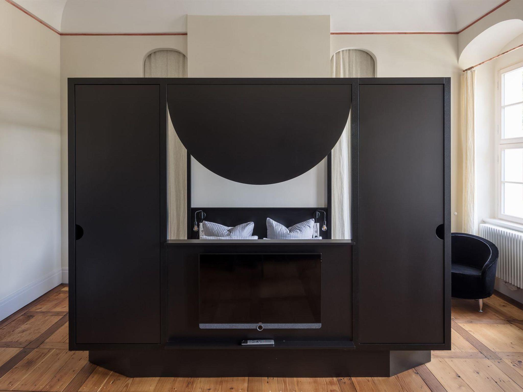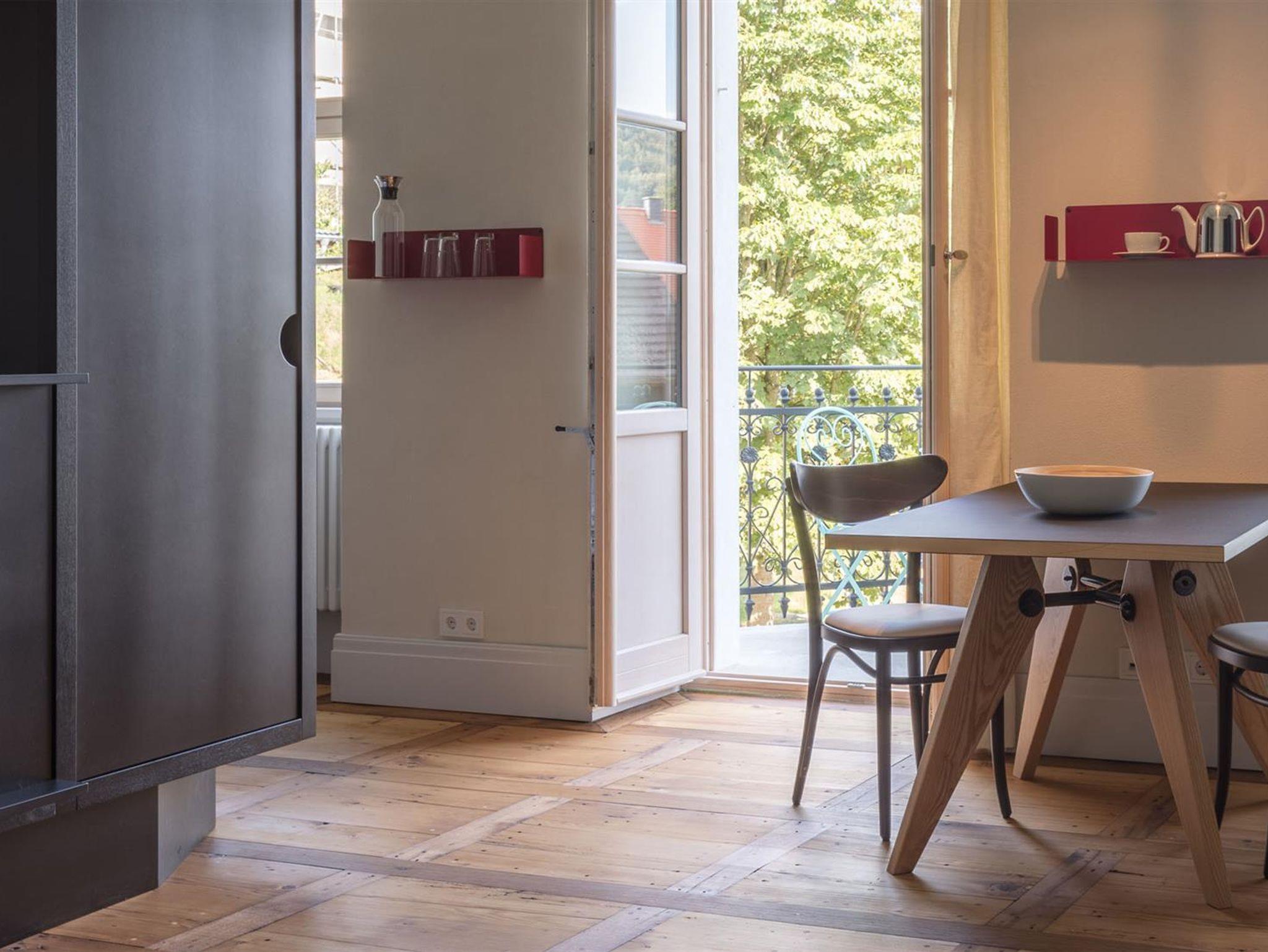 Einen der drei ehemaligen Salons im Obergeschoss nutzend, bietet dieses Appartement großzügigen Raum für ein zeitgemäßes Wohnerlebnis zu zweit. Durch die große Fensterfront öffnet sich der Blick gen Osten über den weitestgehend unbefahrenen Dorfplatz hinweg ins Tal hinein. Auf dem prominent gelegenen Balkon begrüßen Sie die Morgensonne und beobachten das gemächliche Dorfleben. Die frei im Raum stehende Kücheninsel und das Himmelbett sind maßgeschneidert. Beide Möbel gliedern das Appartement in Ess-, Wohn- und Schlafbereich, ohne die Räume komplett voneinander zu trennen. Reste erhaltener Wandmalerei und historischer Fußboden erinnern an die lange Geschichte dieses Raums.