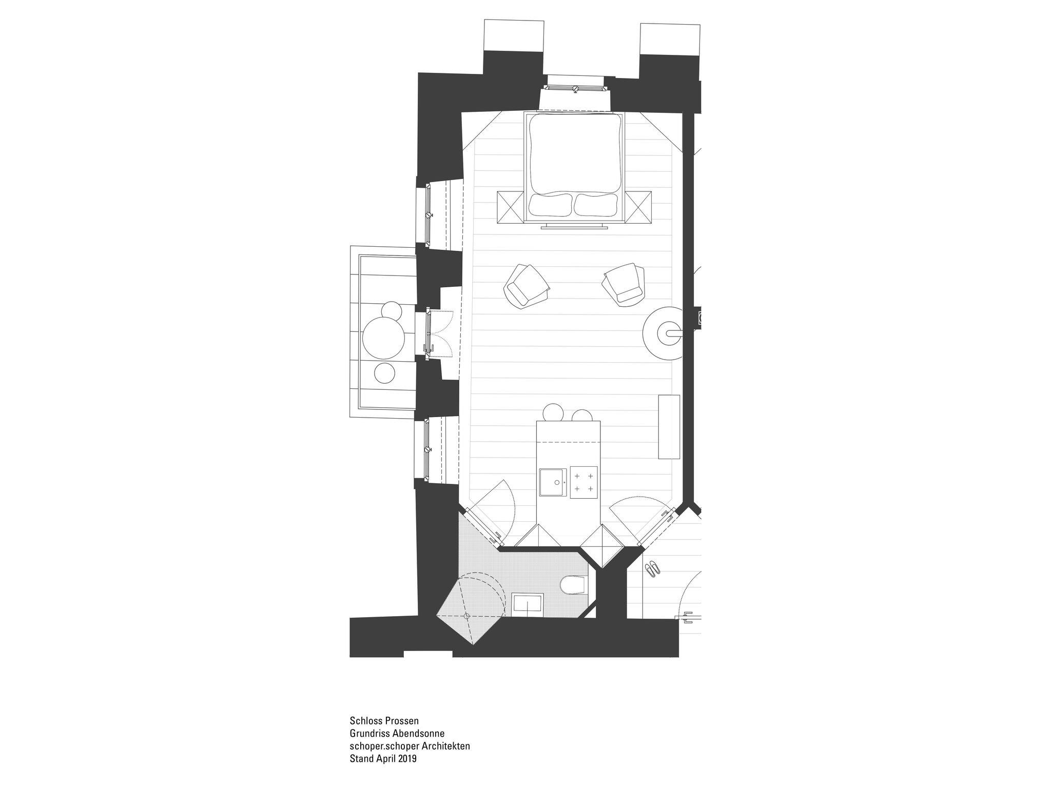 Schloss Prossen, Apartment Abendsonne, offener Wohn- und Schlafraum