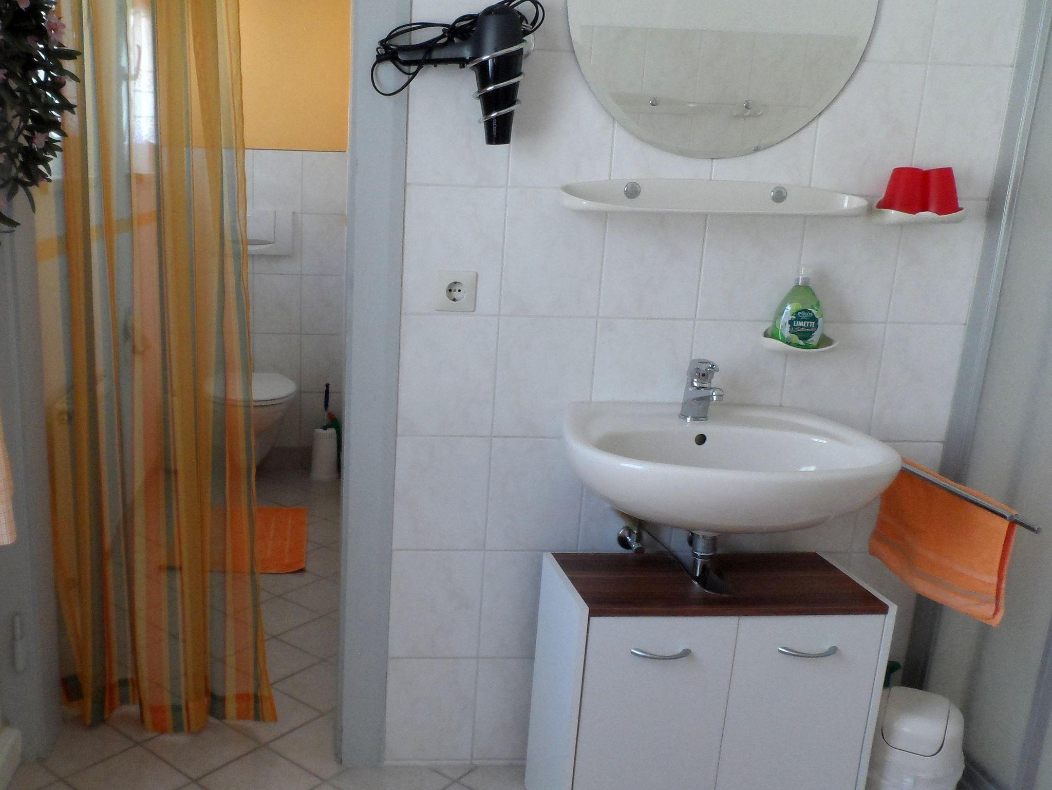 Das Badezimmer ist mit Dusche (tiefer Einstieg) und Waschbecken sowie einem separaten WC eingerichtet. Vom Wohnraum erreichen Sie den Balkon mit Gartenmöbel und Blick zur Elbe.