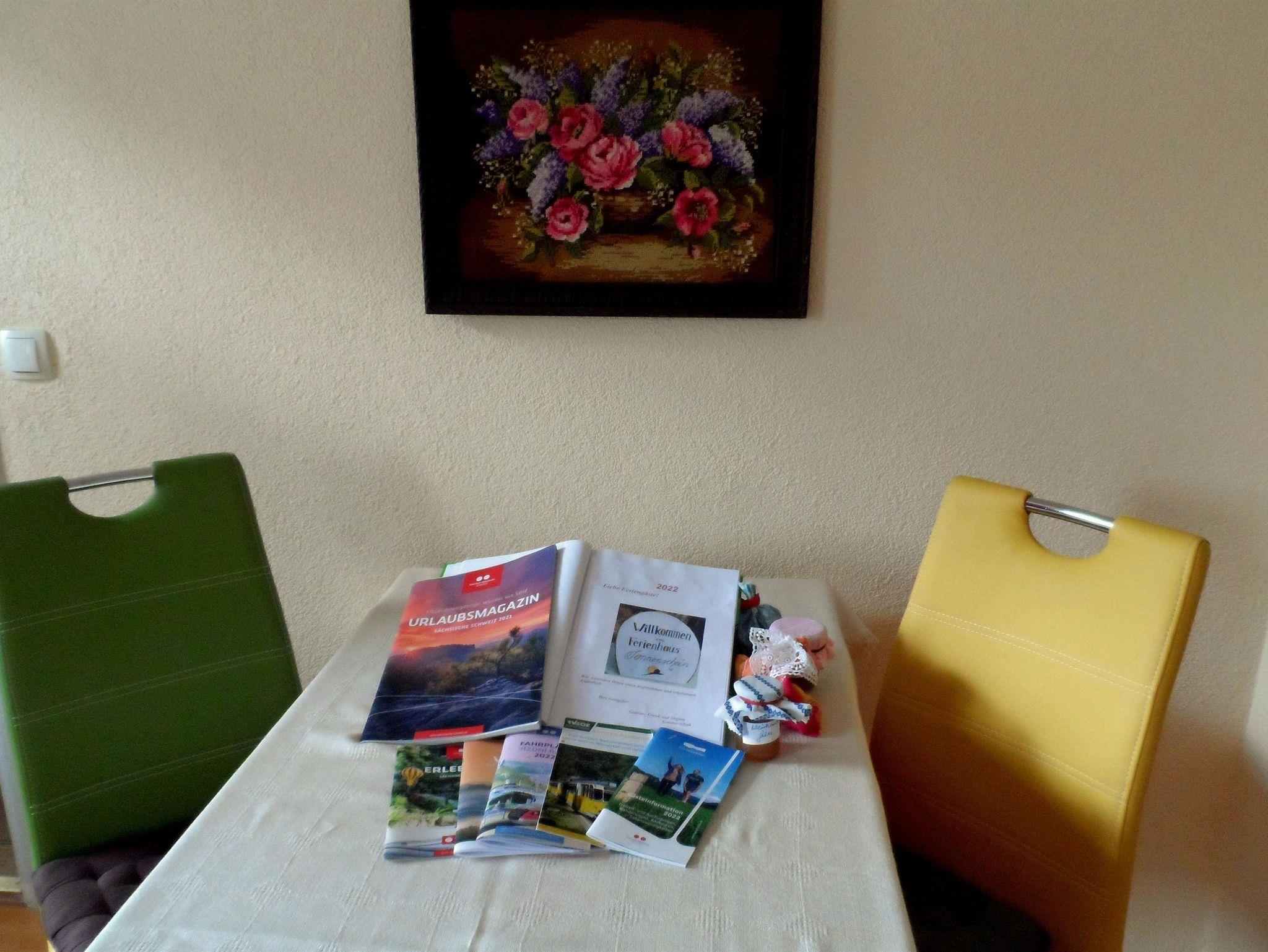 Die Ferienwohnung befindet sich in der 1. Etage. Über eine Außentreppe erreichen Sie die überdachte Terrasse und den separaten Eingang zur Ferienwohnung. Es stehen ein Schlafraum mit Doppelbett, ein Wohnraum mit Sitzgruppe (3. Schlafmöglichkeit für ein Kind bis 12 Jahre) und TV sowie eine separate Küche mit Küchenzeile und Essplatz zur Verfügung.