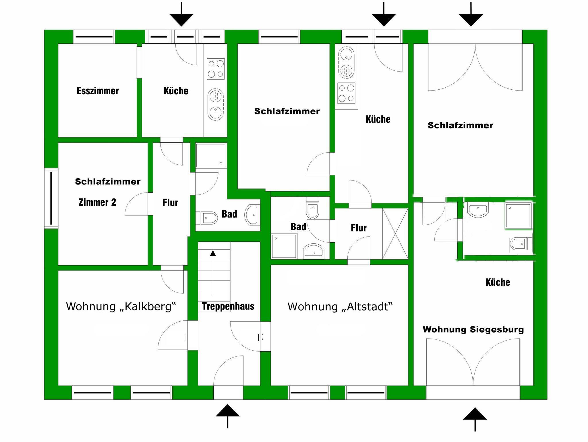Die Wohnung verfügt über vier Schlafmöglichkeiten und ein Babybett. Ich empfehle sie aber besonders bei längeren Aufenthalten nur für zwei Personen mit Kleinkind. Größeren Gruppen empfehle ich die Anmietung mehrerer Wohnungen. Die Apartments Altstadt, Kalkberg, Fledermaus und Siegesburg befinden sich alle im selben Haus.