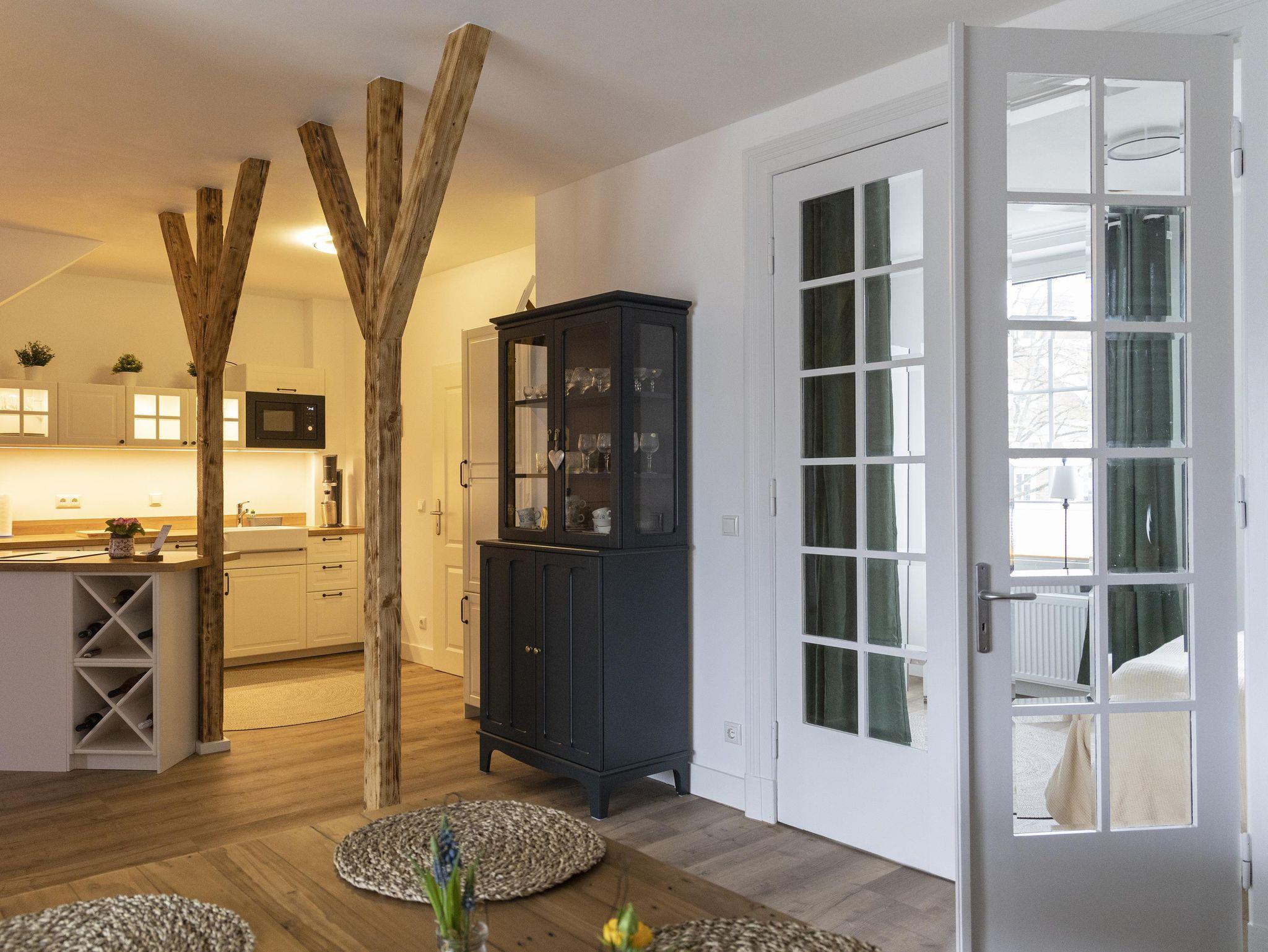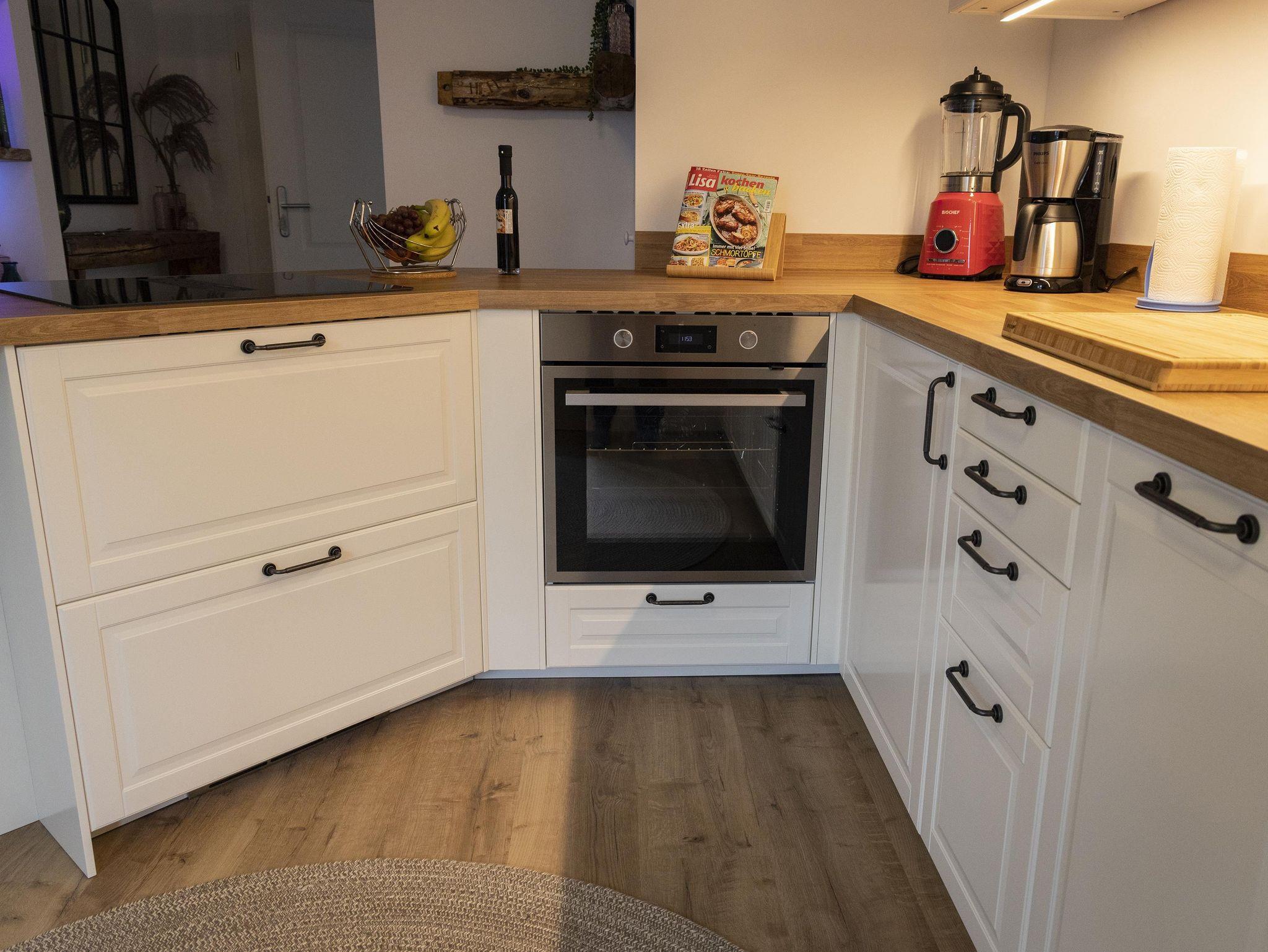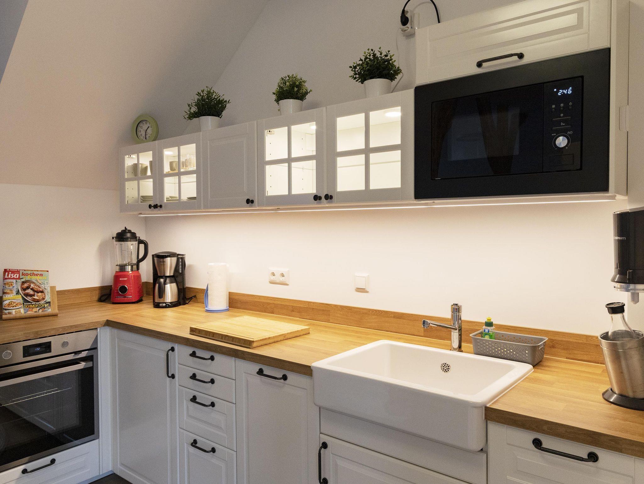 Die vollausgestattete Küche und der große Esstisch laden zum Kochen und Essen ein. Auch der passende Rotwein liegt schon bereit (gg. Gebühr).
