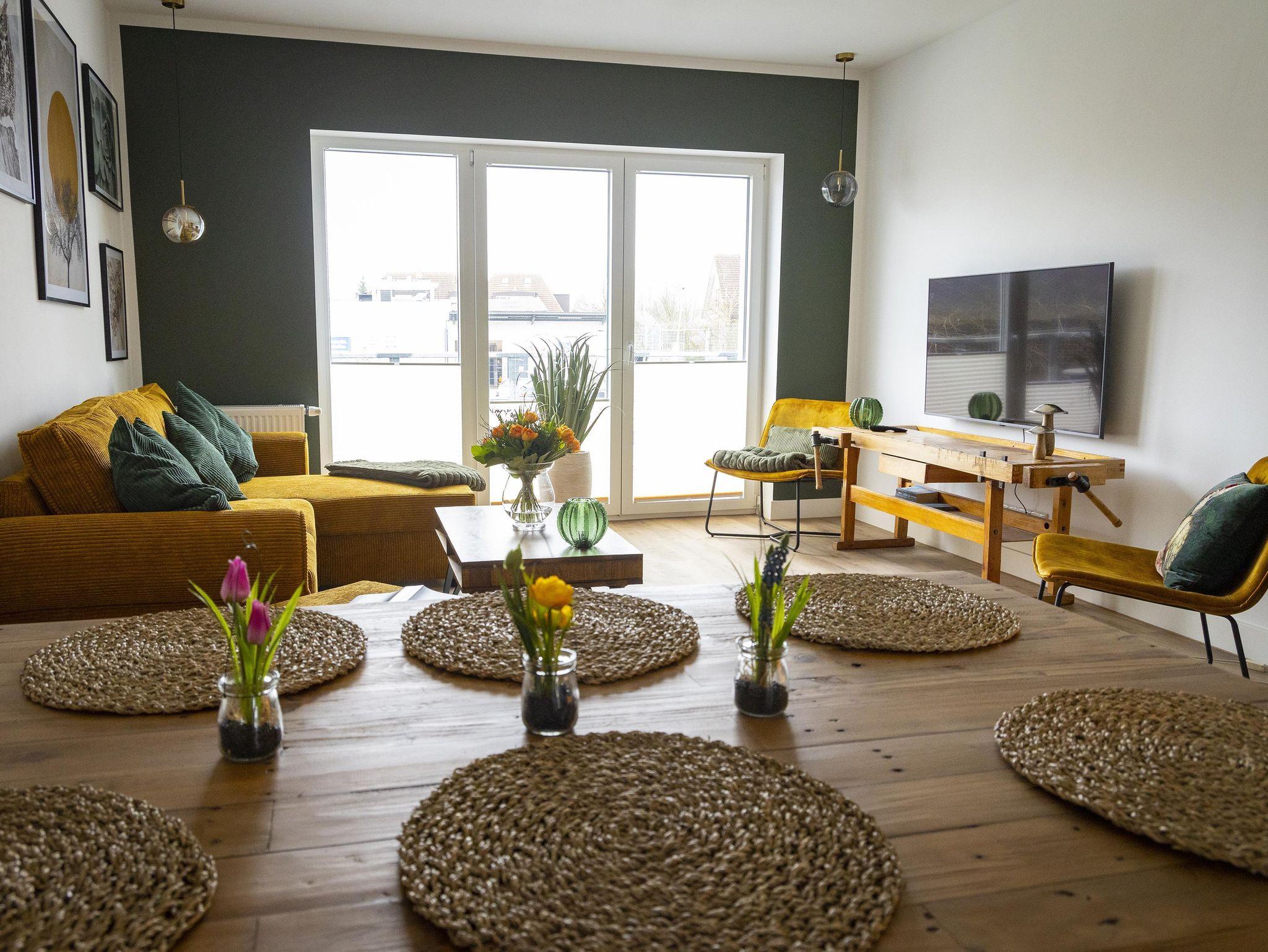 Im gemütlichen Wohn- und Esszimmer gibt es einen Smart TV mit Streaming. Der vom Wohnzimmer aus begehbare Balkon liegt nach Westen hin und bieten neben Sitzgelegenheiten auch einen Grill.