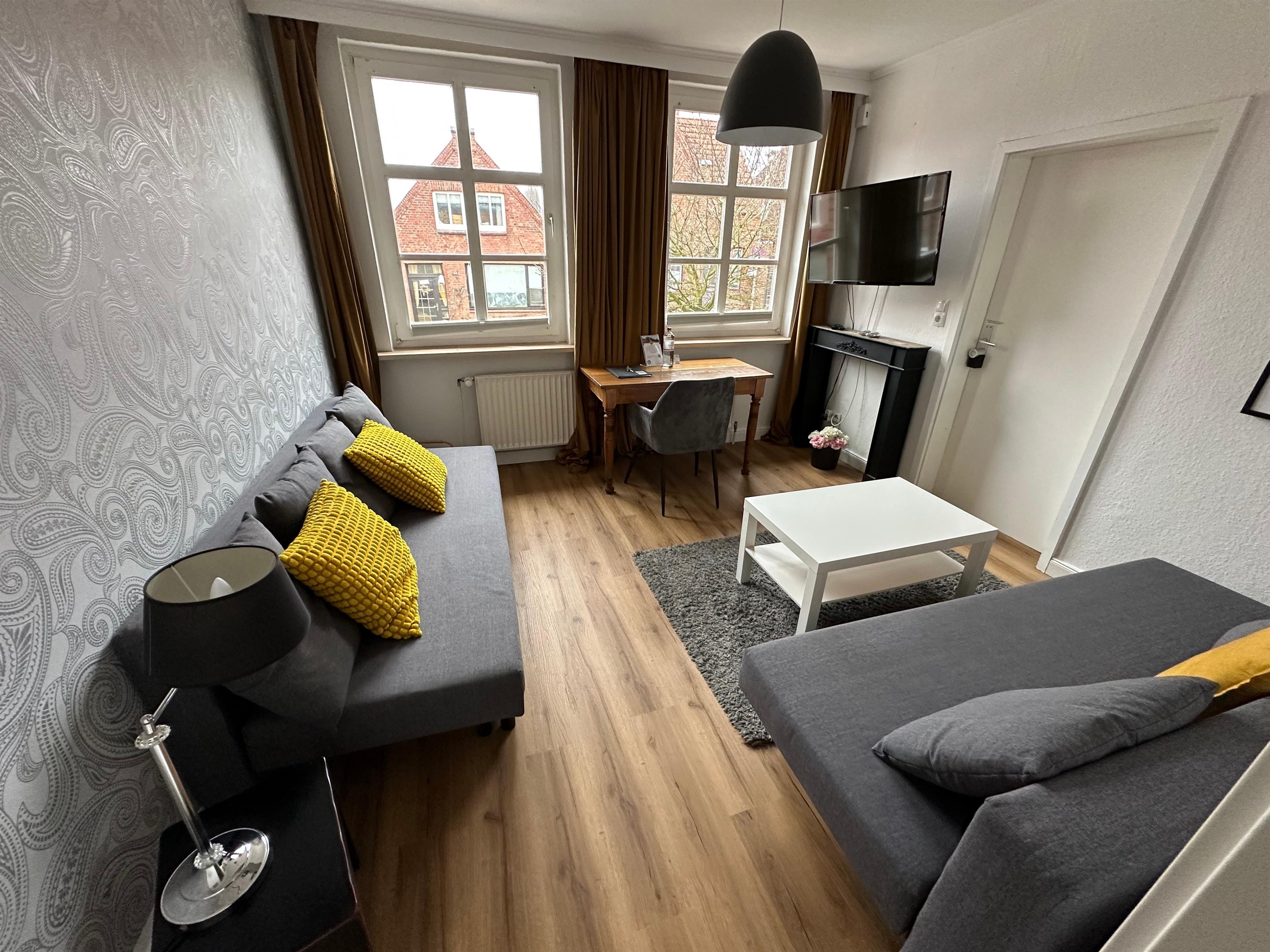 Die Wohnung Altstadt verfügt über ein Schlafzimmer mit Doppelbett (180 x 200), eine Küche, Duschbad und ein Wohnzimmer mit zwei Schlafsofas (ausgeklappt je 160 x 200).