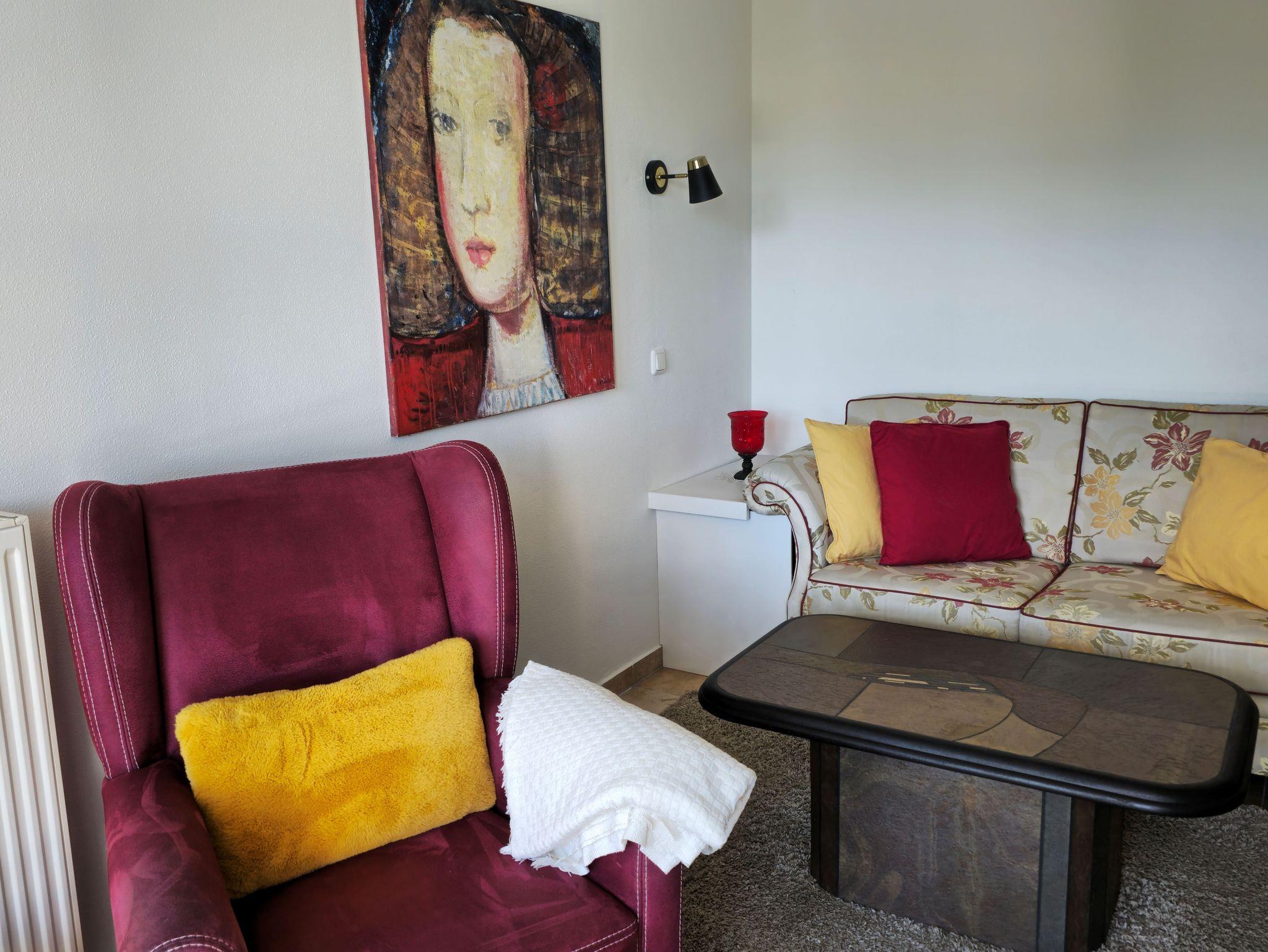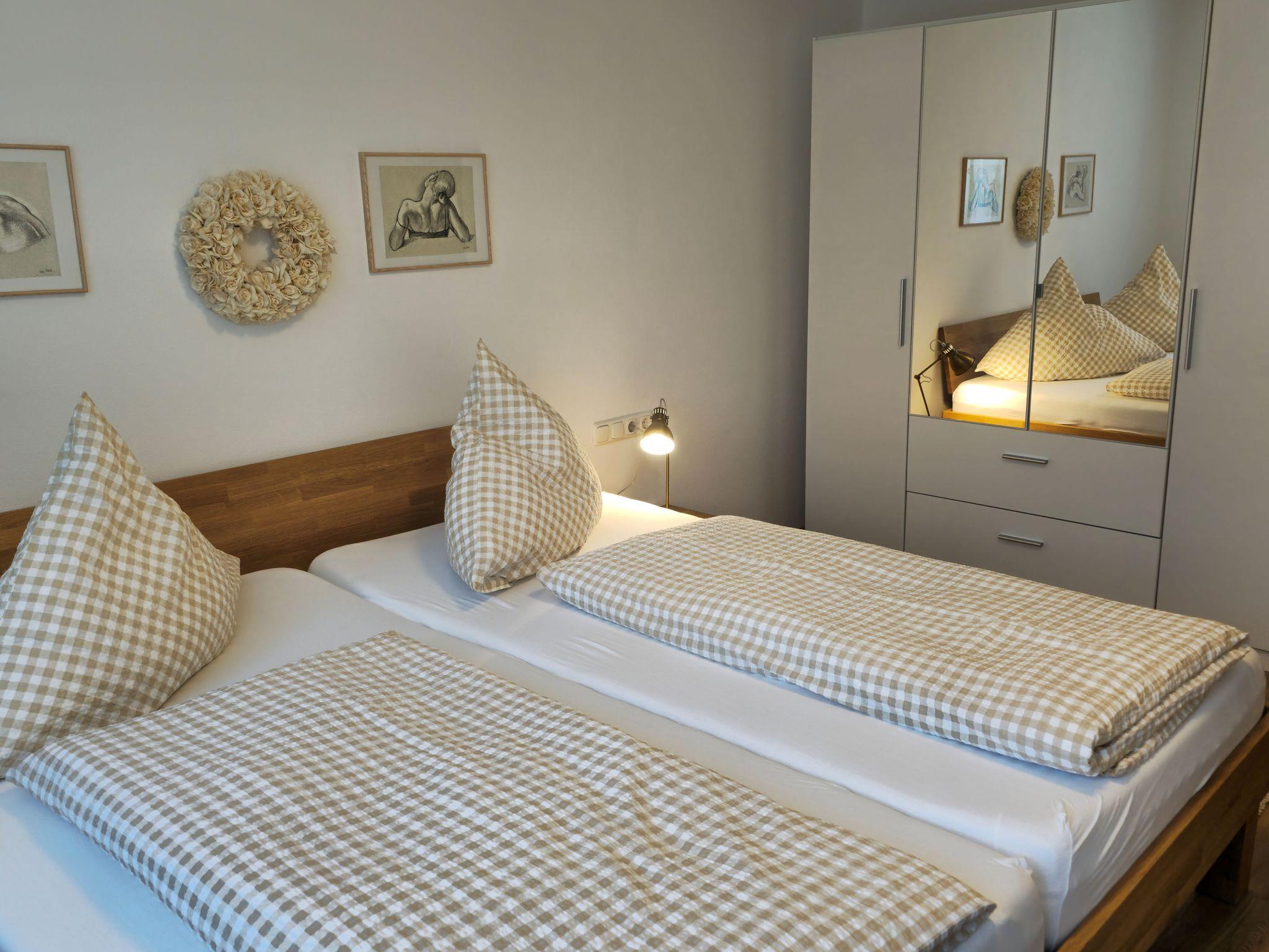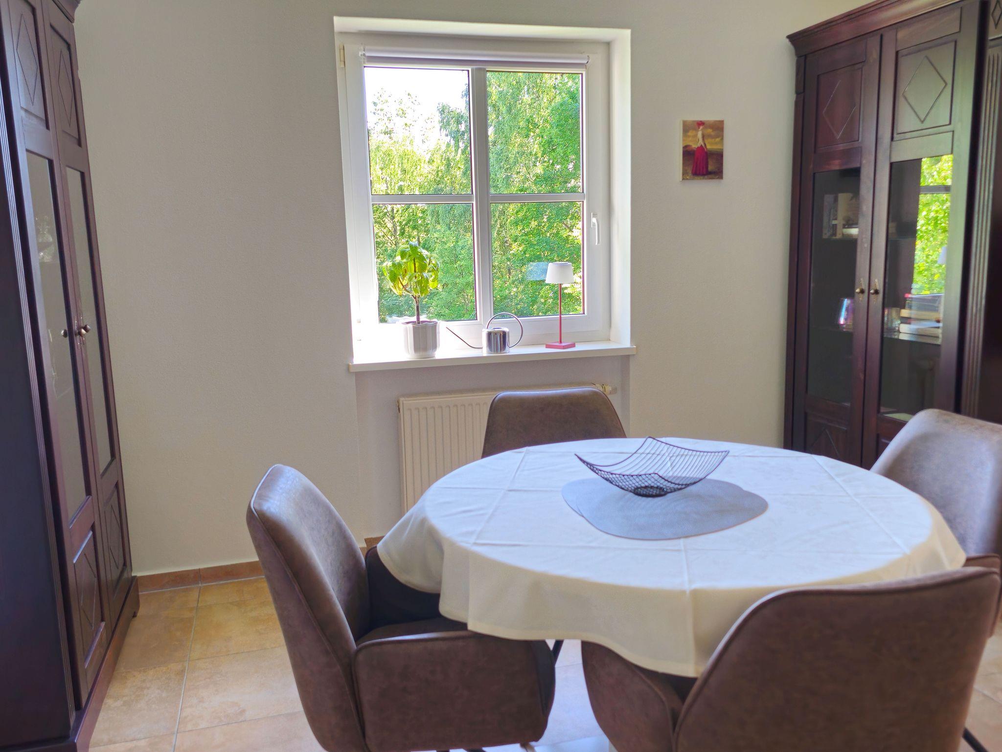 Wir bieten Ihnen eine komfortable Ferienwohnung (ca.60qm) im Obergeschoss, mit einem großzügigen Wohnraum und Essplatz, einem Schlafzimmer mit Doppelbett und einem großen Bad mit Fußbodenheizung.
