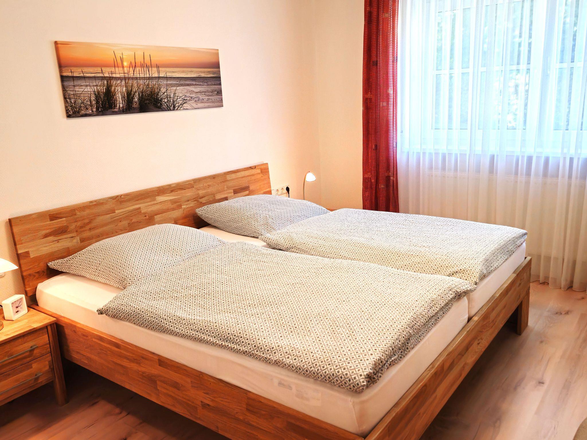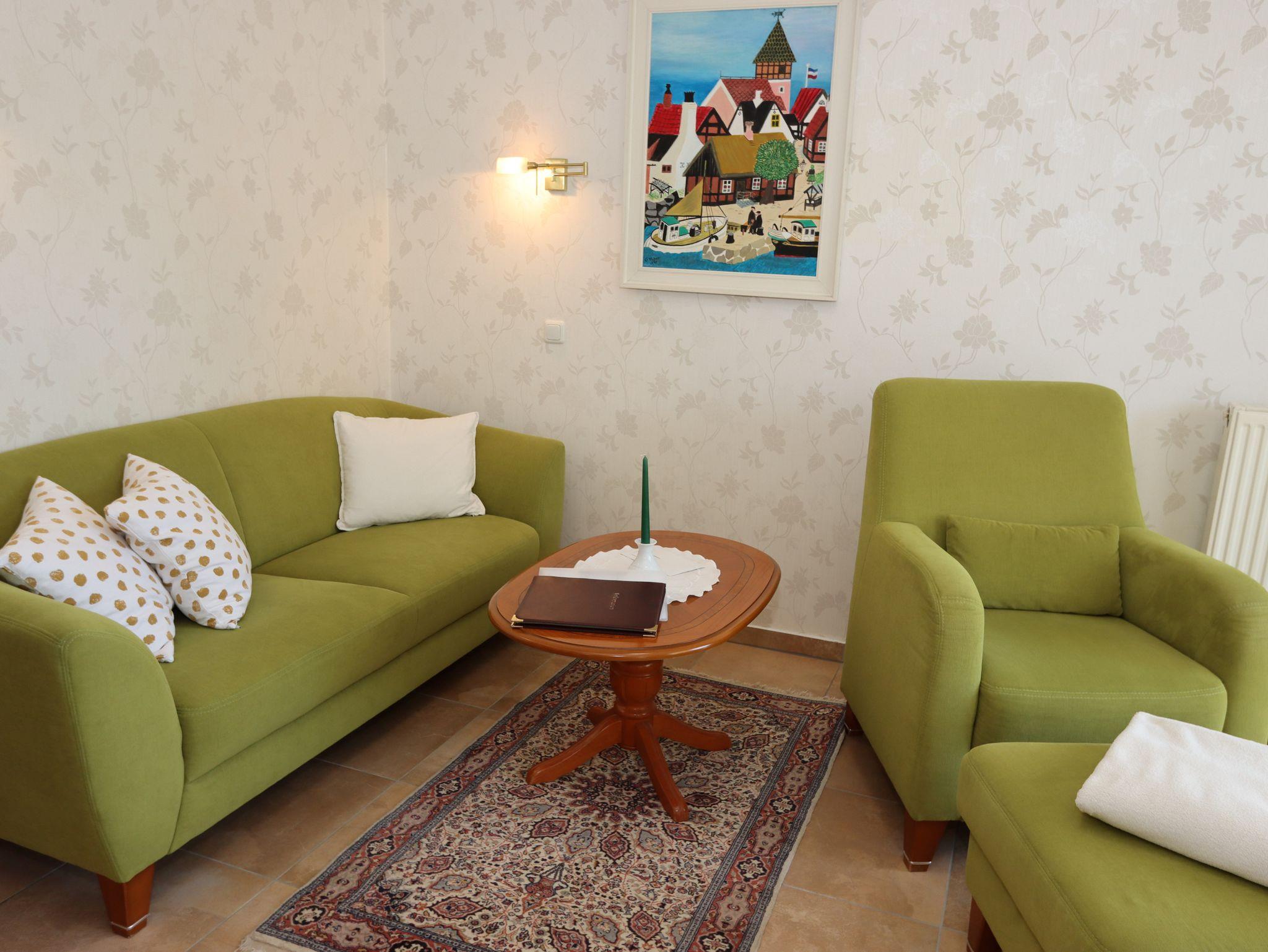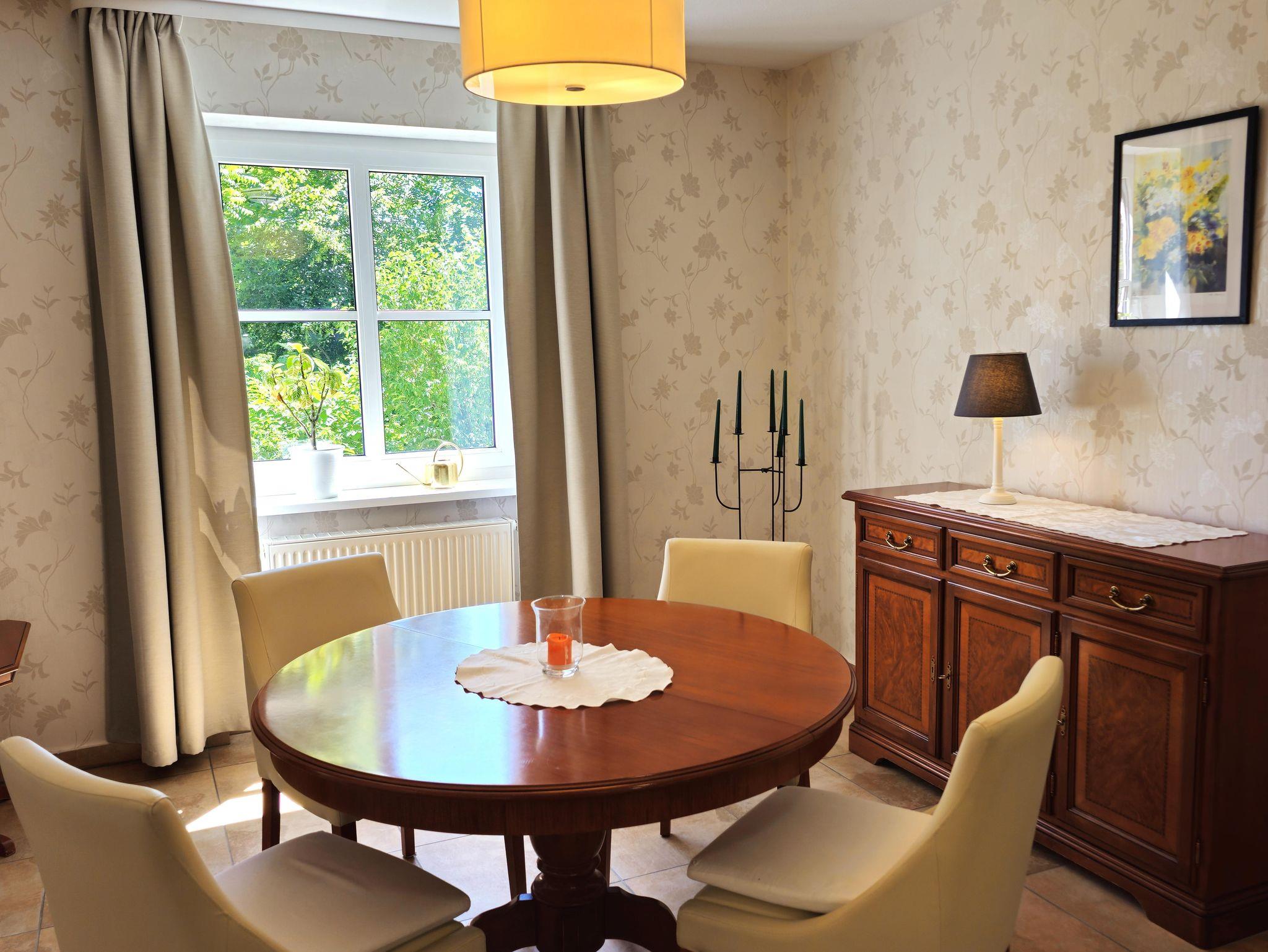 Wir bieten Ihnen eine komfortable Ferienwohnung (ca.60qm) im Hochparterre, mit einem großzügigen Wohnraum und Essplatz, einem Schlafzimmer mit Doppelbett und einem großen Bad mit Fußbodenheizung.