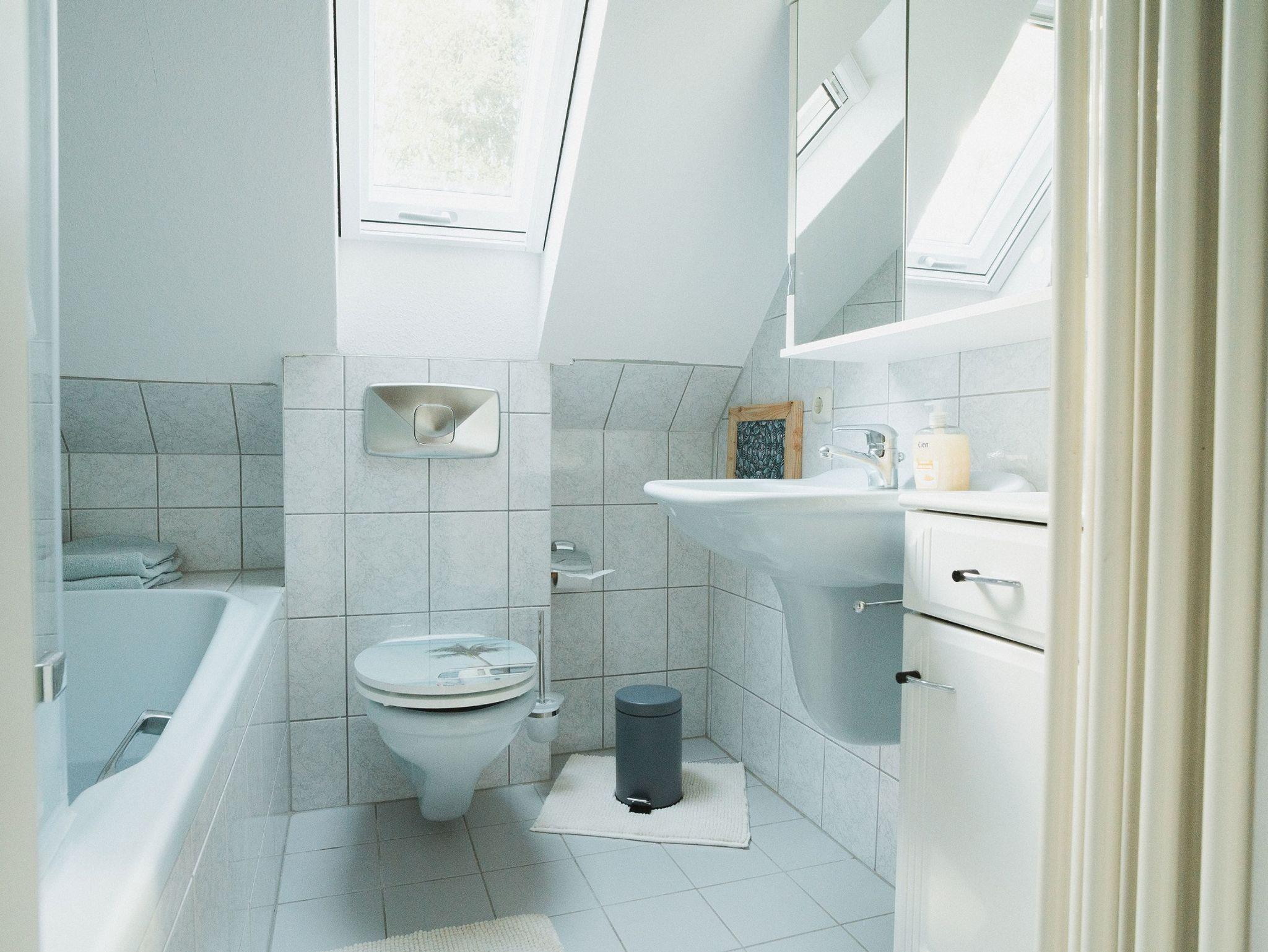 Es ist mit einem WC, einer Badewanne mit Duschfunktion und einem kleinen Waschbecken und einem Spiegelschrank im Landhausstil eingerichtet.