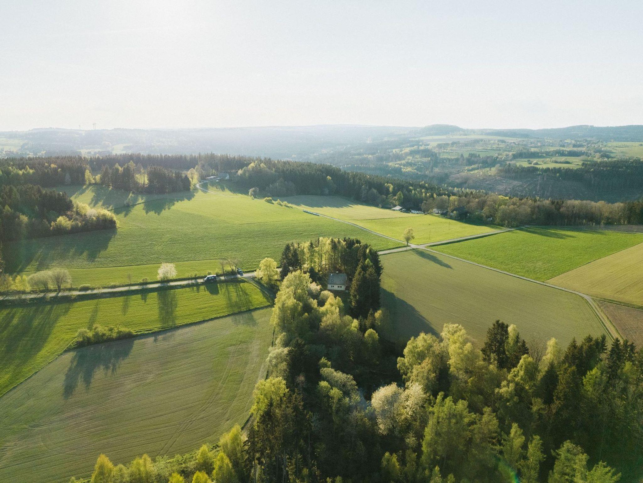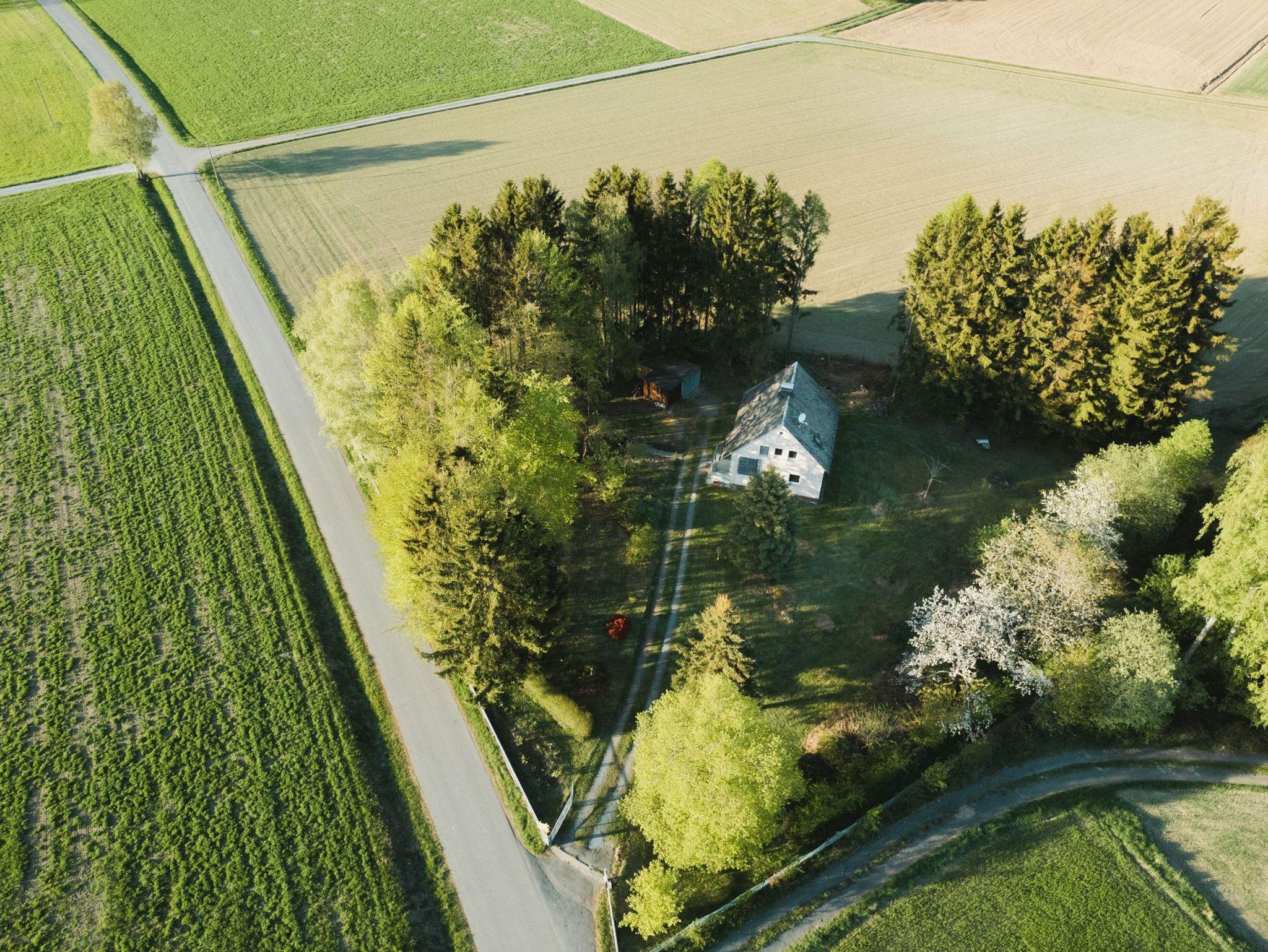 Es ist umgeben von Feldern, Wald und Wiesen.