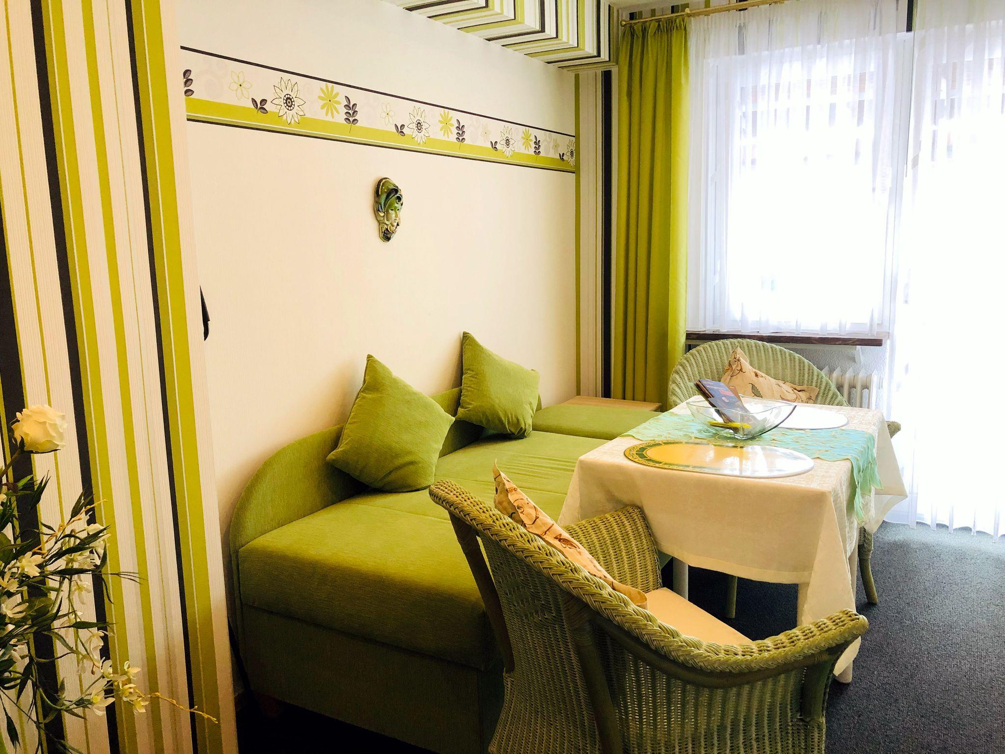 Zum Gästehaus gehören 4 schöne Doppelzimmer, die jeweils auch als Einzelzimmer gebucht werden können. Alle Zimmer verfügen über einen Zugang zu Balkon oder Terrasse und sind zwischen 20 und 25 m² groß. Für alle Gäste steht außerdem eine kleine Teeküche (mit Mikrowelle, Herd und Kühlschrank) zur Mitbenutzung zur Verfügung. Eines der Doppelzimmer verfügt zusätzlich über einen separaten Wohnraum (Bild mit der grünen Couch), von dem aus dann der Balkon zugänglich ist.