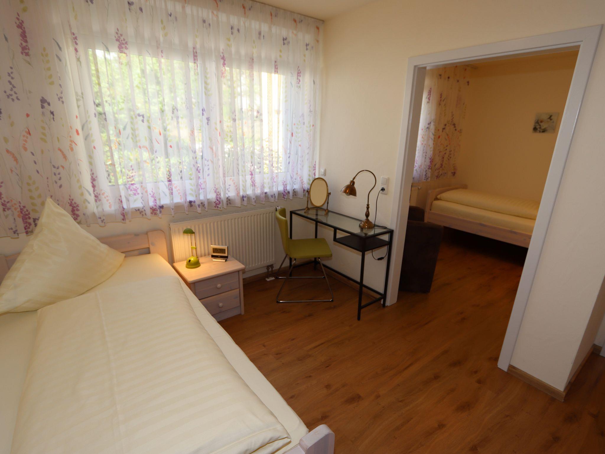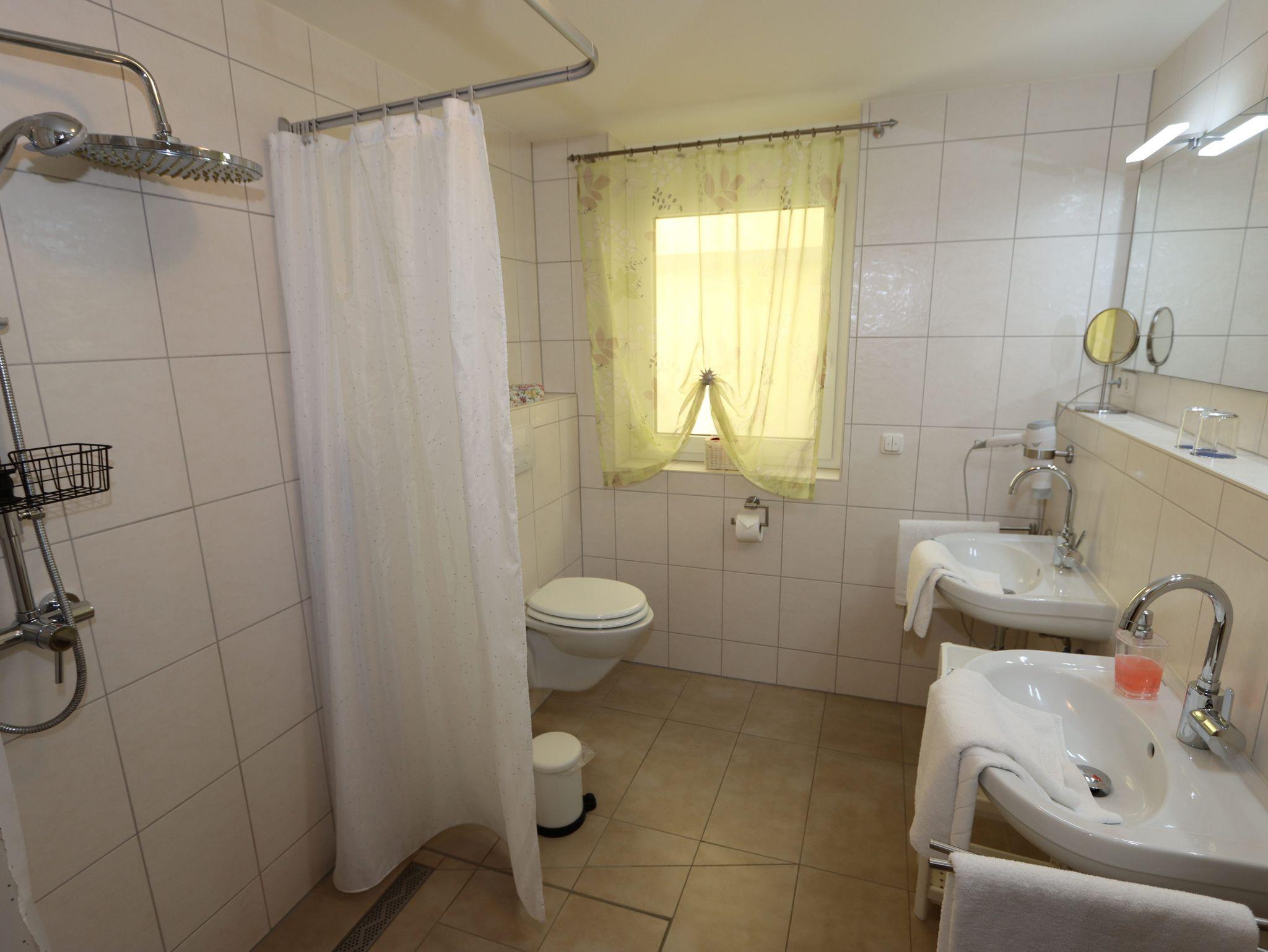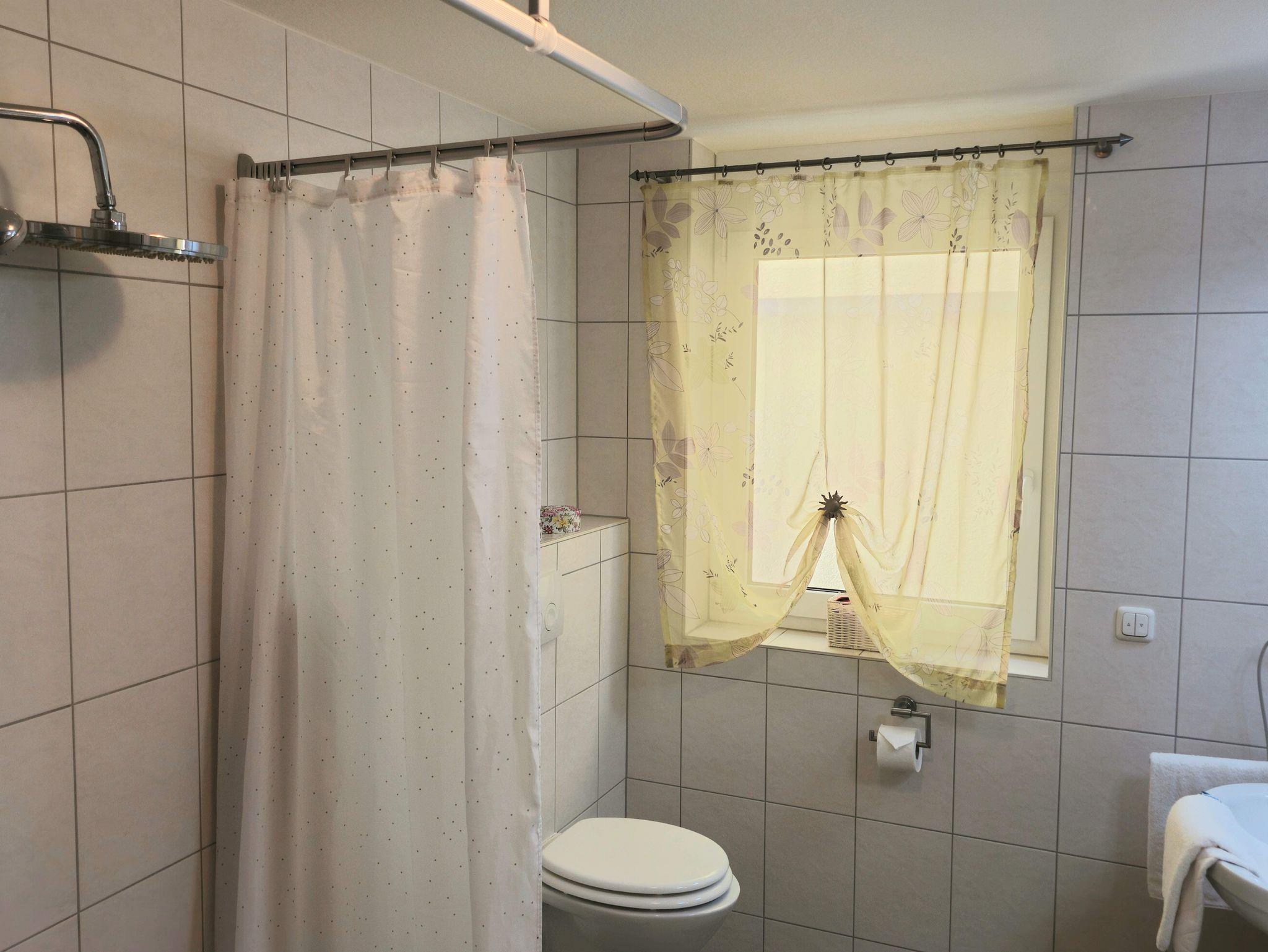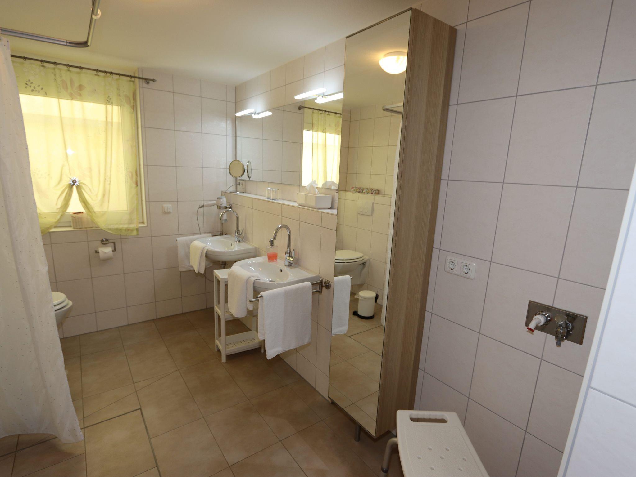 Wir bieten Ihnen eine komfortable Ferienwohnung (ca. 63 qm), mit einem großzügigen Wohnraum mit Essplatz, zwei ineinander übergehenden Schlafzimmern (ein Zimmer ist ein Durchgangszimmer!) und einem großen Bad mit Fußbodenheizung. Das Bad verfügt über eine bodengleiche Dusche, eine großen Kopfdusche mit Handbrause, zwei Waschbecken und großem Badschrank.
