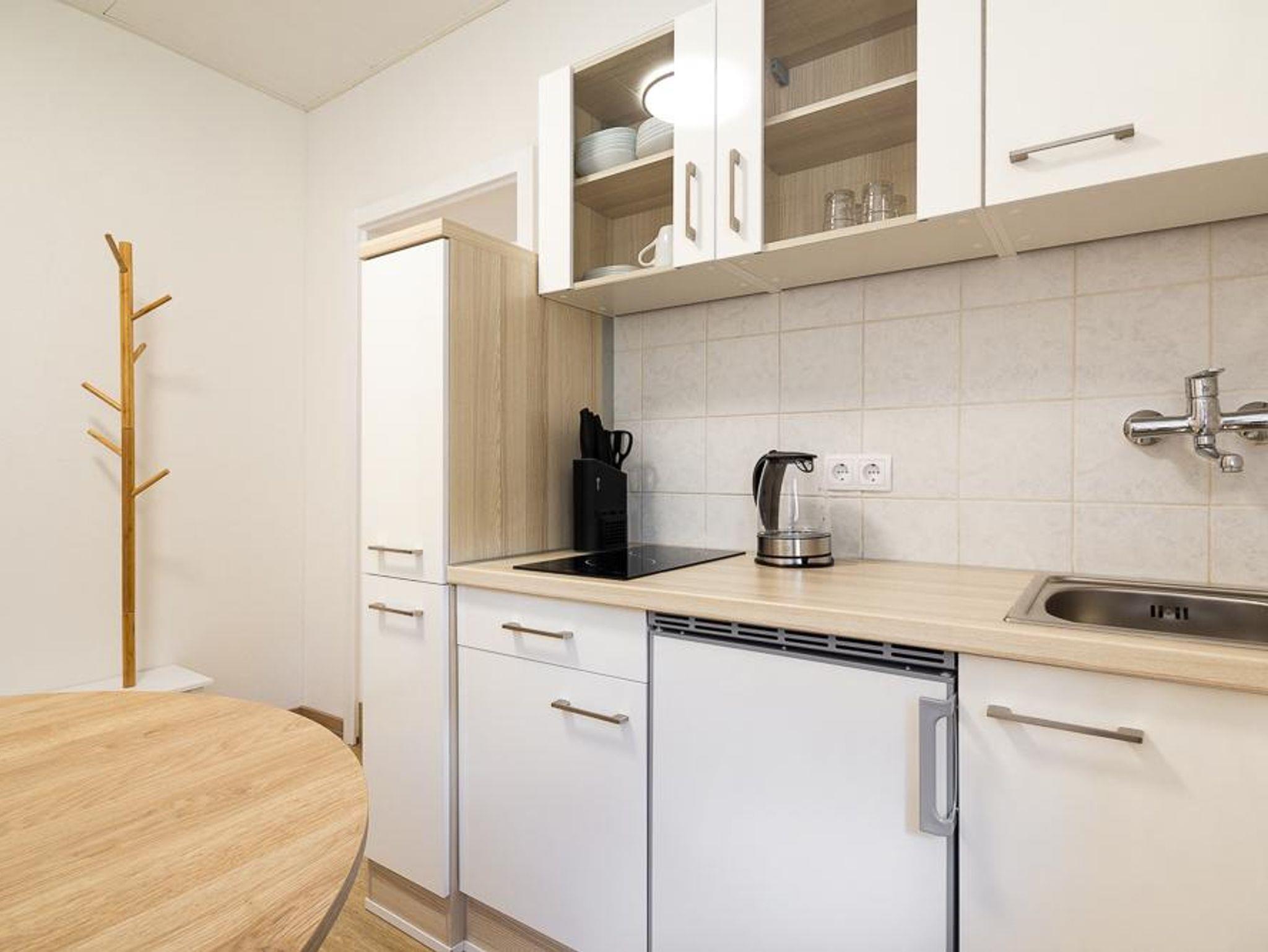 Das Appartement verfügt über eine komplett eingerichtete Wohnküche mit Geschirr, Kaffeemaschine, Wasserkocher, Elektroherd und Küchlschrank mit Gerfrierfach.