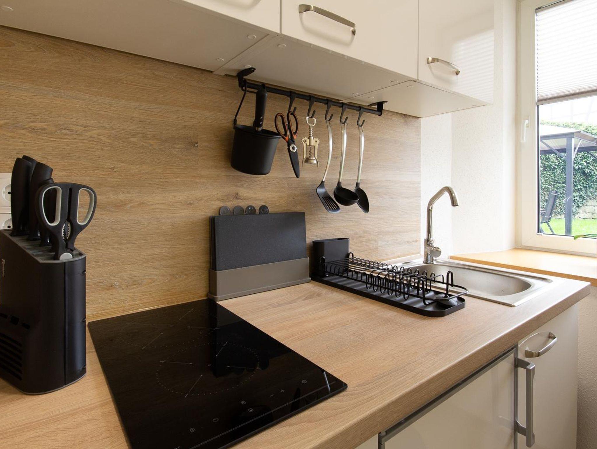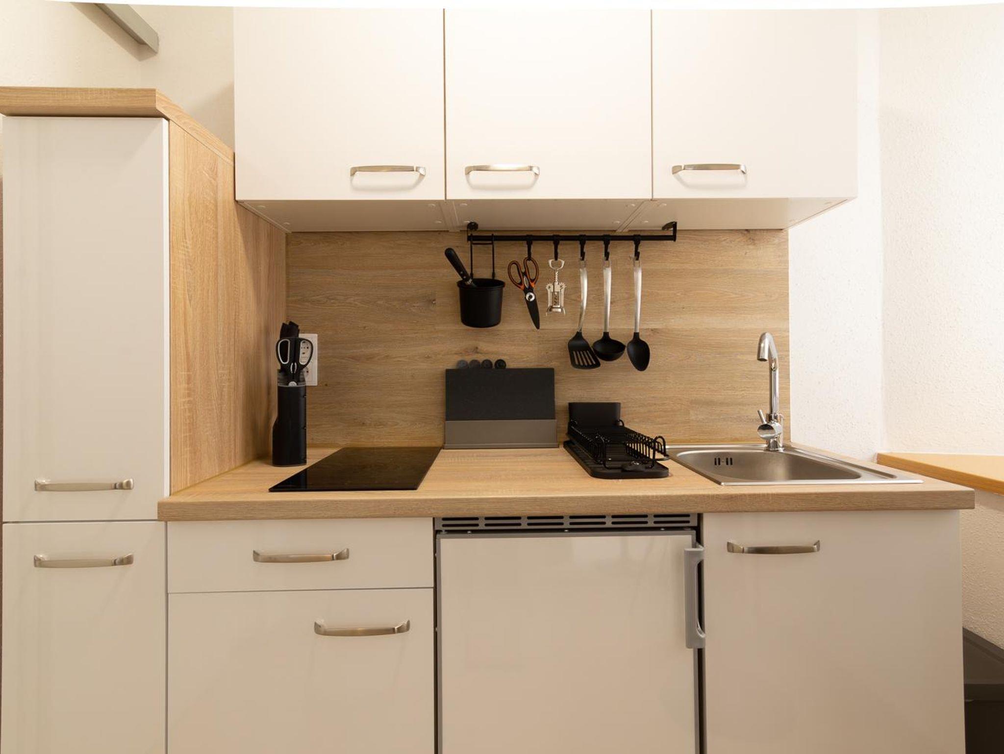 Das Appartement verfügt über eine komplett eingerichtete Wohnküche mit Geschirr, Kaffeemaschine, Wasserkocher, Elektroherd und Küchlschrank mit Gerfrierfach.