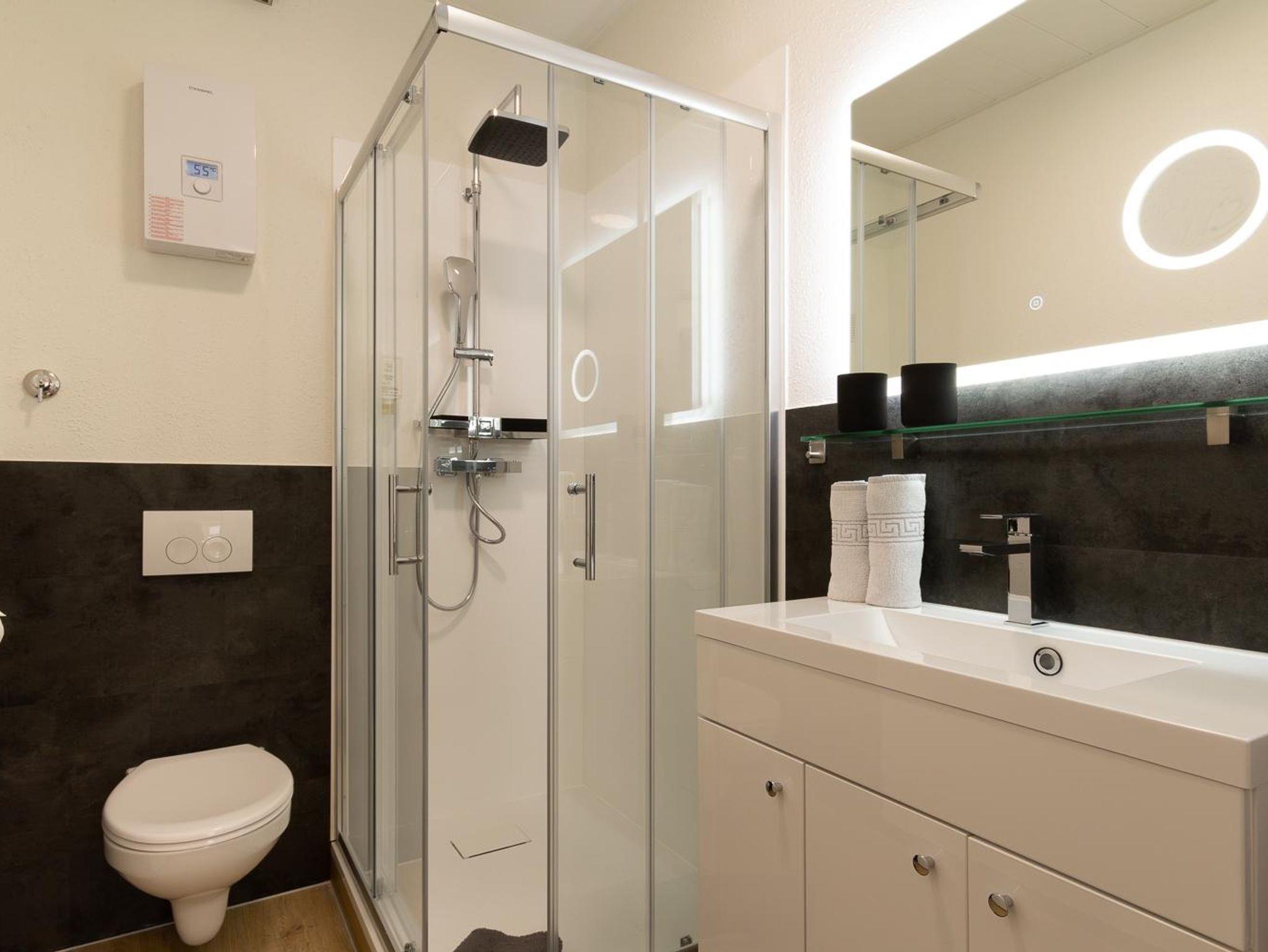 Das Badezimmer ist mit einer Dusche, großzügigem Waschbecken, beleuchtetem Spiegel und Toilette ausgestattet.