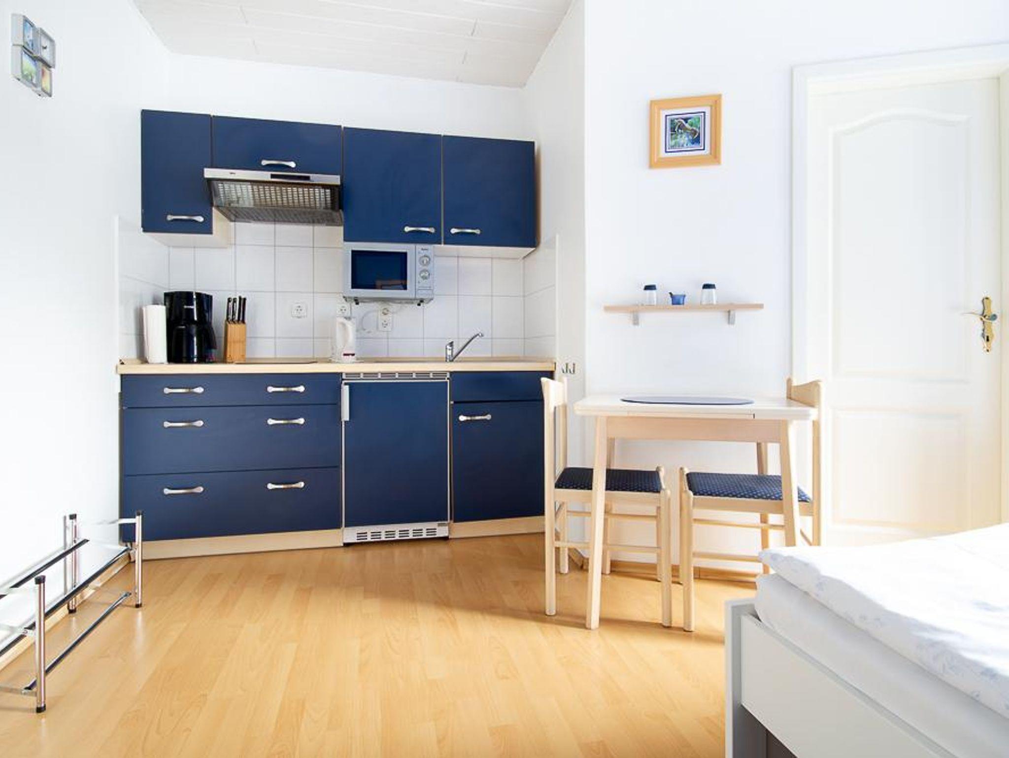 Das Appartement verfügt über eine komplett eingerichtete Wohnküche mit Geschirr, Kaffeemaschine, Wasserkocher, Elektroherd und Küchlschrank mit Gerfrierfach.