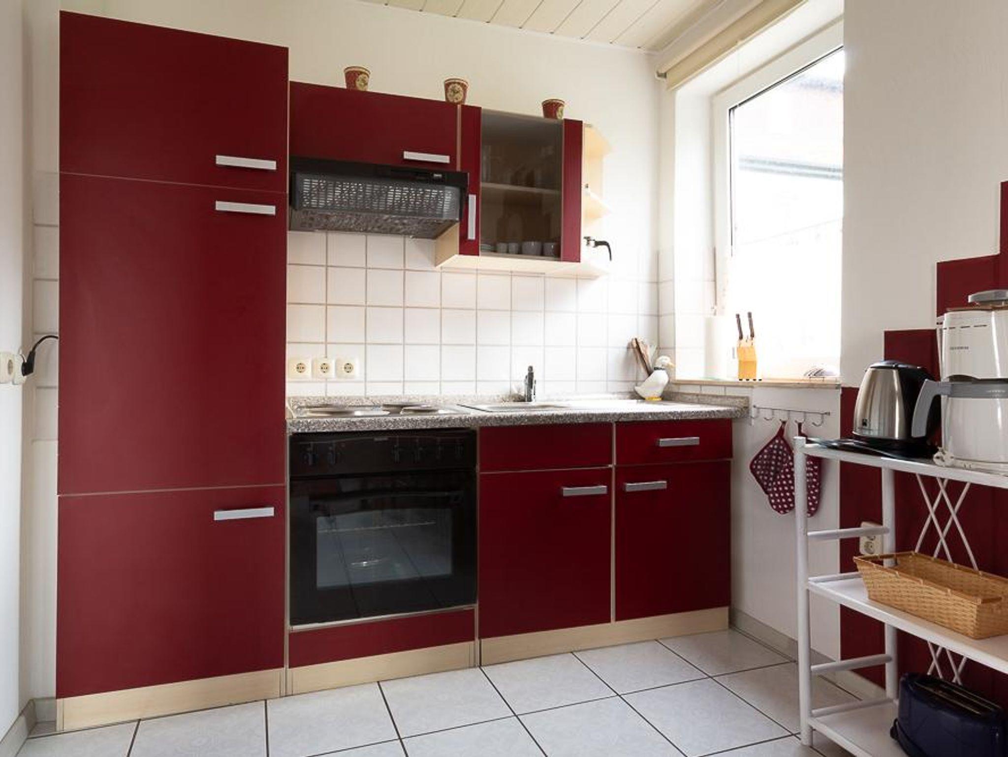 Die Ferienwohnung verfügt über eine komplett eingerichtete Wohnküche mit Geschirr, Kaffeemaschine, Wasserkocher, Elektroherd und Küchlschrank mit Gerfrierfach.