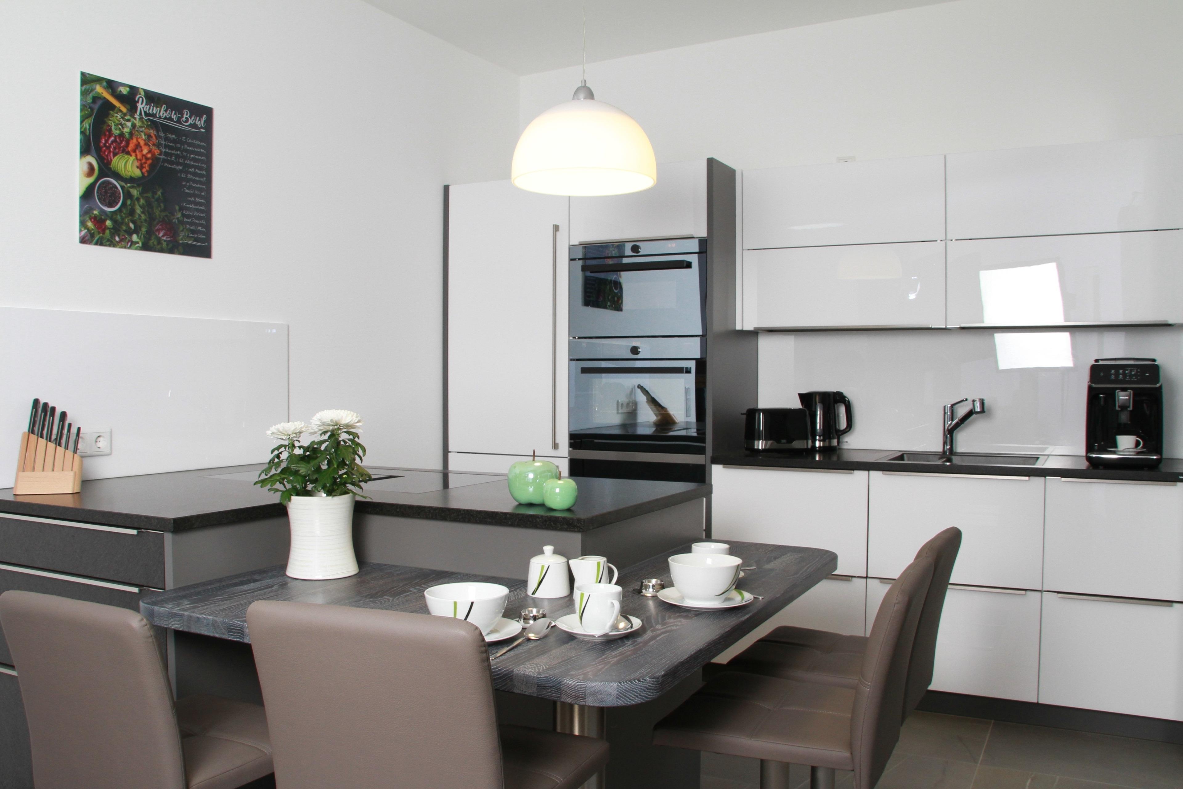 Direkt neben der Bad Tabarzer Kneipp-Kuranlage befindet sich in Baumkronenhöhe unsere hochwertig ausgestattete, klimatisierte Loft- Ferienwohnung mit einer Wohnfläche von 89 m² für 2 - 4 Personen. Autostellplätze unter dem Carport sind vorhanden. Mit einem Aufzug erreichen auch gehbehinderte Personen mühelos die Wohnung. Ein Schlafzimmer bietet Platz für 2 Erwachsene. Eine Aufbettung für 2 Personen sowie ein Kinderreisebett können bei Bedarf bereitgestellt werden. Zwei Bäder mit großzügiger Beleuchtung und Kosmetikspiegel, eines mit Badewanne und eines mit Dusche sind vorhanden. Die Wohnung bietet außerdem eine möblierte 112 m² große Dachterrasse mit Blick auf die Kneipp-Kuranlage und umliegende Wanderwege. Die hochwertige Küche ist mit Backofen, Tellerwärmer, Mikrowelle, Herd, Kühl-Gefrierkombi, Kaffeevollautomat, Wasserkocher, Toaster, Kochgeschirr, Essgeschirr, Besteck und mit Gläsern ausgestattet. Auf der gemütlichen Couch können Filme auf einem 66 Zoll TV-Gerät geschaut werden.
