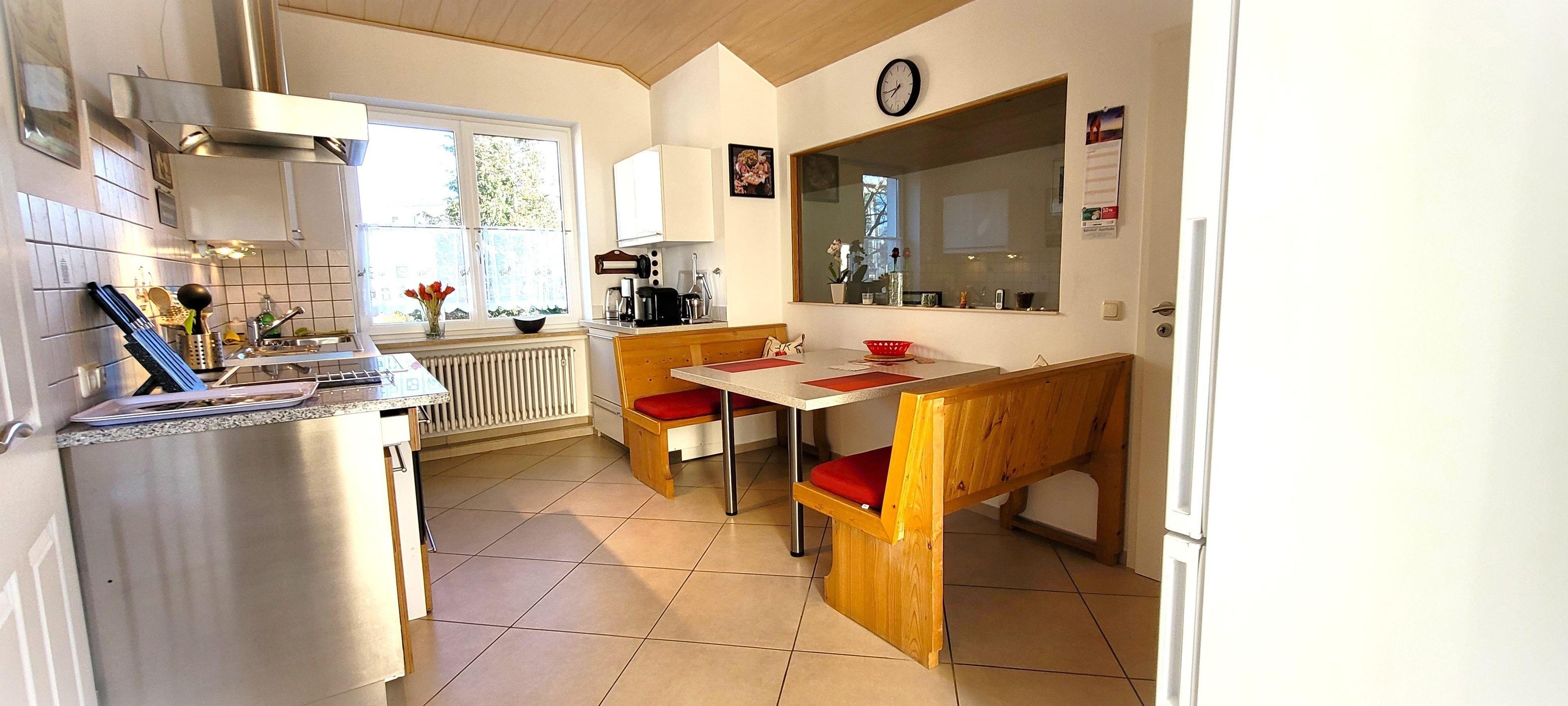 die Küche ist voll ausgestattet, mit Essecke und Zugang zum Balkon: