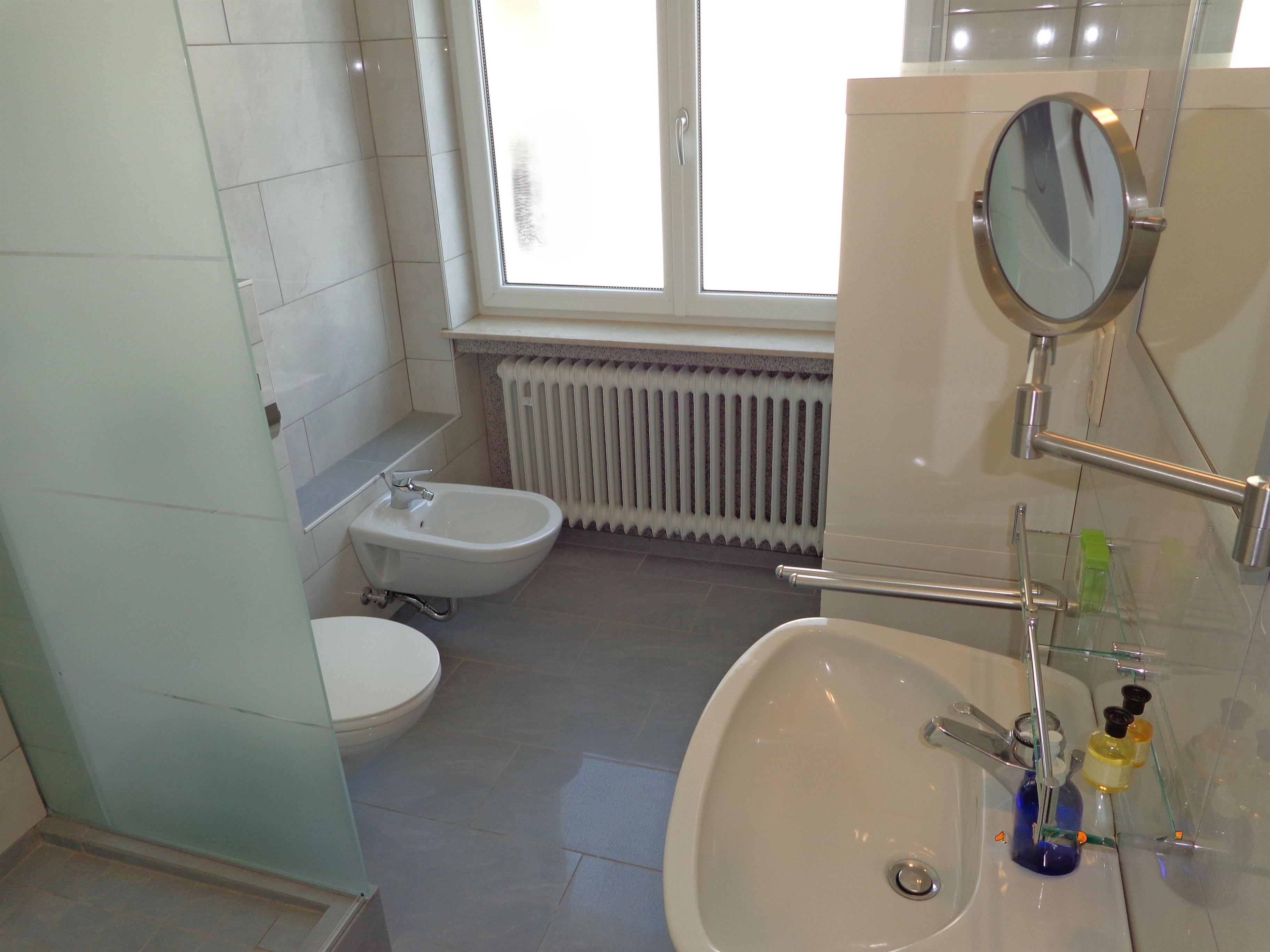 1helles Duschbad mit WC, Bidet, Handwaschbecken,